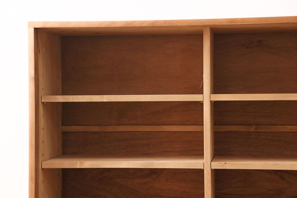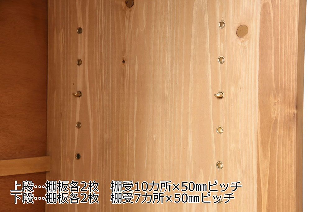 棚板は取り外しできます。棚板は上段各2枚、下段各1枚あります。棚受けは上段10ヶ所、下段7ヶ所、各50mmピッチで調整できます。棚幅サイズのものが1枚の作りです。