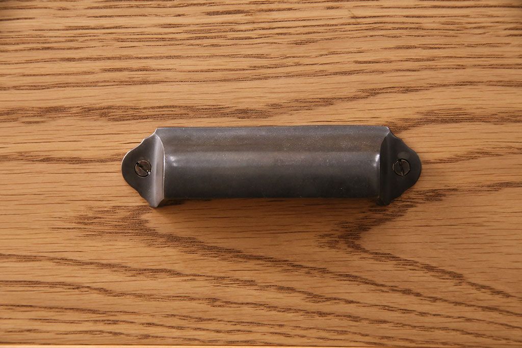 フルオーダー家具実績 > 食器棚を新規製作!建具は上段に気泡ガラスを組み入れ、下段は板戸で製作。棚板は可動式、引き出し金具は黒染めのかぶせ金具を取り付け。ワックス仕上げ。(収納棚、戸棚、キャビネット)
