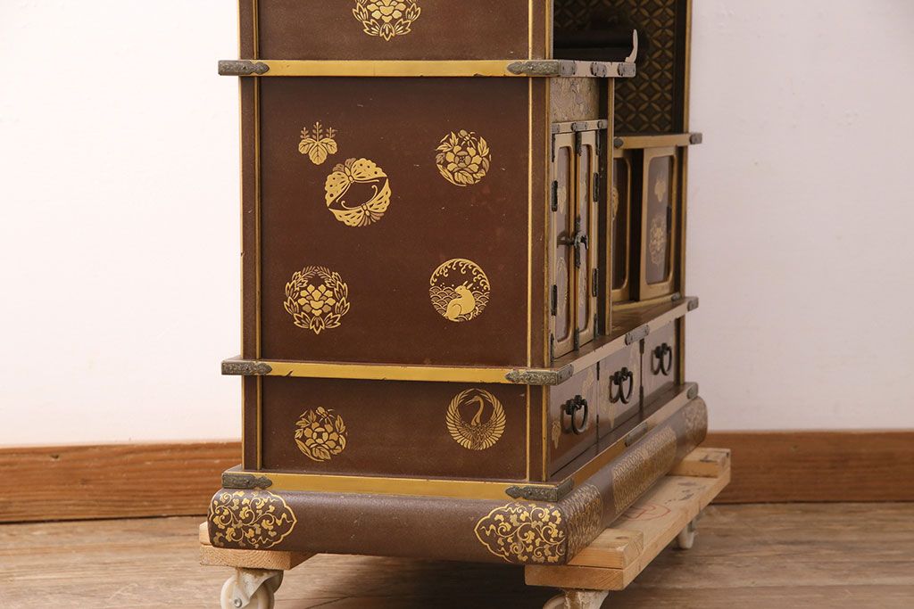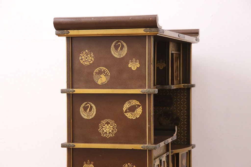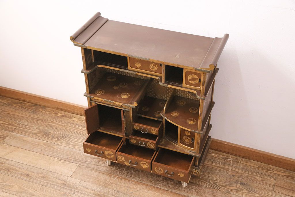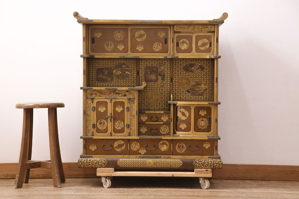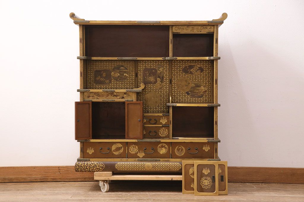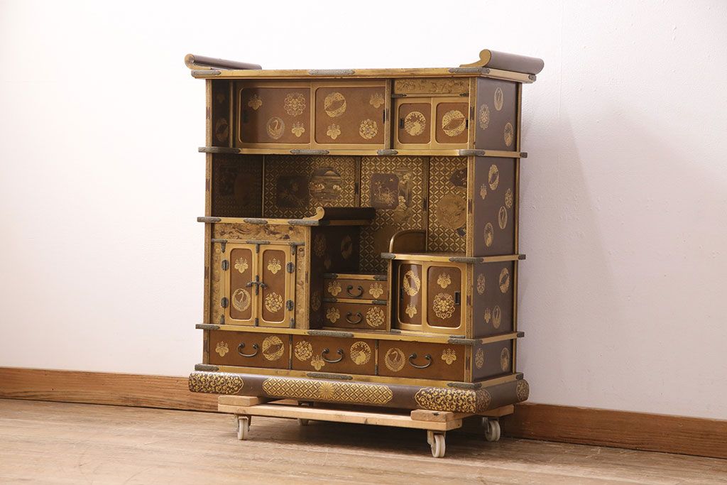 和製アンティーク 時代物 美術品 素晴らしい高蒔絵が目を引く梨地飾り棚(茶棚、収納棚)(R-050585)です。