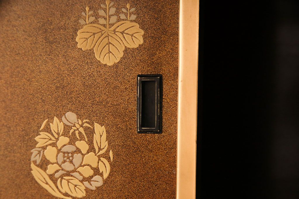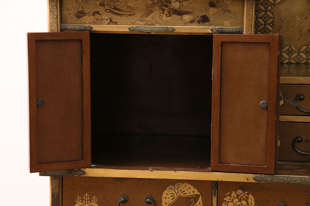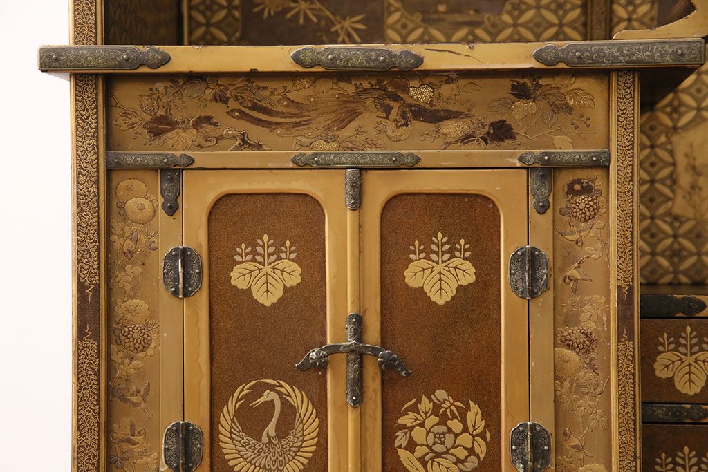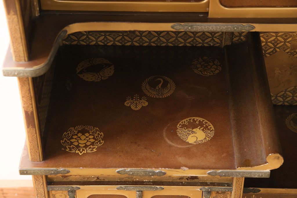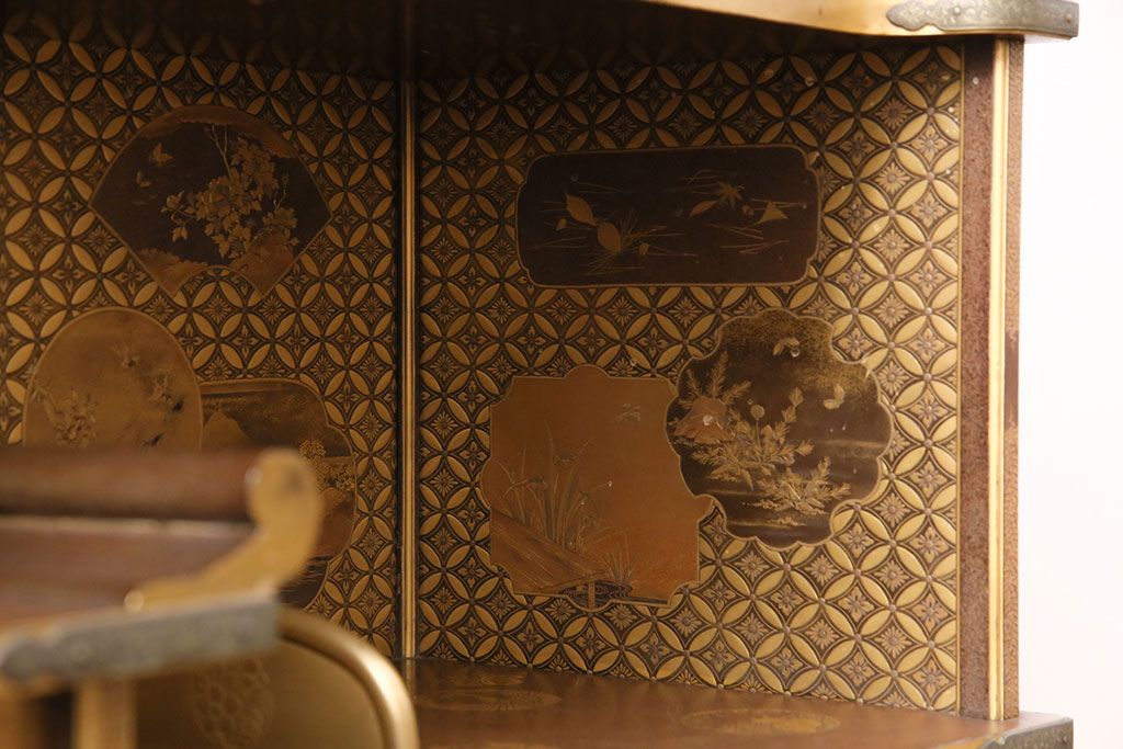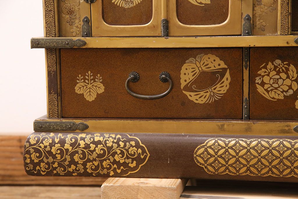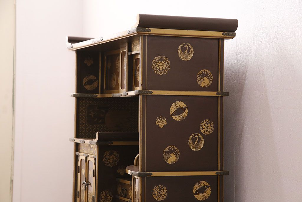 和製アンティーク 時代物 美術品 素晴らしい高蒔絵が目を引く梨地飾り棚(茶棚、収納棚)(R-050585)です。