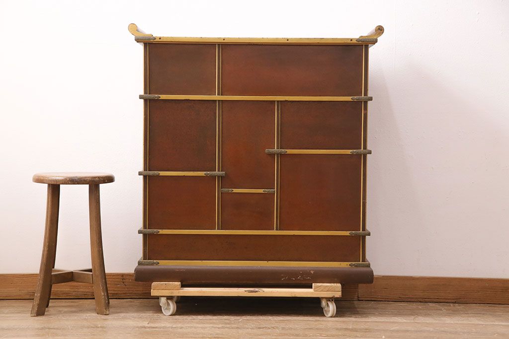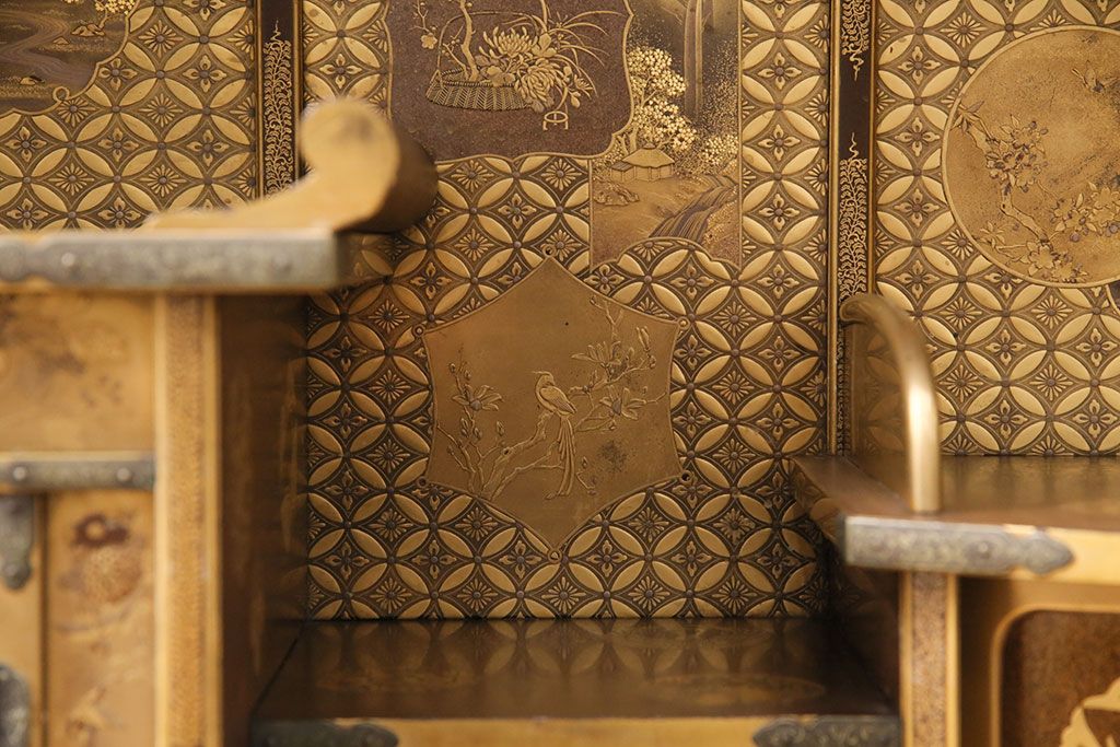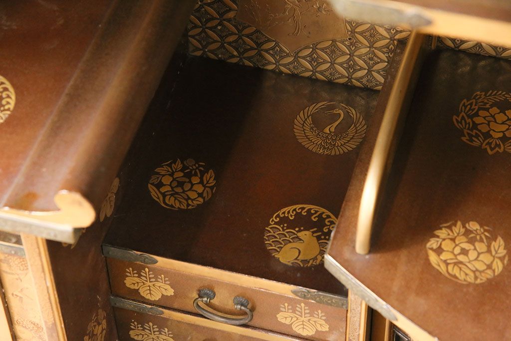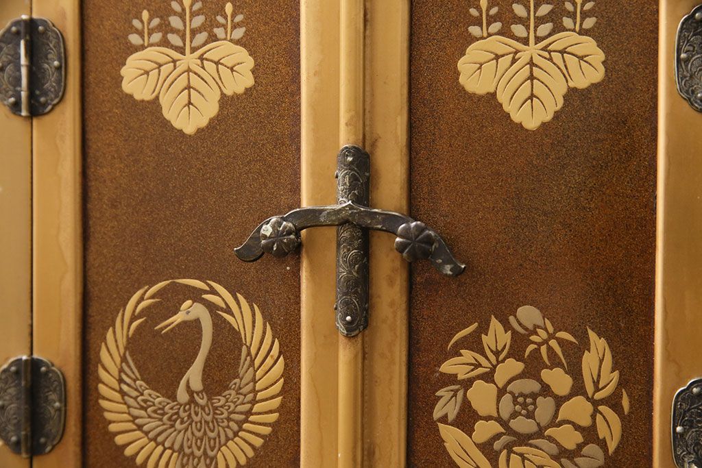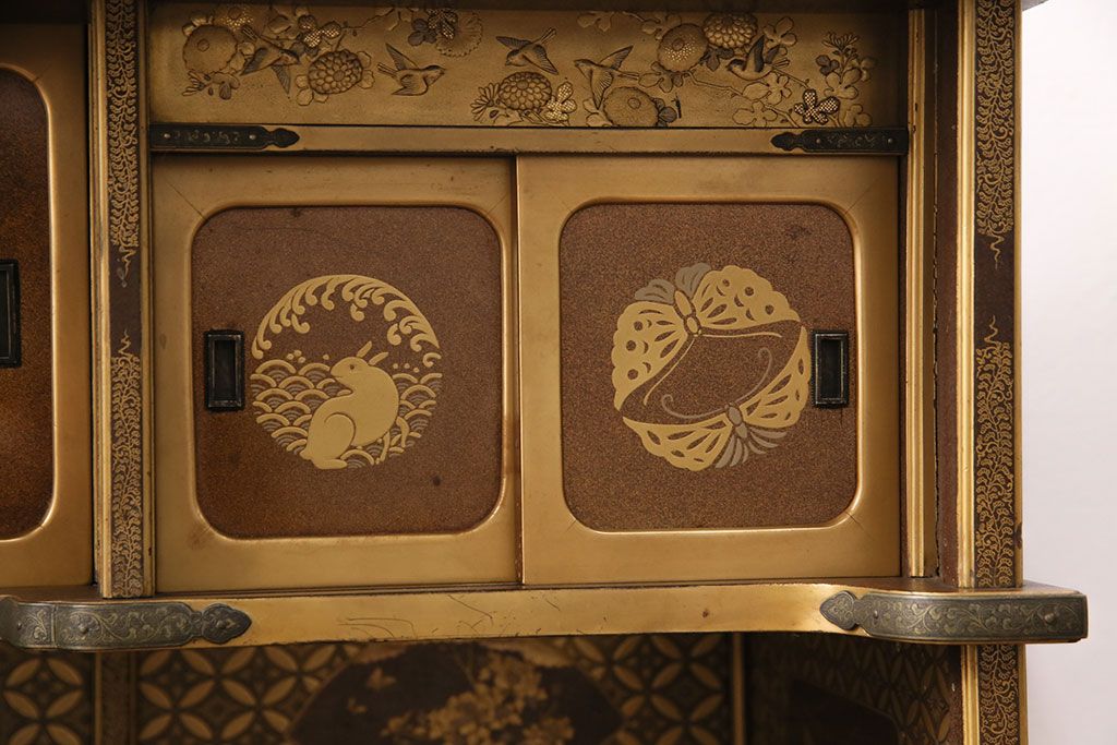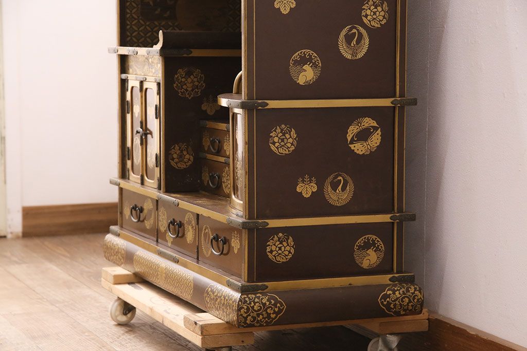 和製アンティーク 時代物 美術品 素晴らしい高蒔絵が目を引く梨地飾り棚(茶棚、収納棚)(R-050585)です。