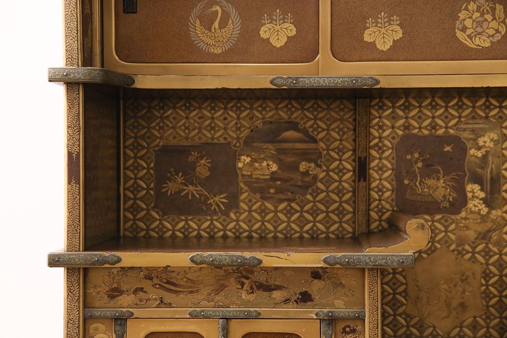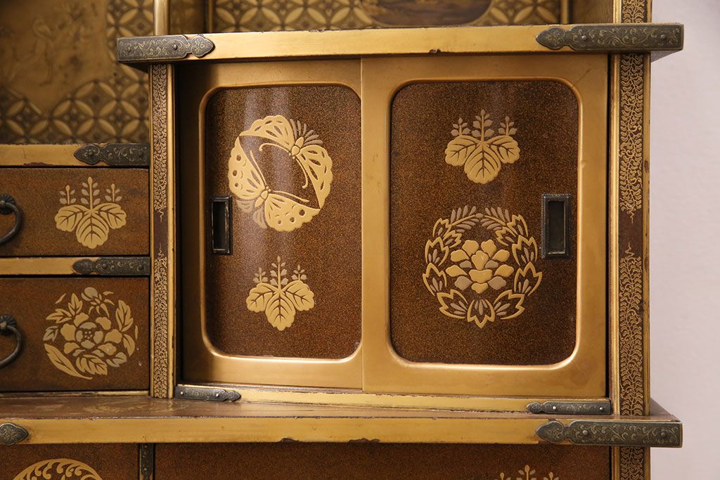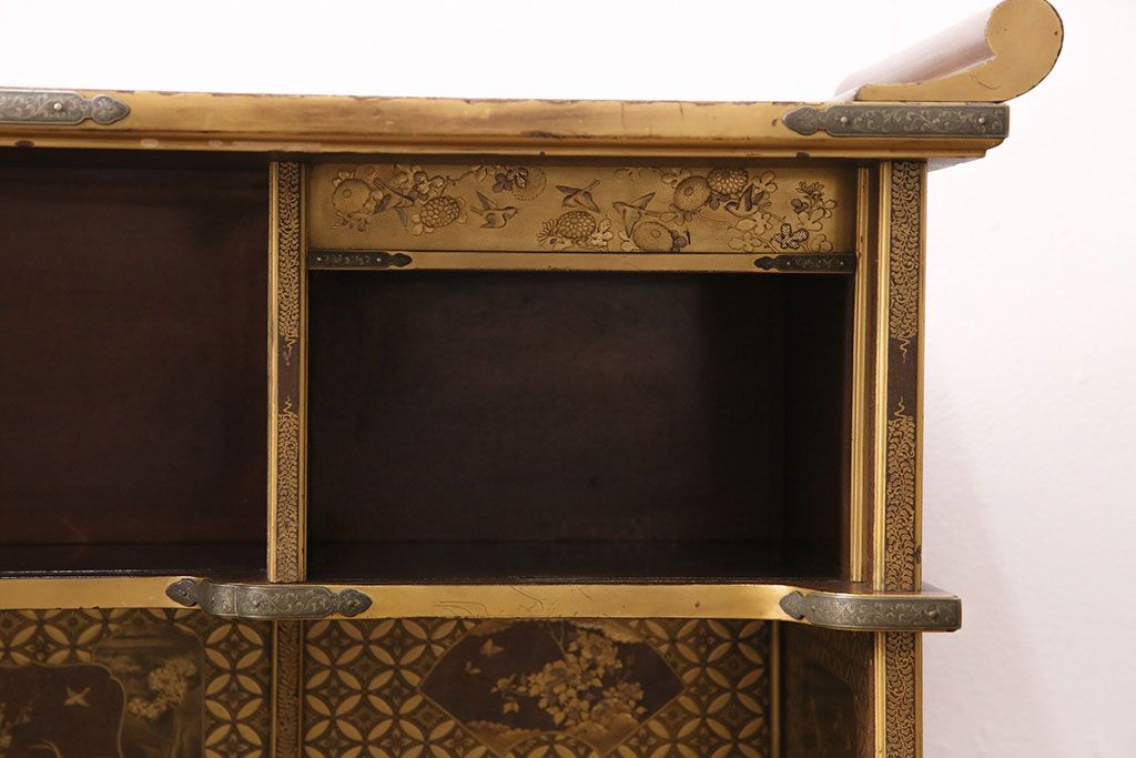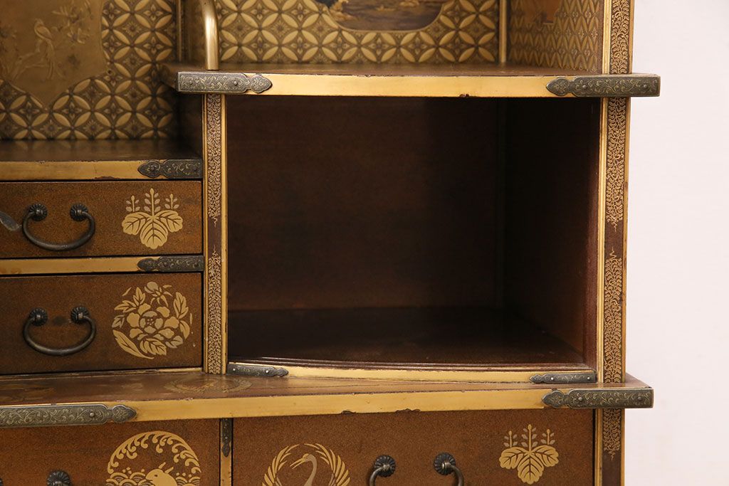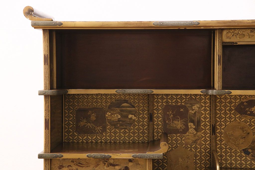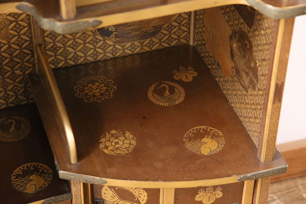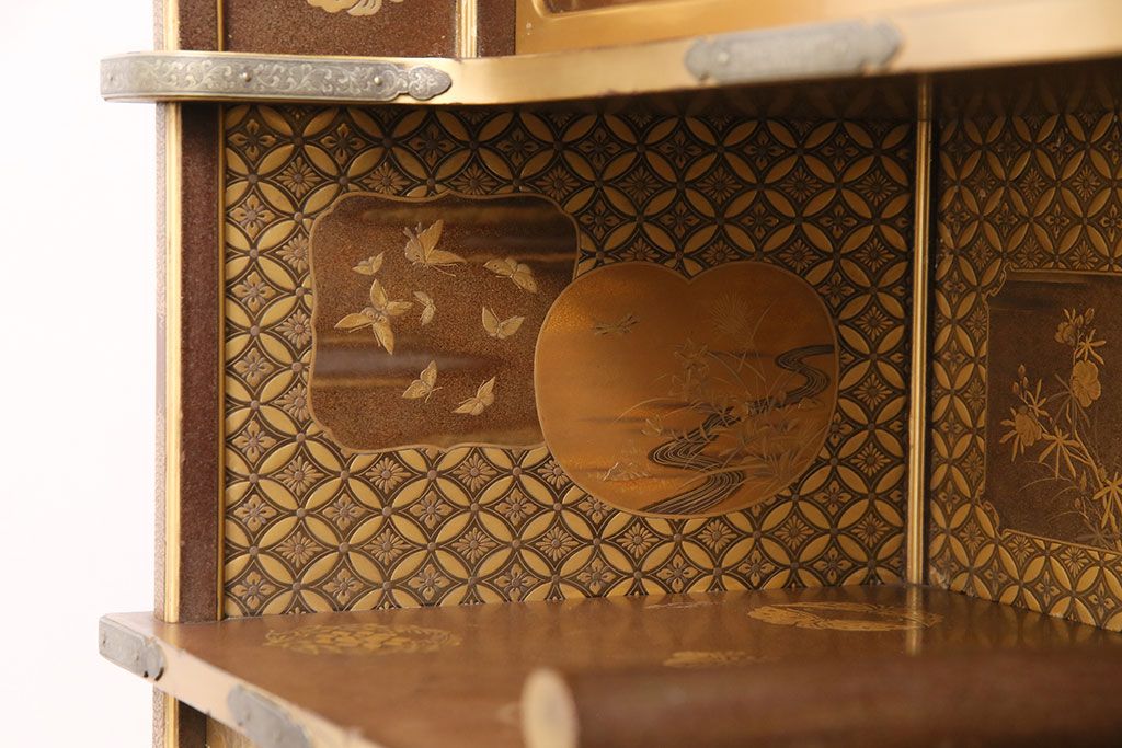 和製アンティーク 時代物 美術品 素晴らしい高蒔絵が目を引く梨地飾り棚(茶棚、収納棚)(R-050585)