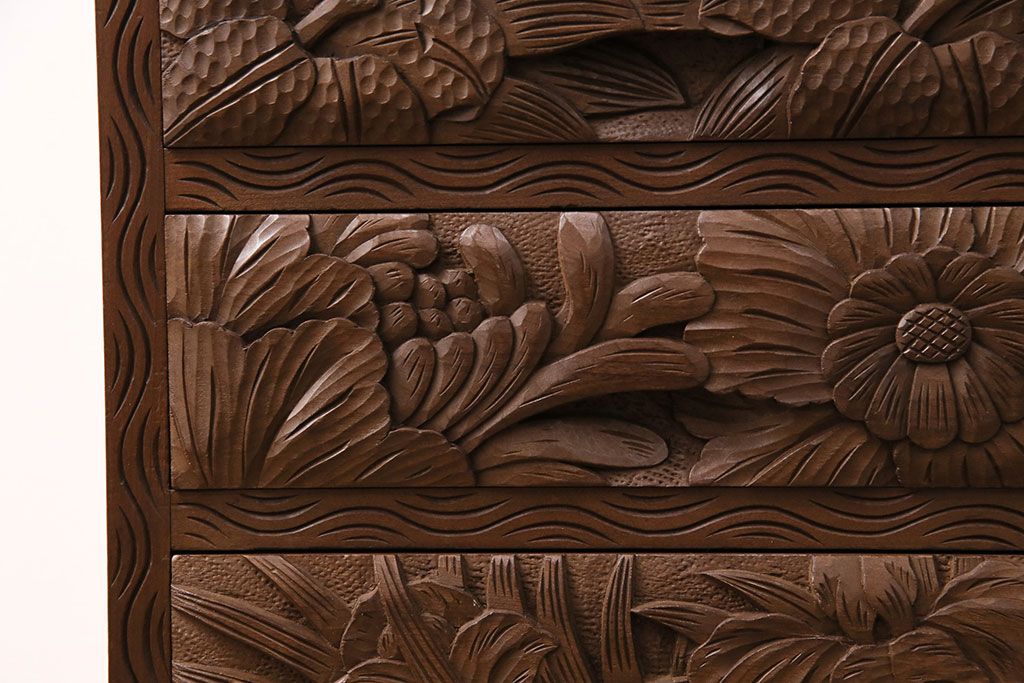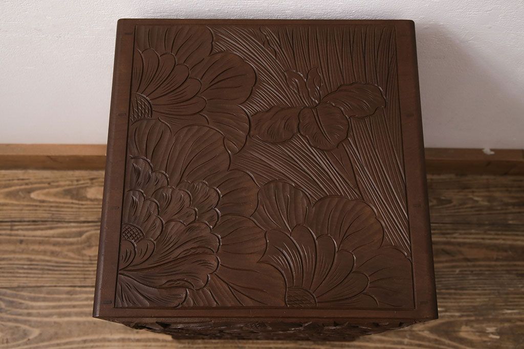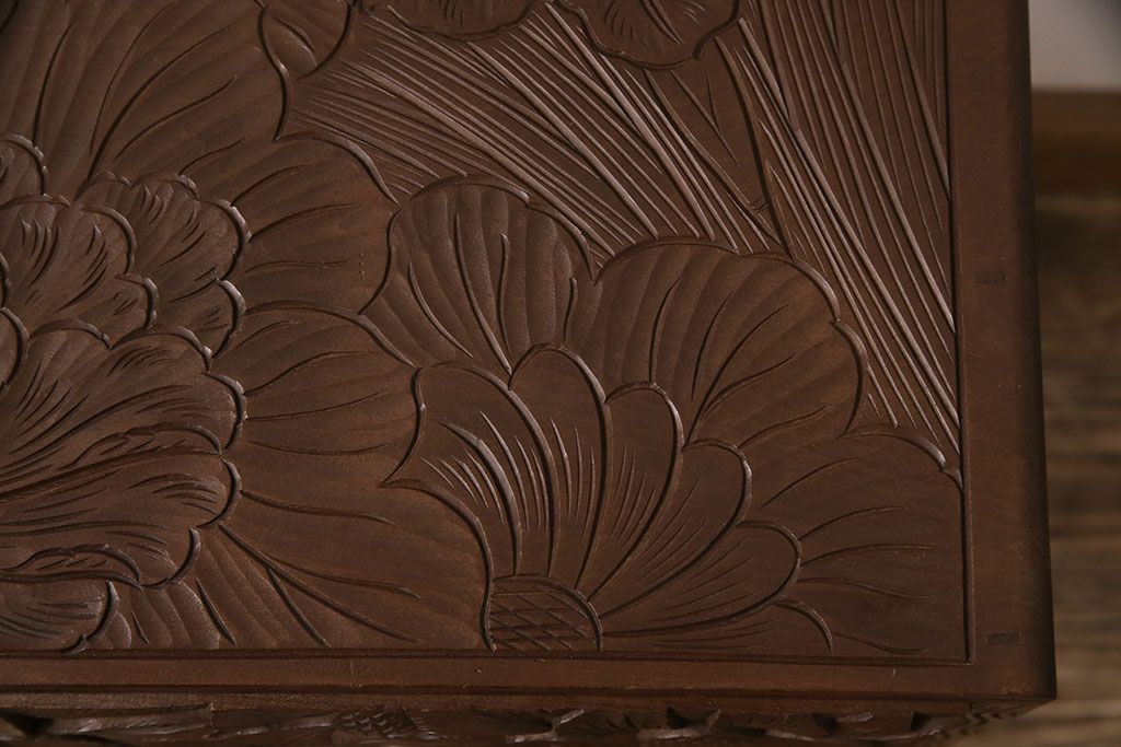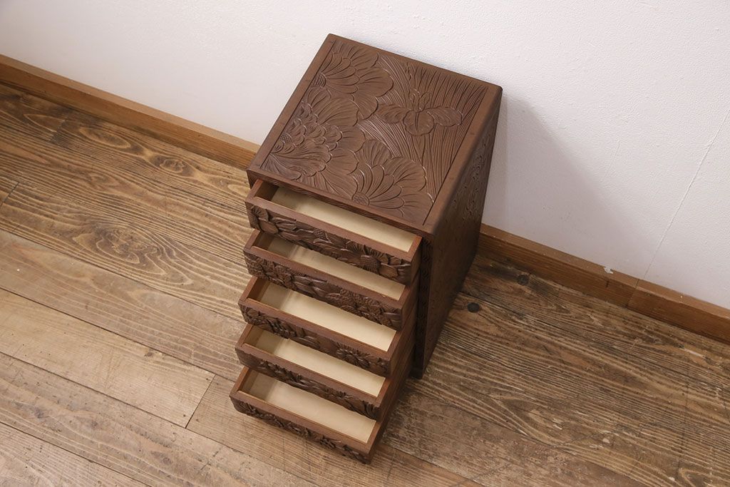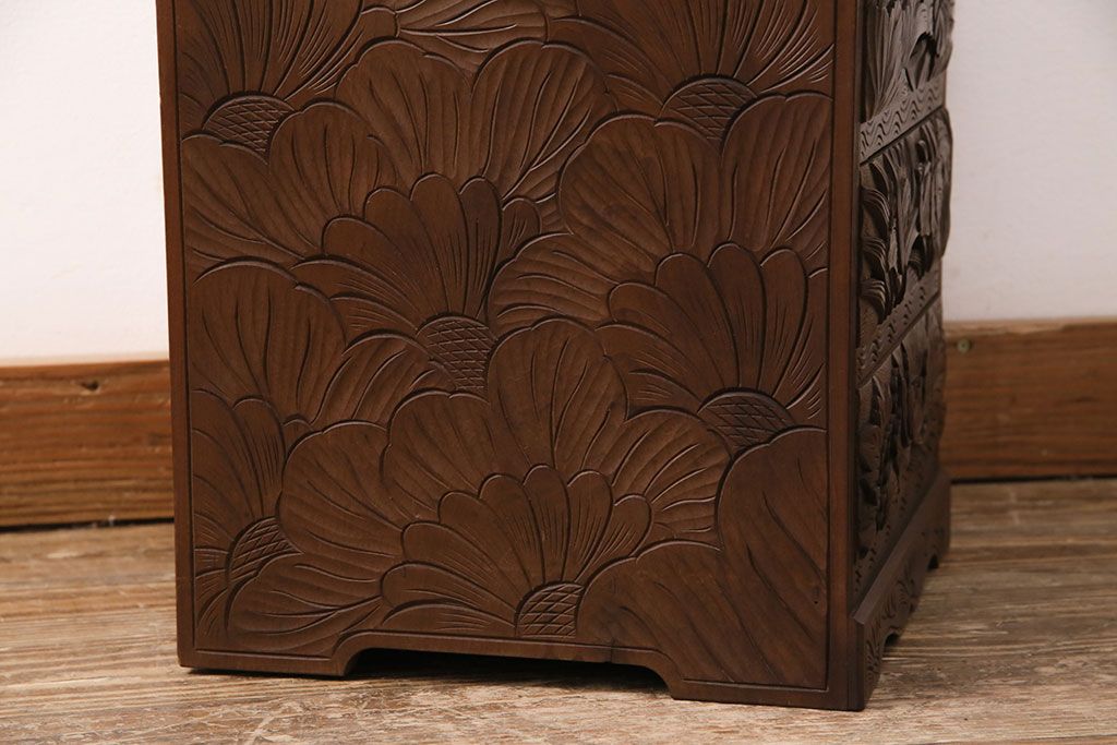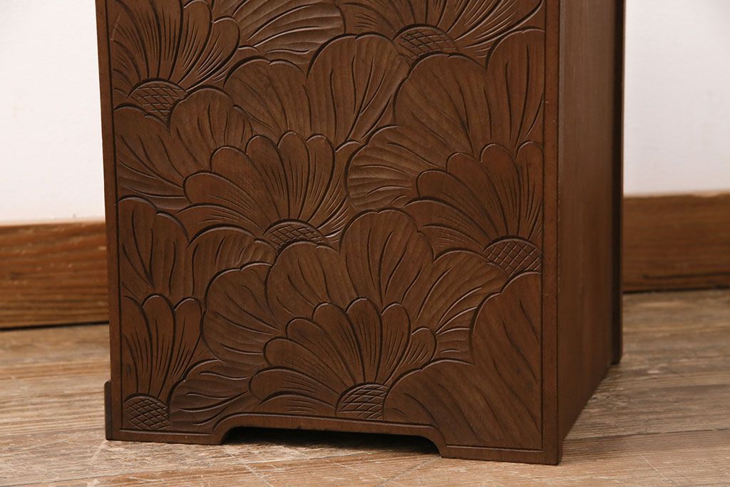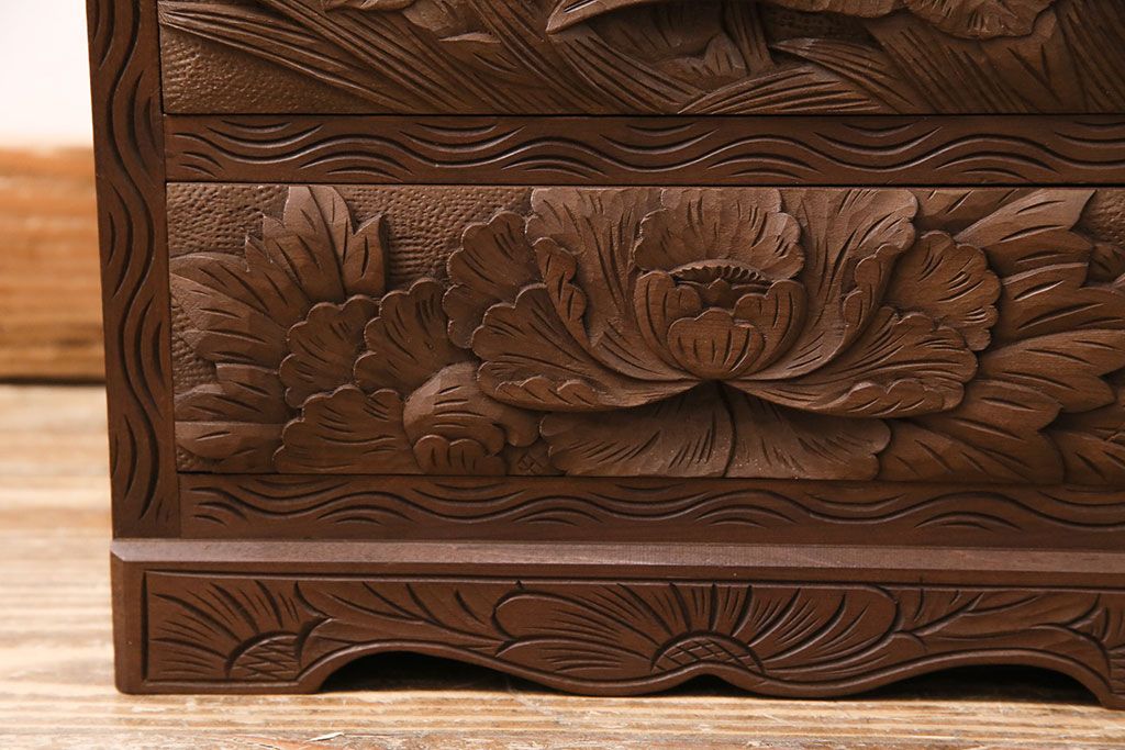 中古 伝統工芸 日光彫り 華やかな花の意匠が目を惹く小引き出し(小物収納、卓上収納)(R-050619)