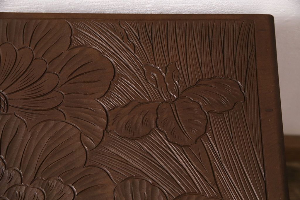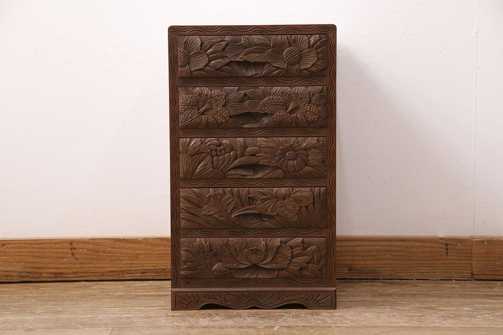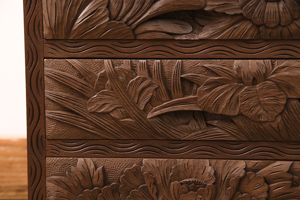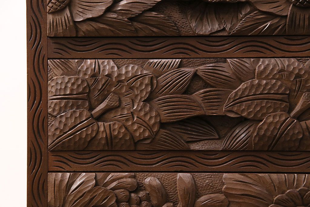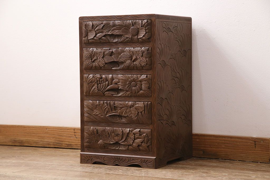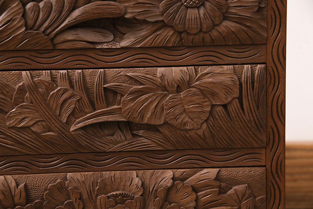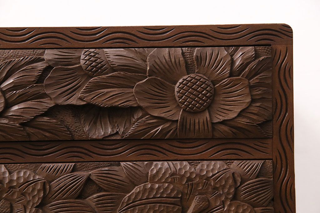 中古 伝統工芸 日光彫り 華やかな花の意匠が目を惹く小引き出し(小物収納、卓上収納)(R-050619)