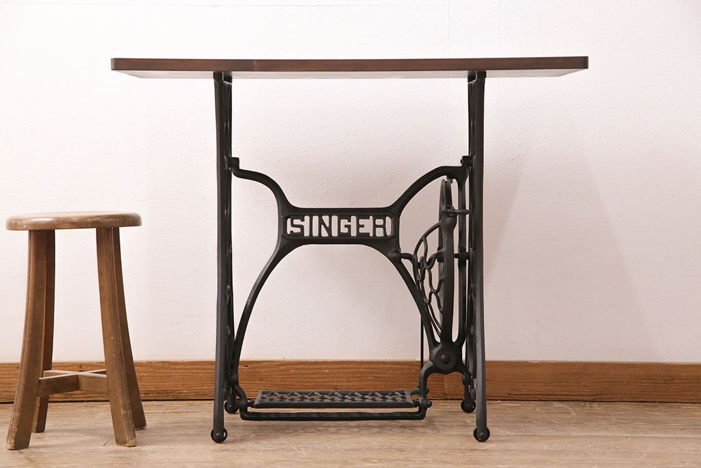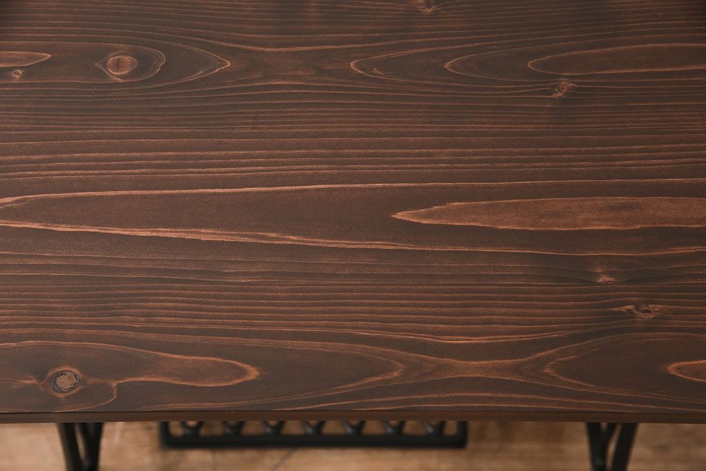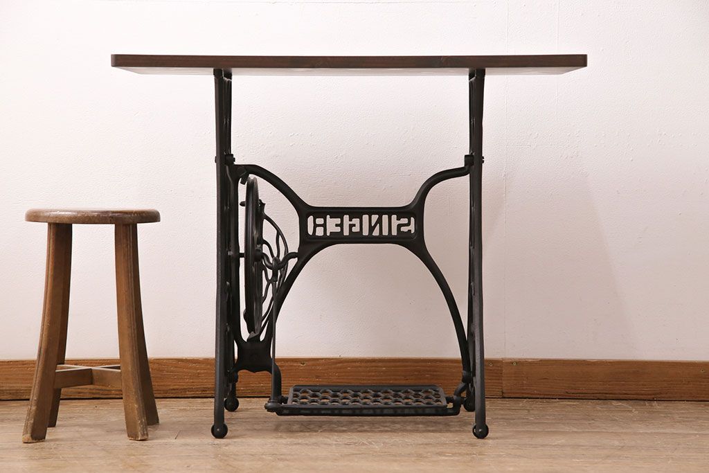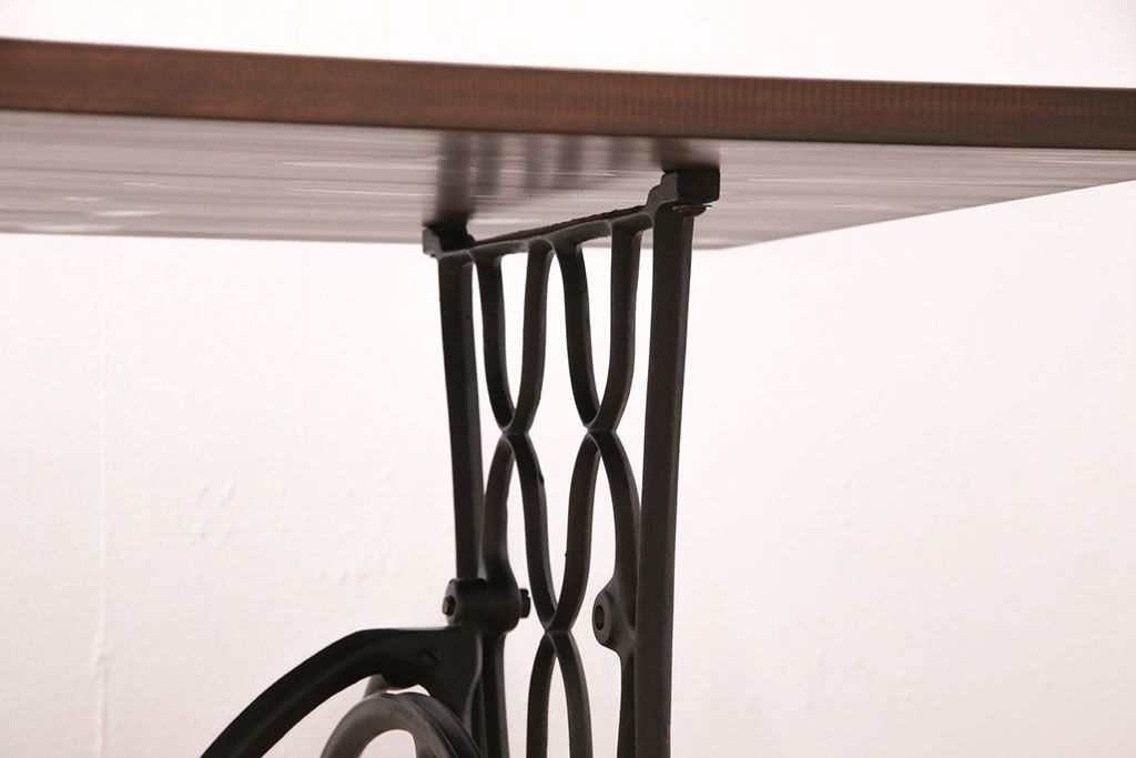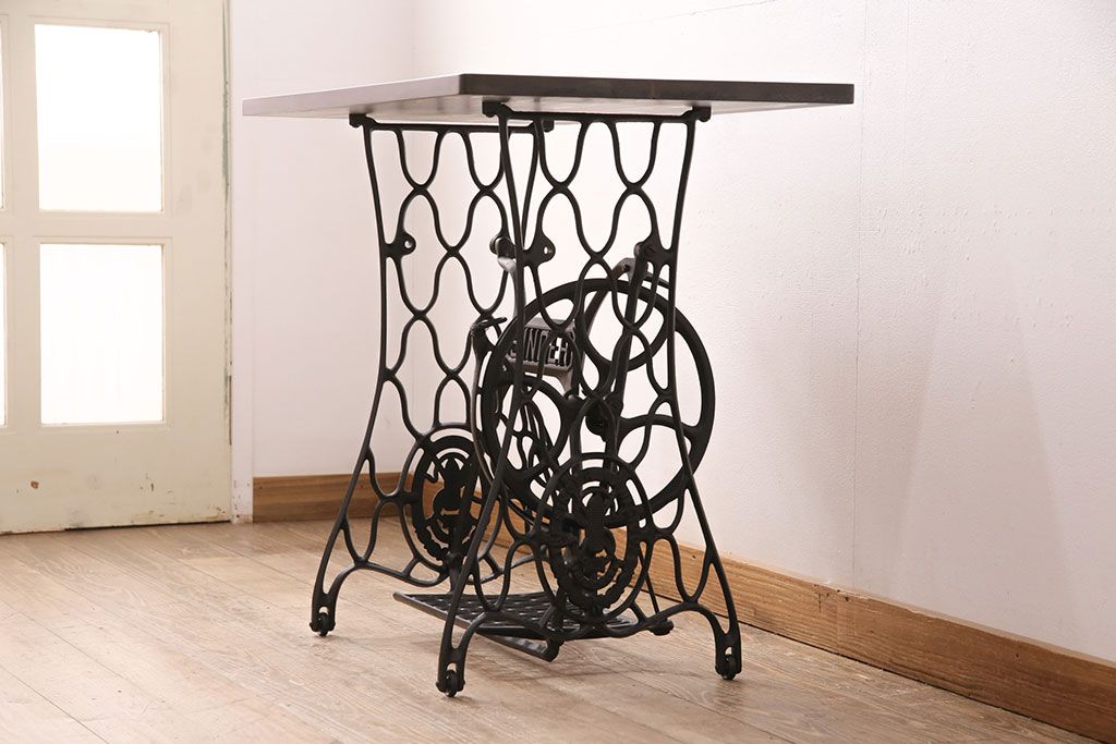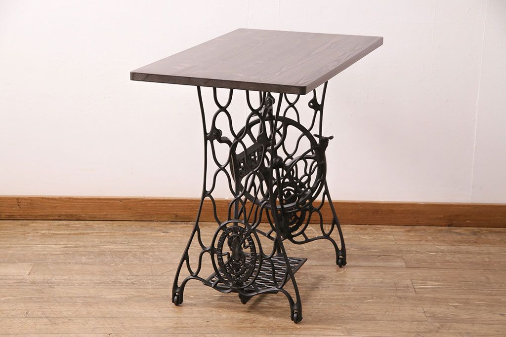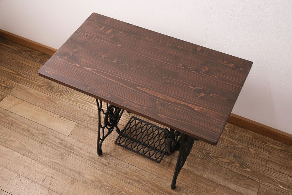 テーブル> 鉄脚テーブル > シンガーミシンの鉄脚をリペア&カスタム!天板を取り付け、ミシンテーブルにリメイク。天板は濃い茶色、鉄脚は黒色に着色し仕上げ。(ミシン台、カフェテーブル)