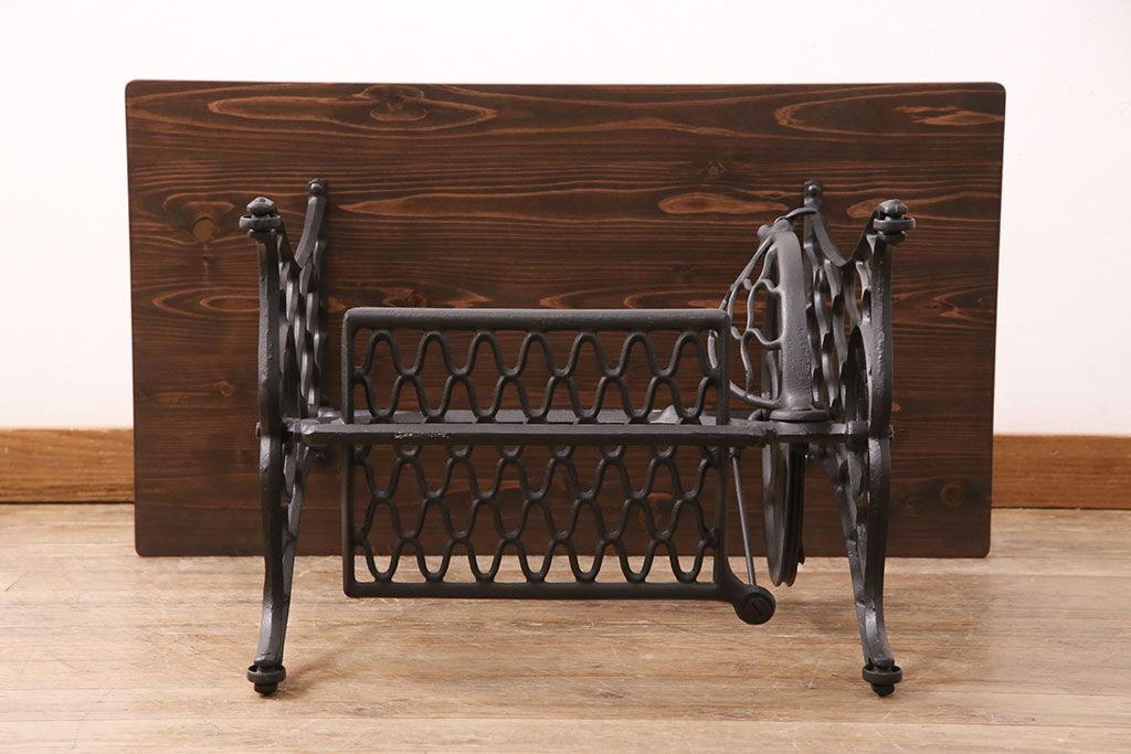 テーブル> カフェテーブル・コーヒーテーブル > シンガーミシンの鉄脚をリペア&カスタム!天板を取り付け、ミシンテーブルにリメイク。天板は濃い茶色、鉄脚は黒色に着色し仕上げ。(ミシン台、カフェテーブル)