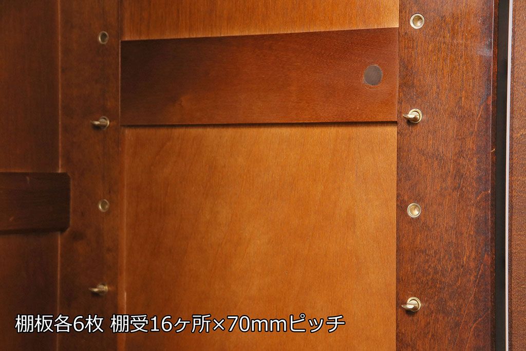 棚板は各6枚あります。棚受けは16ヶ所、70mmピッチで調整できます。棚幅サイズのものが1枚の作りです。