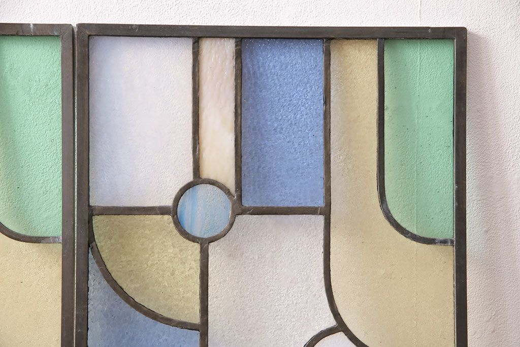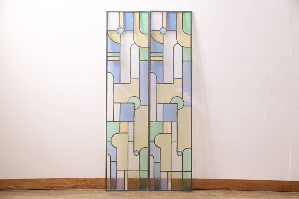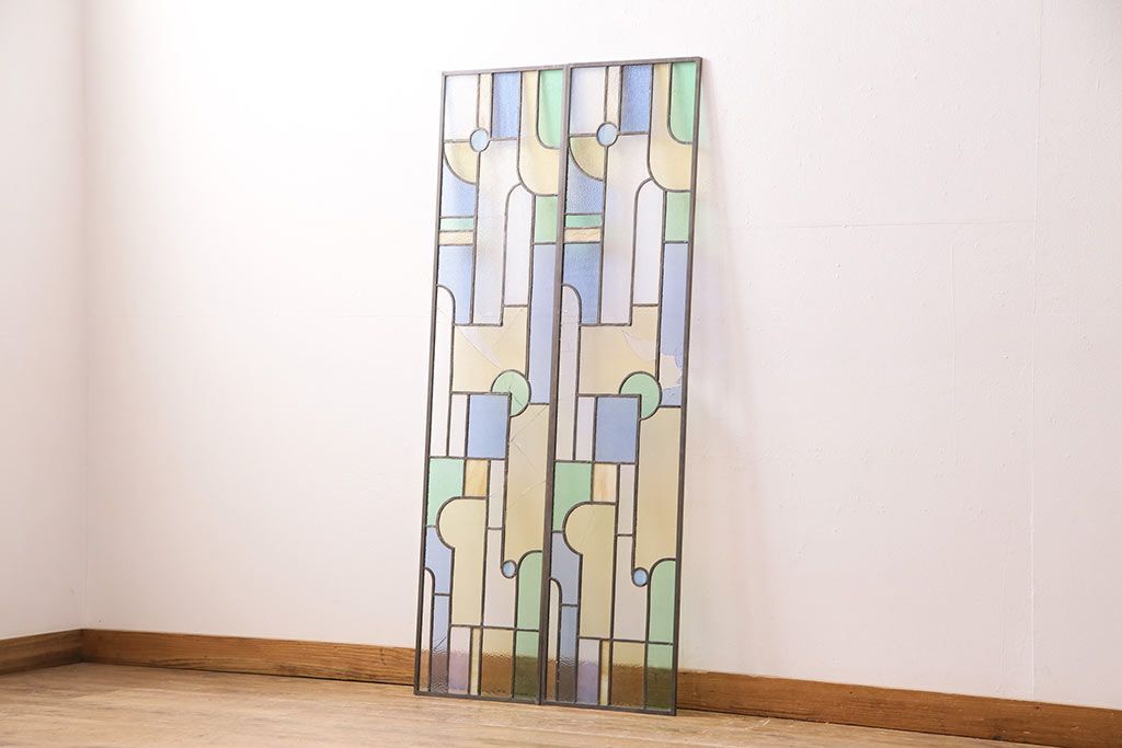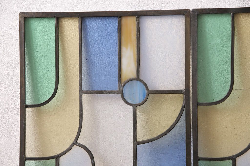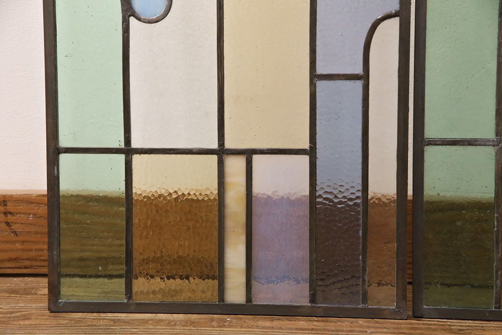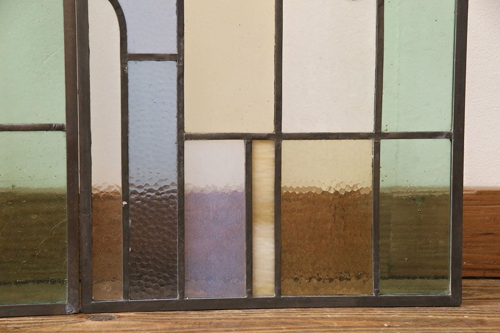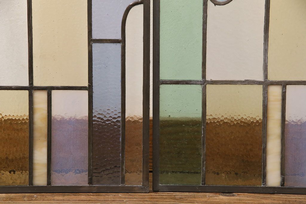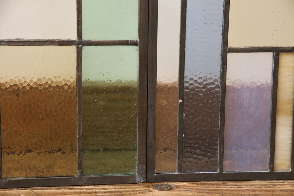 アンティーク建具 日本製 昭和初期 希少!木枠を作成して仕上げる、レトロなデザインが魅力のステンドグラス2枚セット(ドア、明り取り)(R-049608)