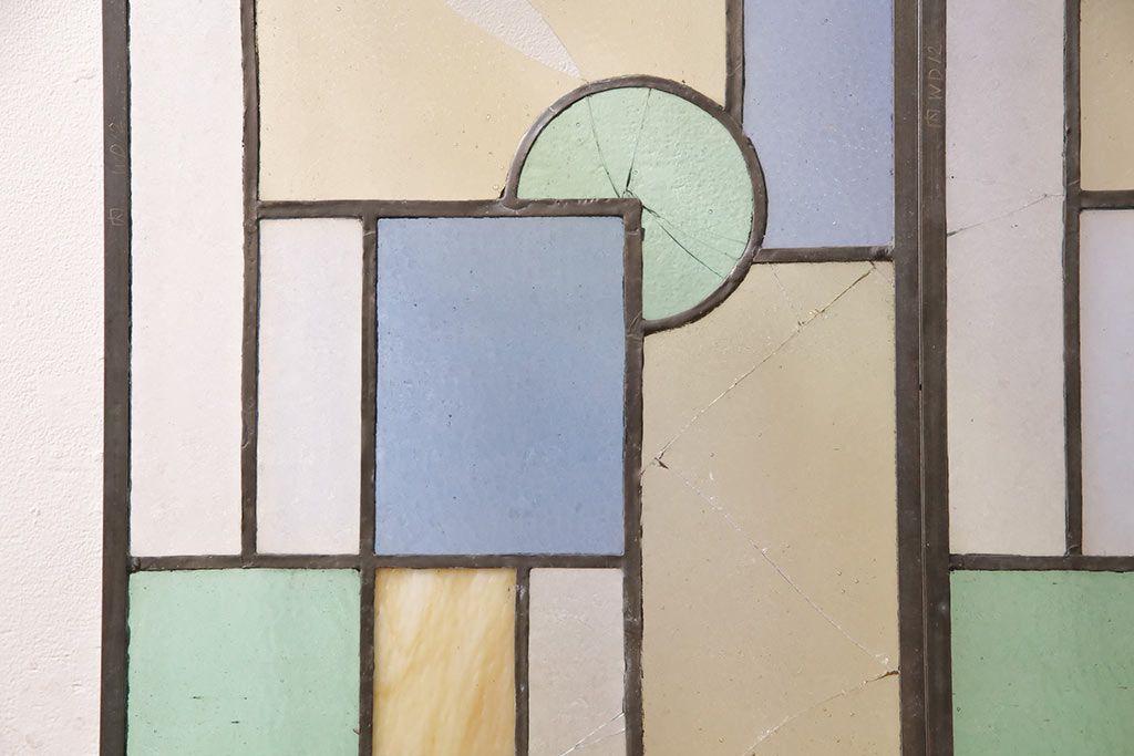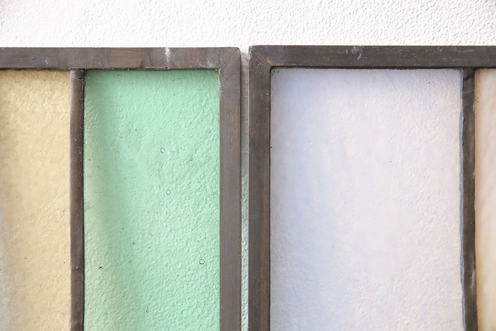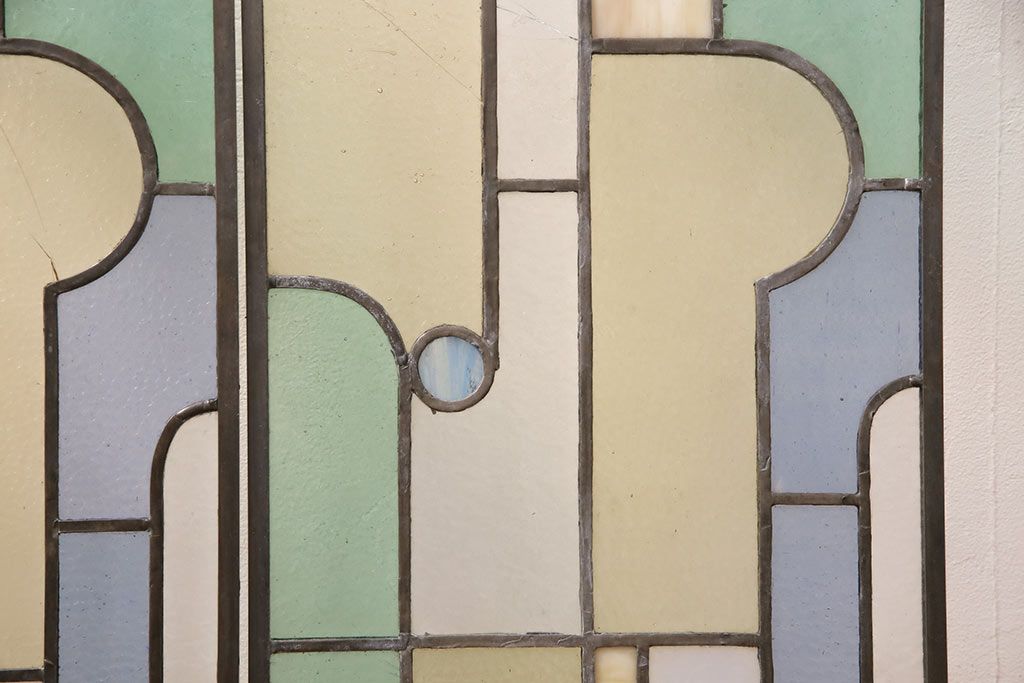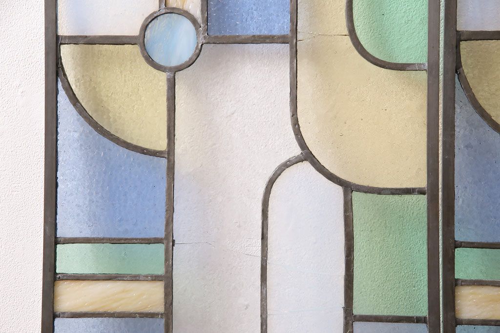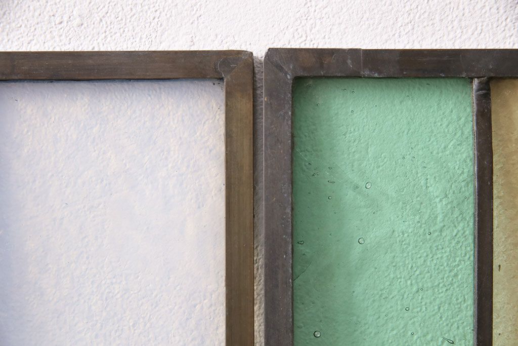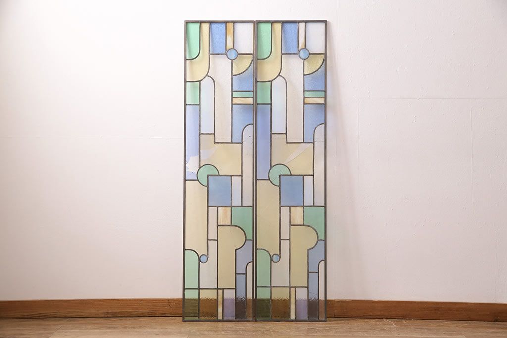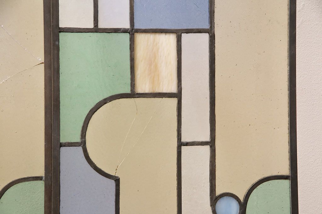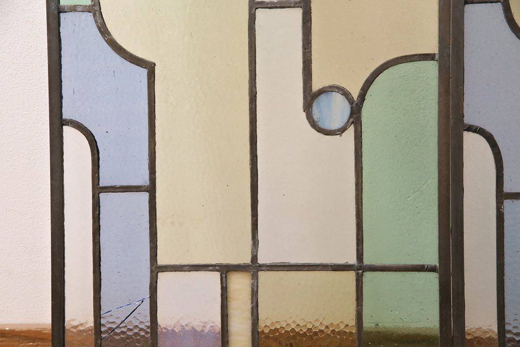 アンティーク建具 日本製 昭和初期 希少!木枠を作成して仕上げる、レトロなデザインが魅力のステンドグラス2枚セット(ドア、明り取り)(R-049608)