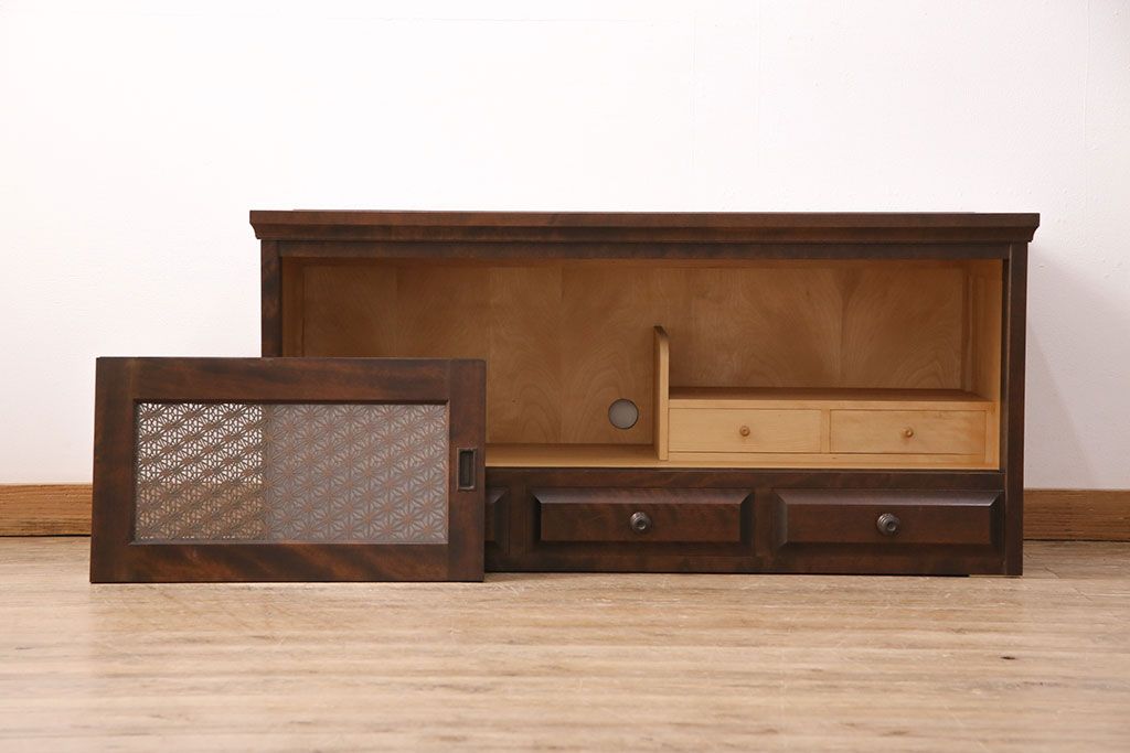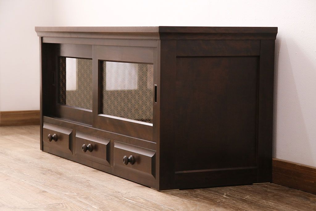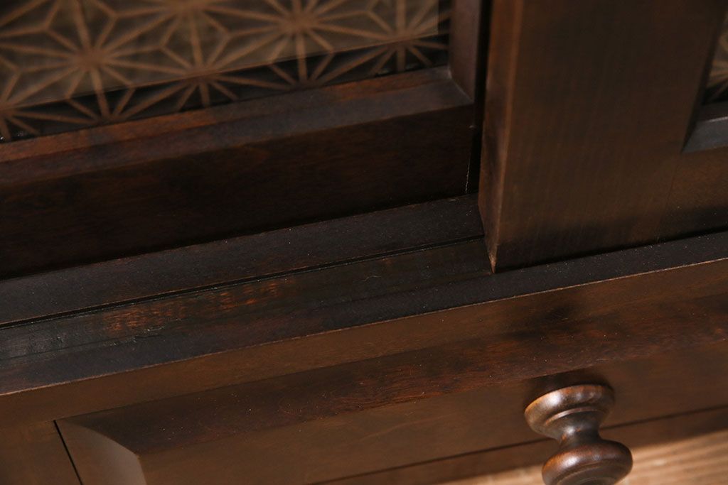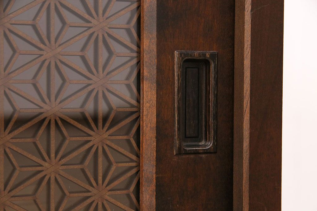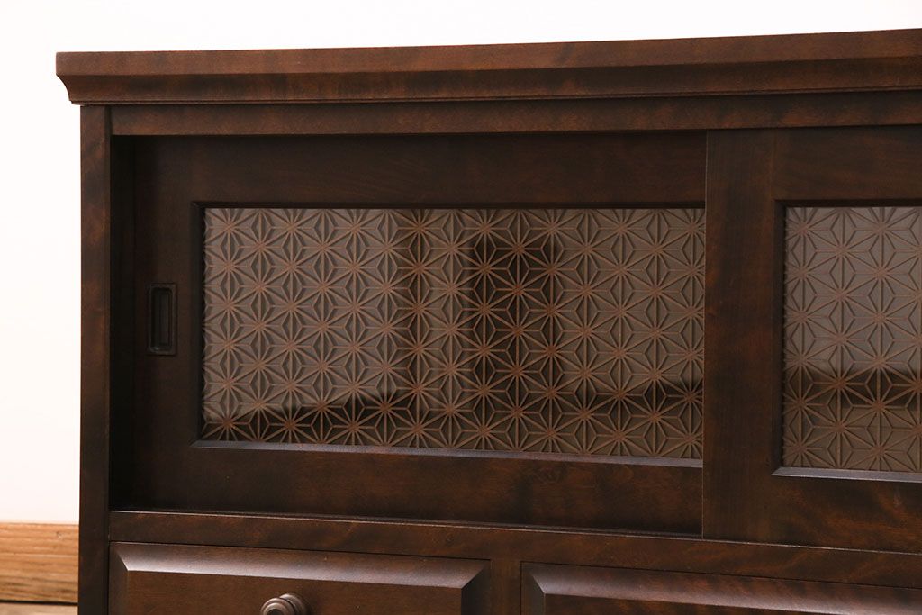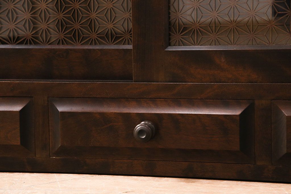 キャビネット・戸棚> テレビ台・ローボード > 北海道民芸家具のローボードをリペア&カスタム!建具を板戸からレーザー組子入りガラス戸に変更。背面穴開け加工。現状の色味に合わせて着色し仕上げ。(テレビ台、収納棚、戸棚)