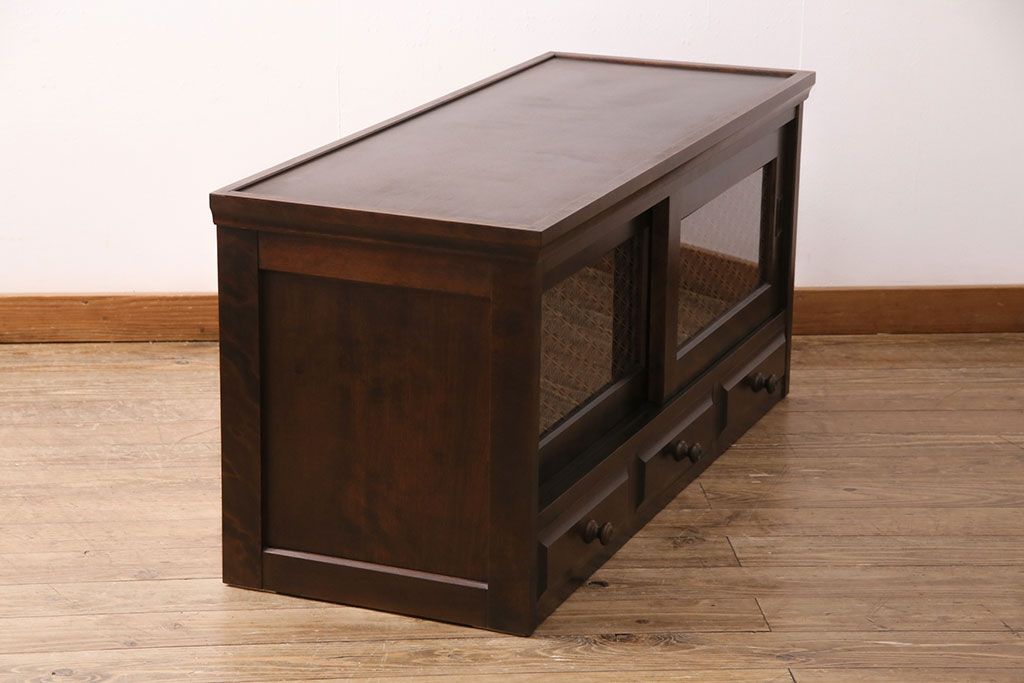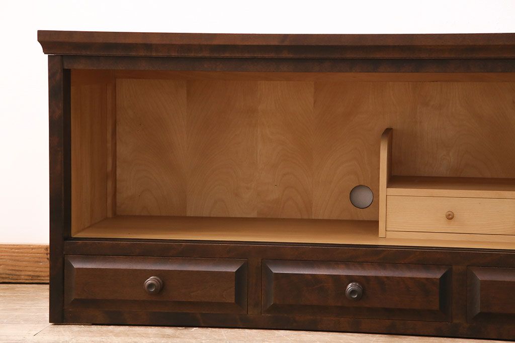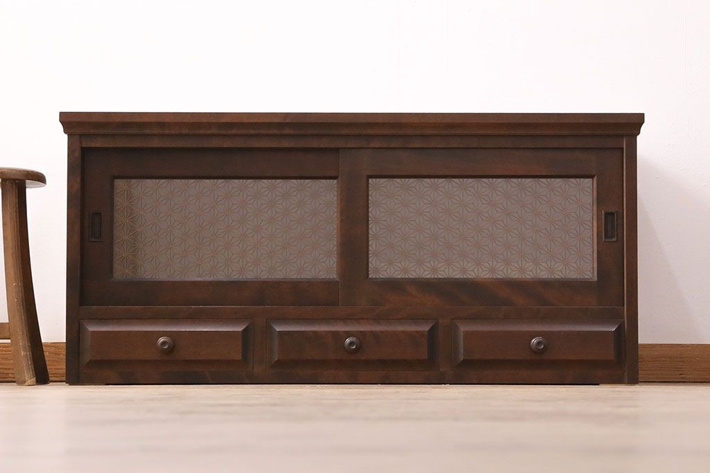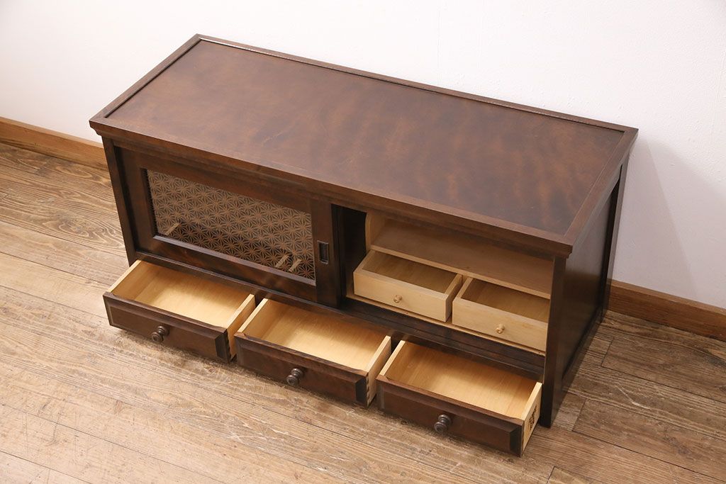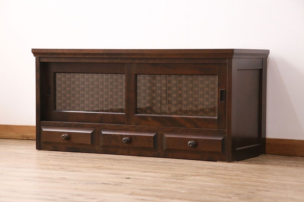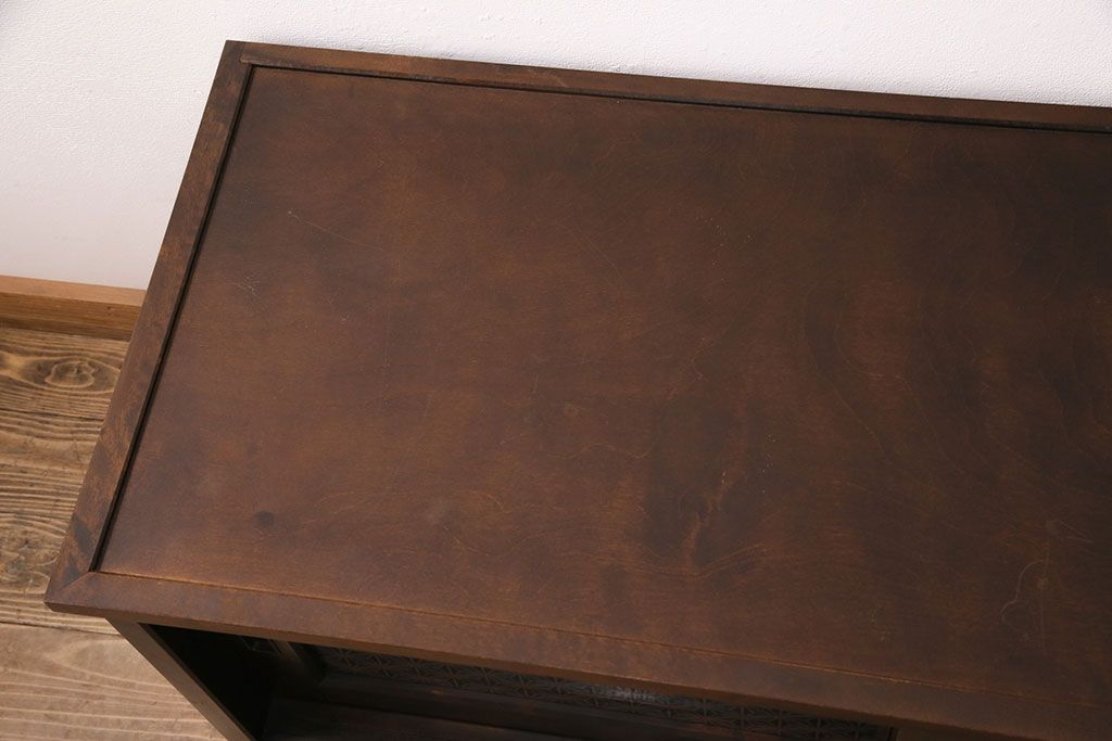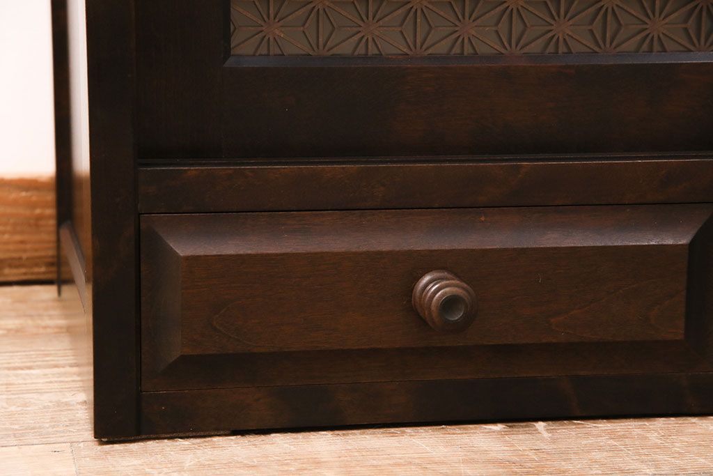 キャビネット・戸棚> テレビ台・ローボード > 北海道民芸家具のローボードをリペア&カスタム!建具を板戸からレーザー組子入りガラス戸に変更。背面穴開け加工。現状の色味に合わせて着色し仕上げ。(テレビ台、収納棚、戸棚)