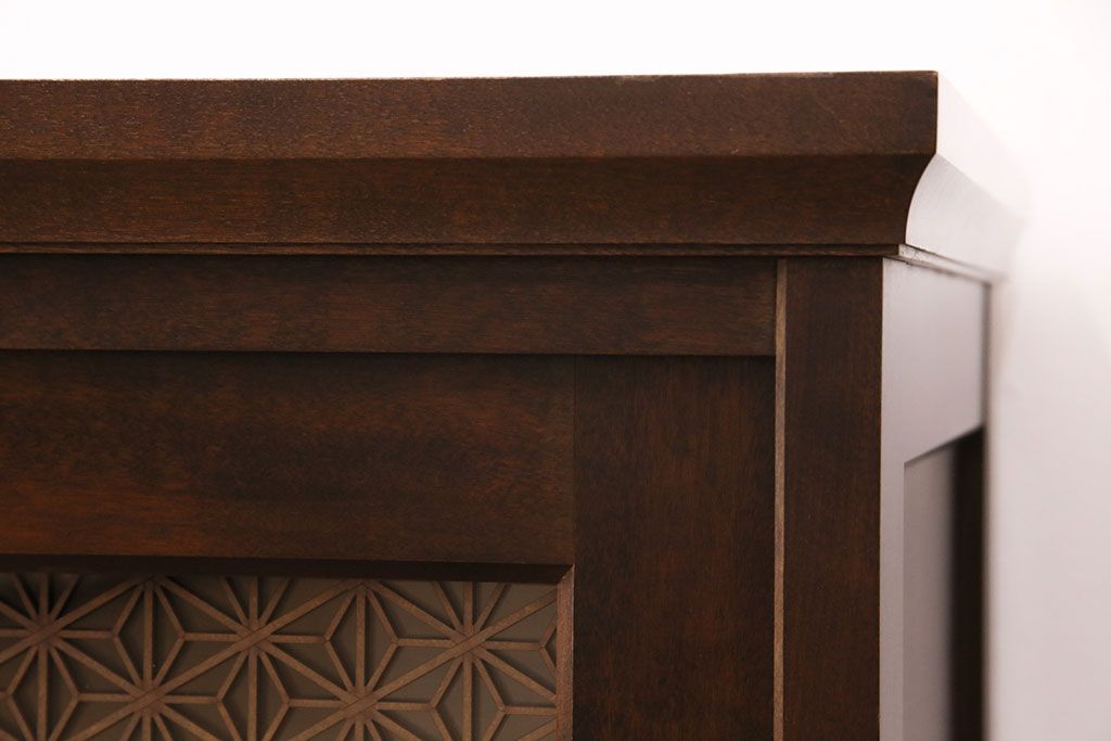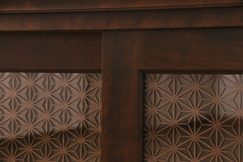 セミオーダー家具実績 > 北海道民芸家具のローボードをリペア&カスタム!建具を板戸からレーザー組子入りガラス戸に変更。背面穴開け加工。現状の色味に合わせて着色し仕上げ。(テレビ台、収納棚、戸棚)