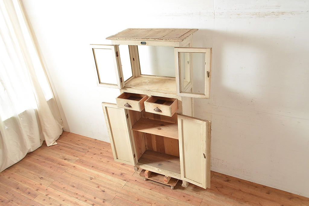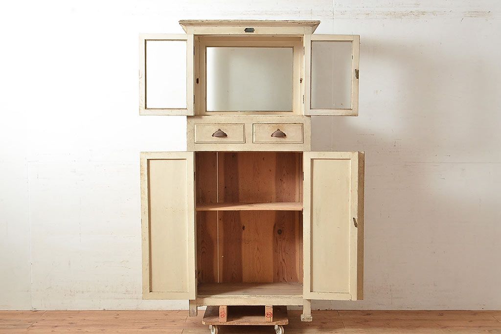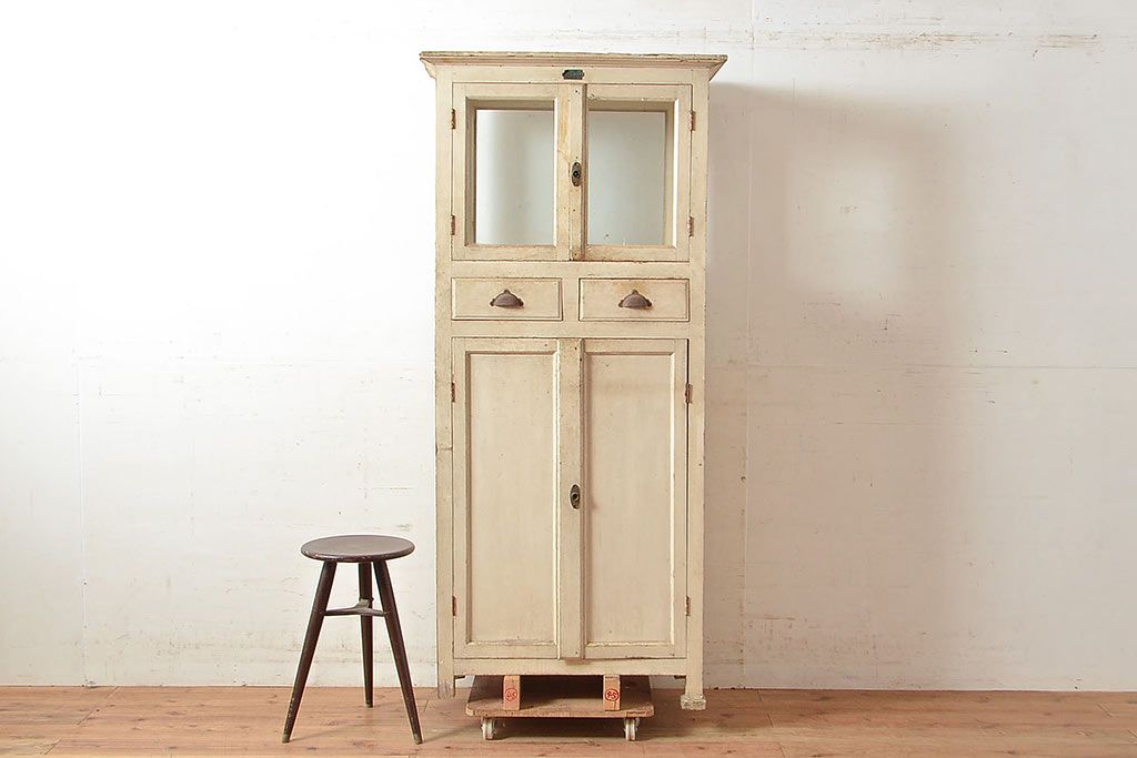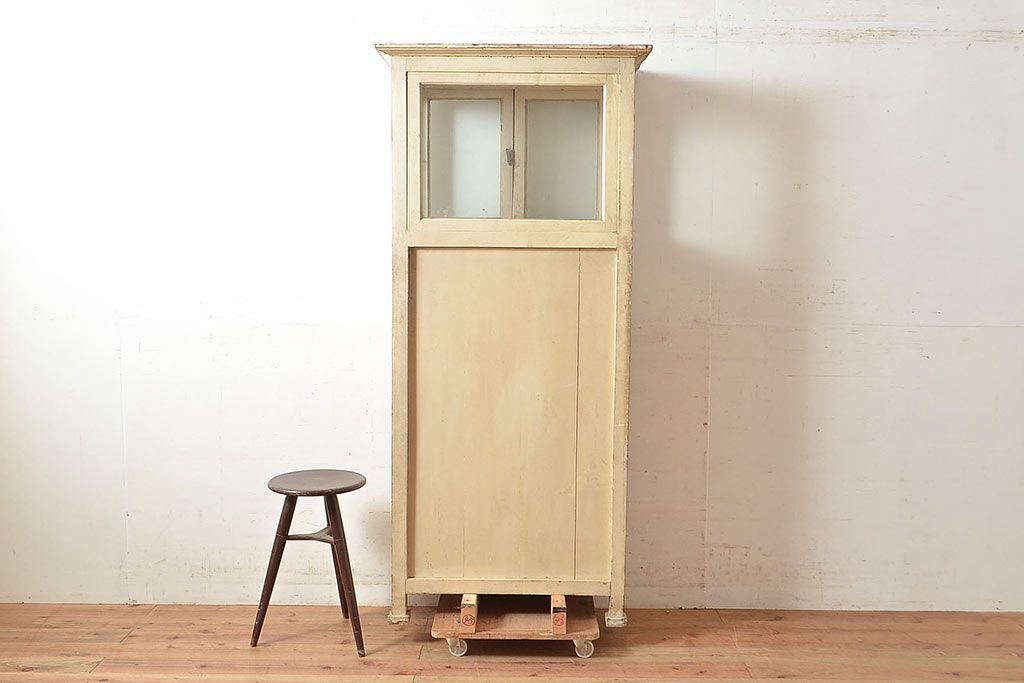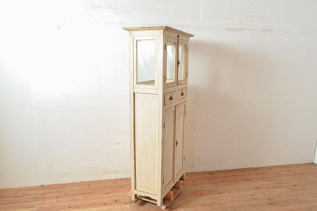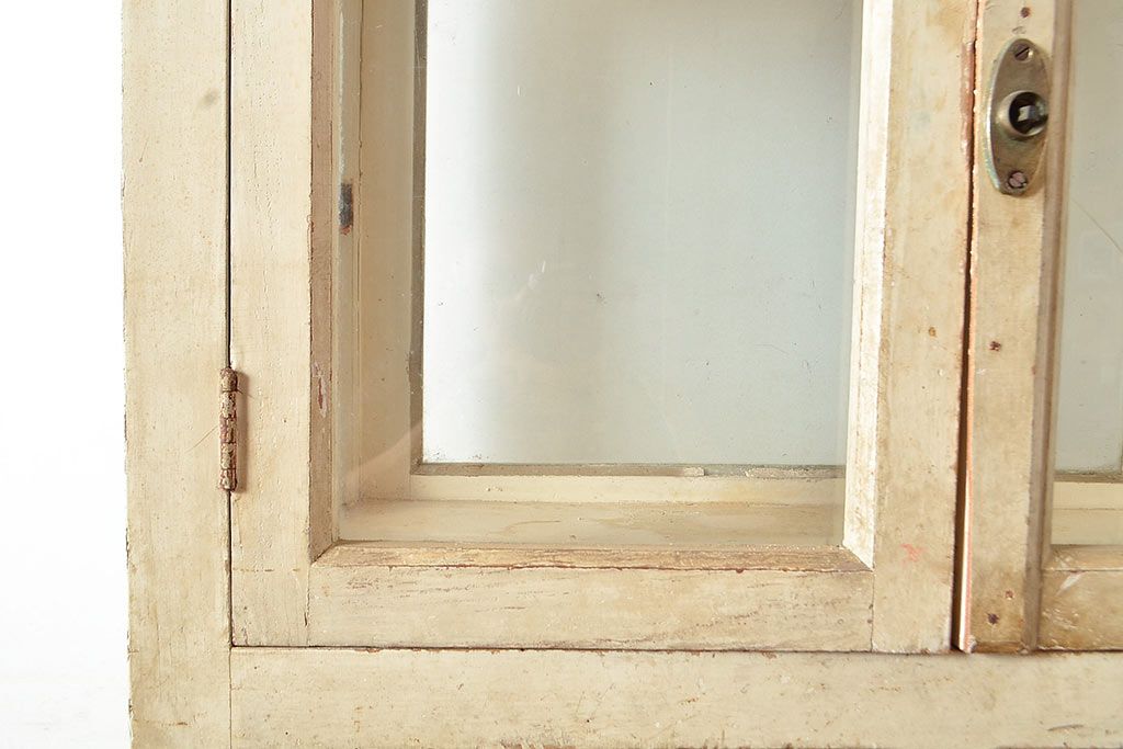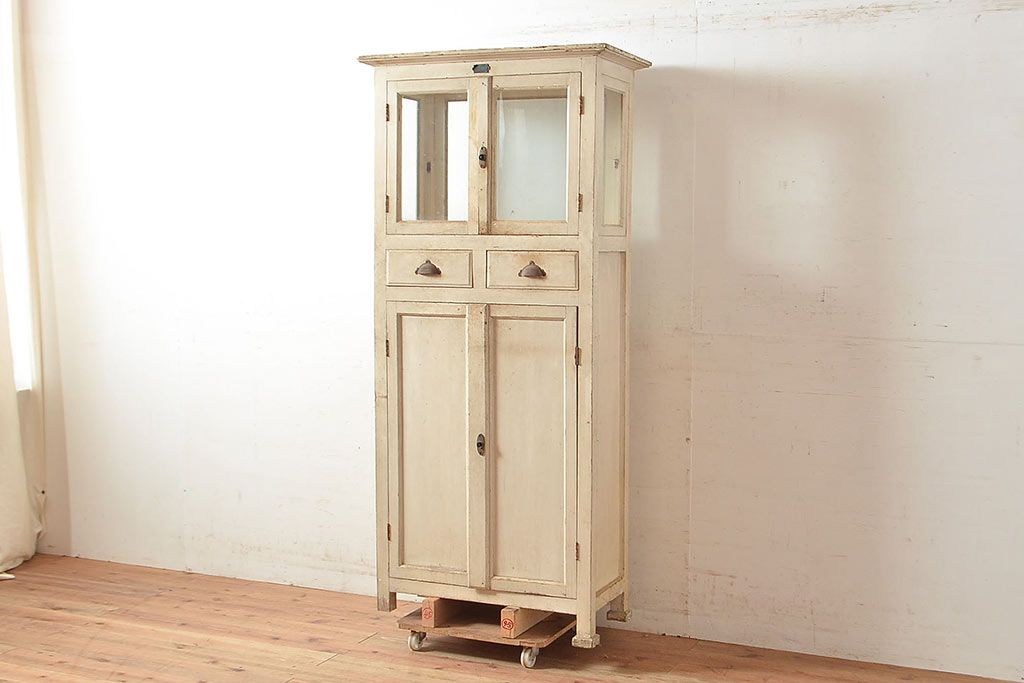 ラフジュ工房> キャビネット・戸棚> 医療用キャビネット・ケビント > 和製アンティーク 昭和初期 珍しいデザインのペイントキャビネット(デンタルケース、デンタルキャビネット、ケビント、ガラスケース、戸棚)(R-048553)
