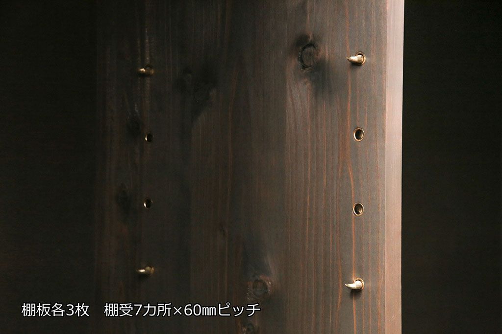 棚板は取り外しできます。棚板は各3枚あります。棚受けは7ヶ所、60mmピッチで調整できます。棚幅サイズのものが1枚の作りです。