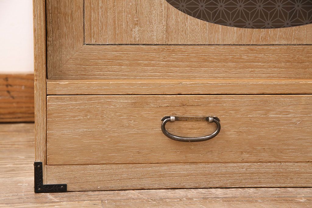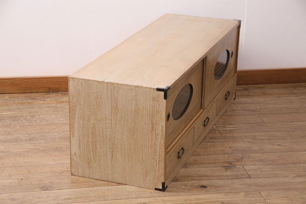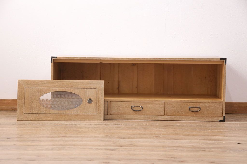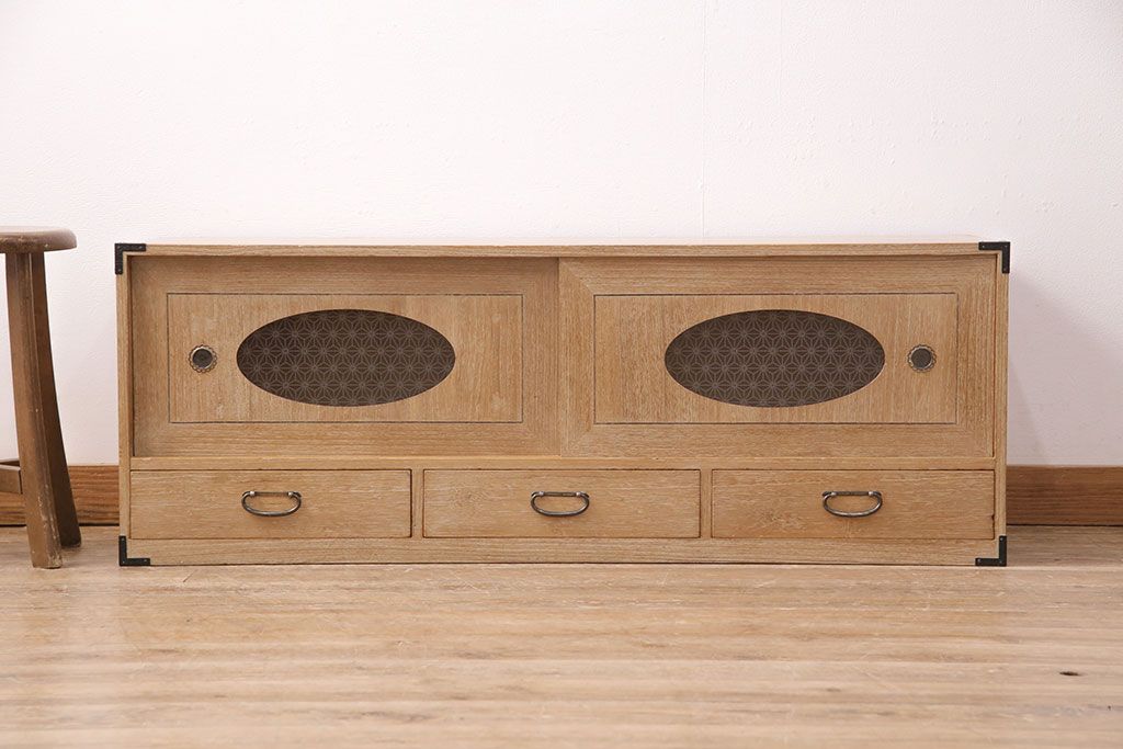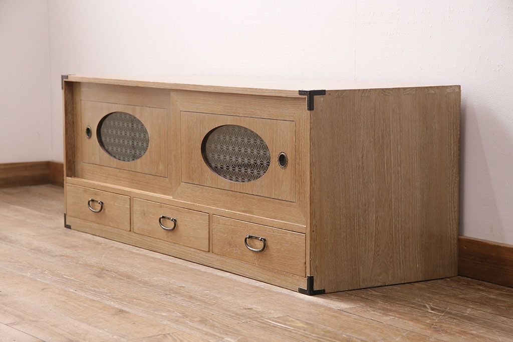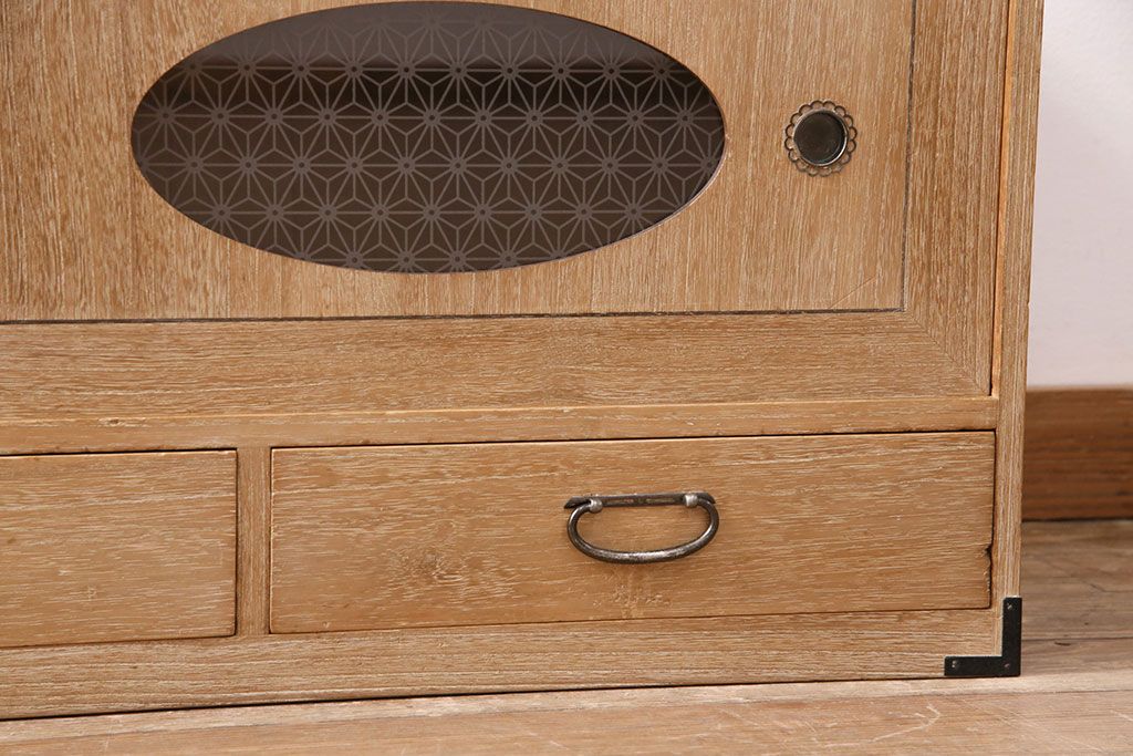 キャビネット・戸棚> テレビ台・ローボード > 収納箪笥のローボードをリペア&カスタム!引き戸に楕円形の窓を製作し、当店オリジナルの麻の葉模様ガラスを組み入れ。蜜蝋ワックスにて仕上げ。(丸窓、テレビ台、収納棚)