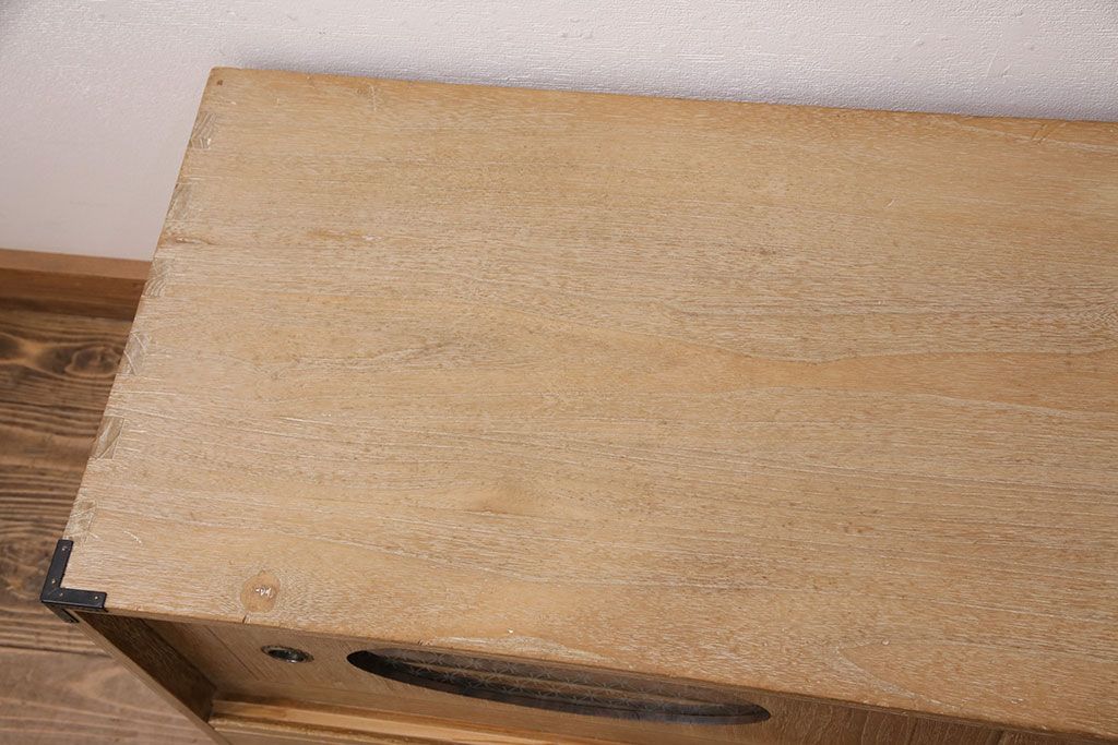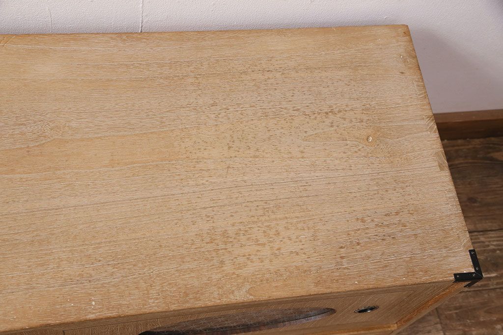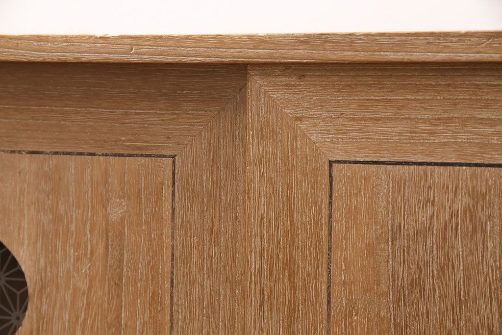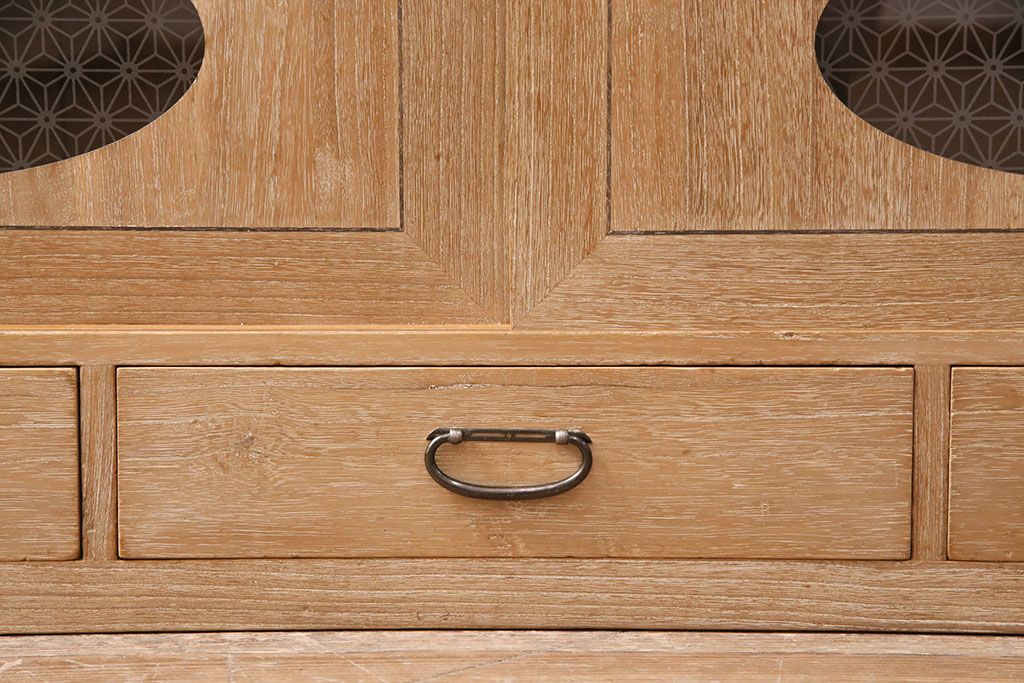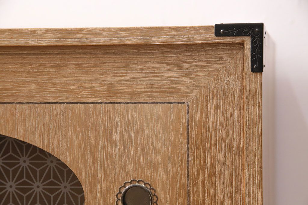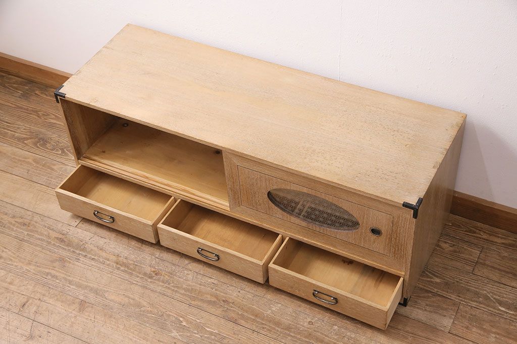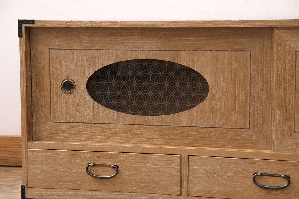 キャビネット・戸棚> テレビ台・ローボード > 収納箪笥のローボードをリペア&カスタム!引き戸に楕円形の窓を製作し、当店オリジナルの麻の葉模様ガラスを組み入れ。蜜蝋ワックスにて仕上げ。(丸窓、テレビ台、収納棚)