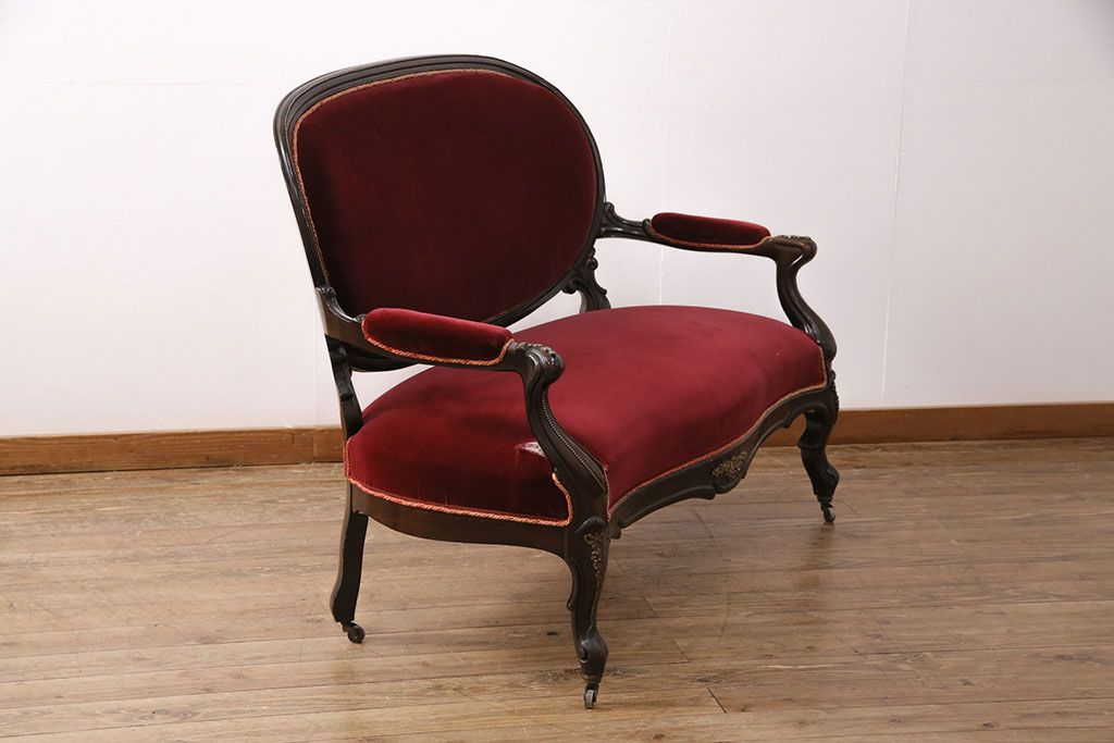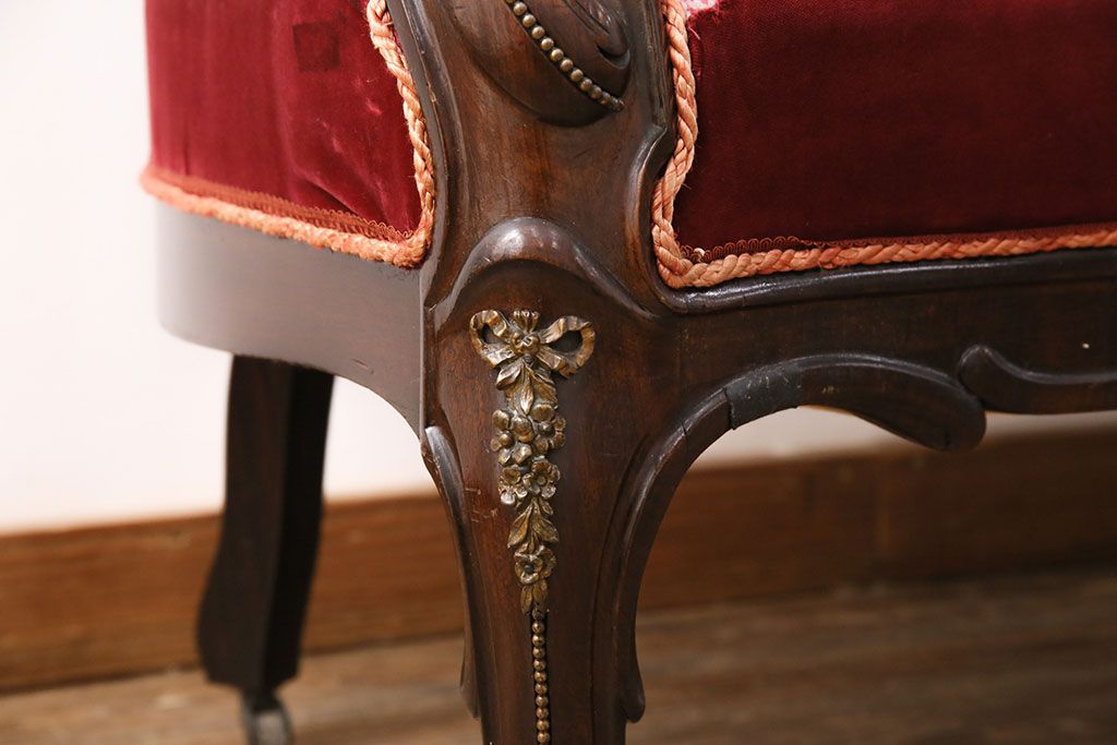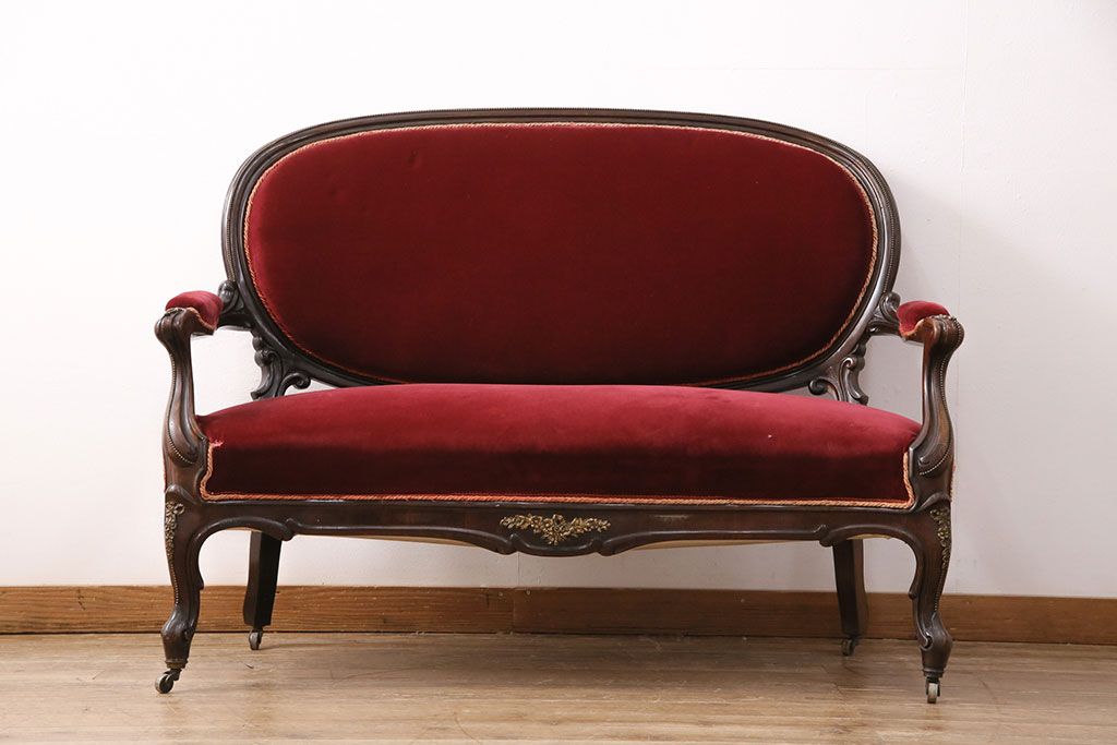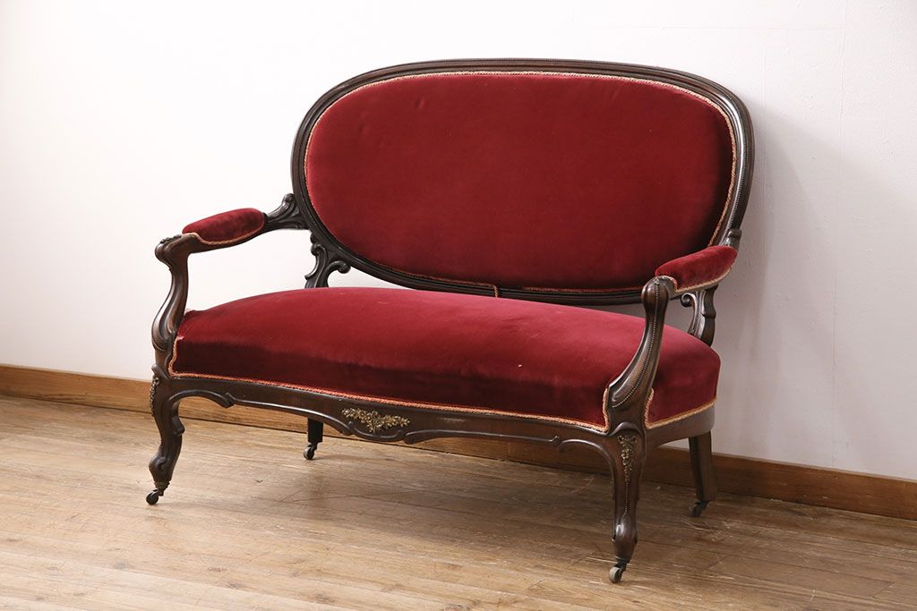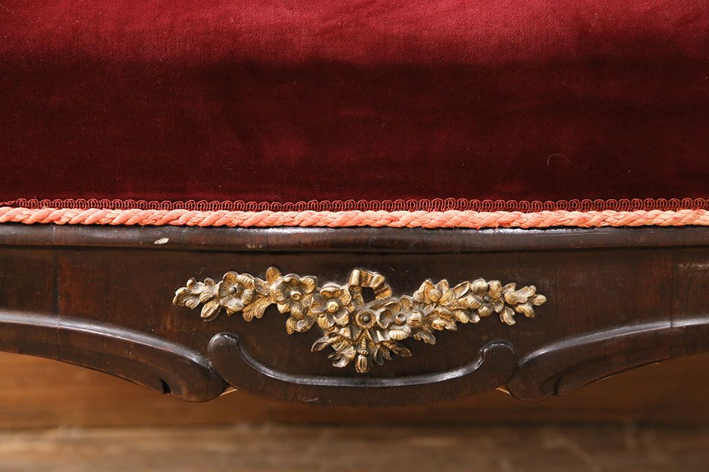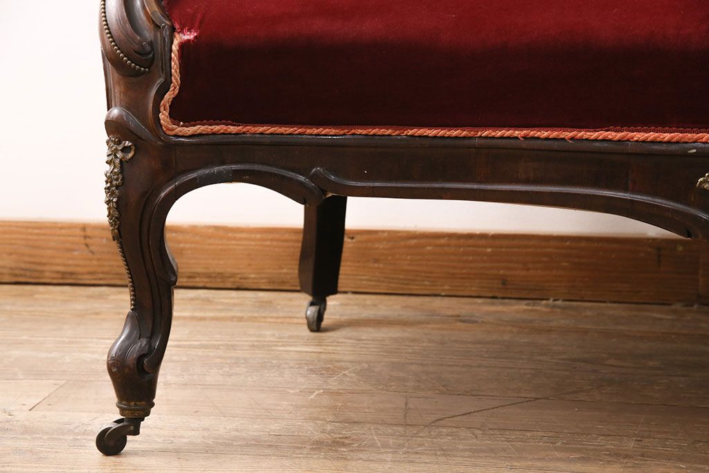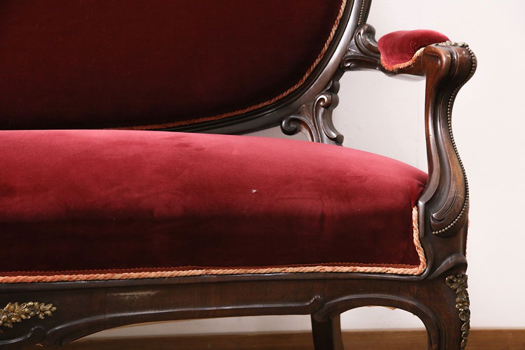 フランスアンティーク マホガニー材 キャスター付き 真鍮飾りが美しい!優雅なひとときを演出する高級品の2人掛けソファ(2P、アームソファ)(R-050680)です。