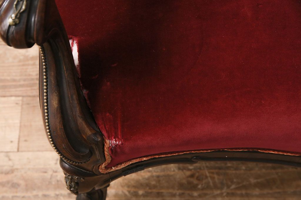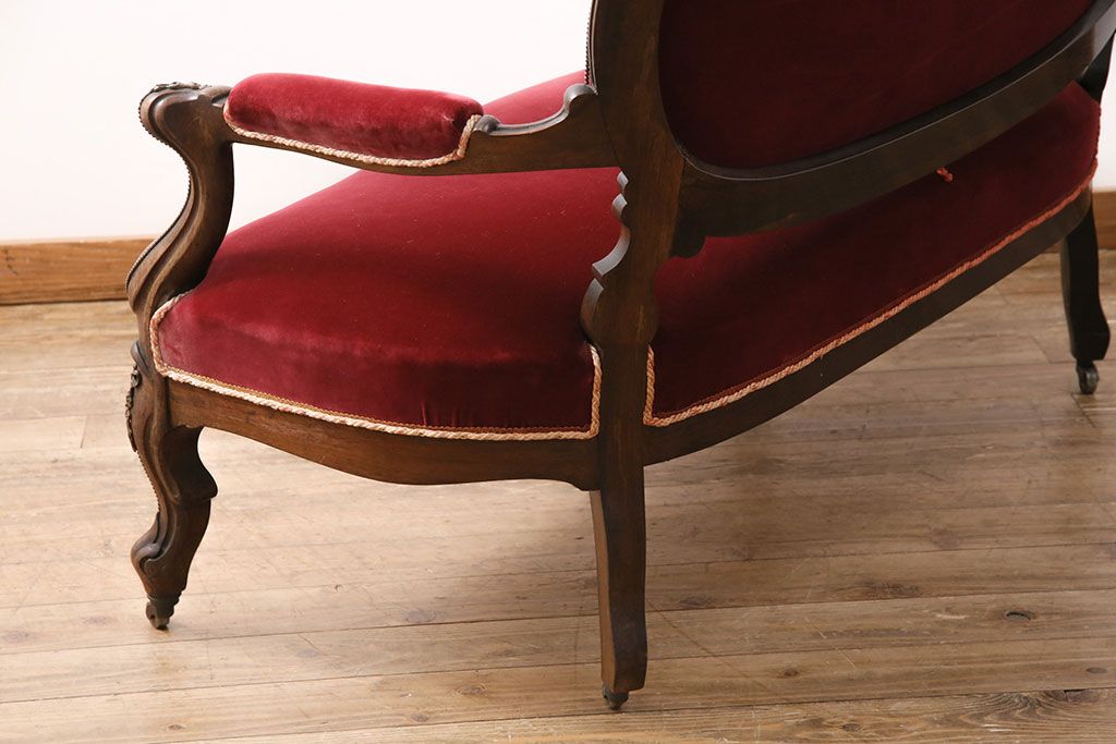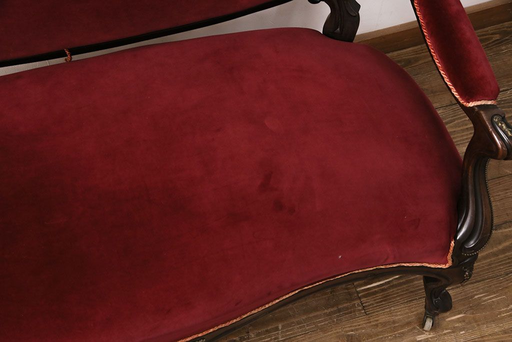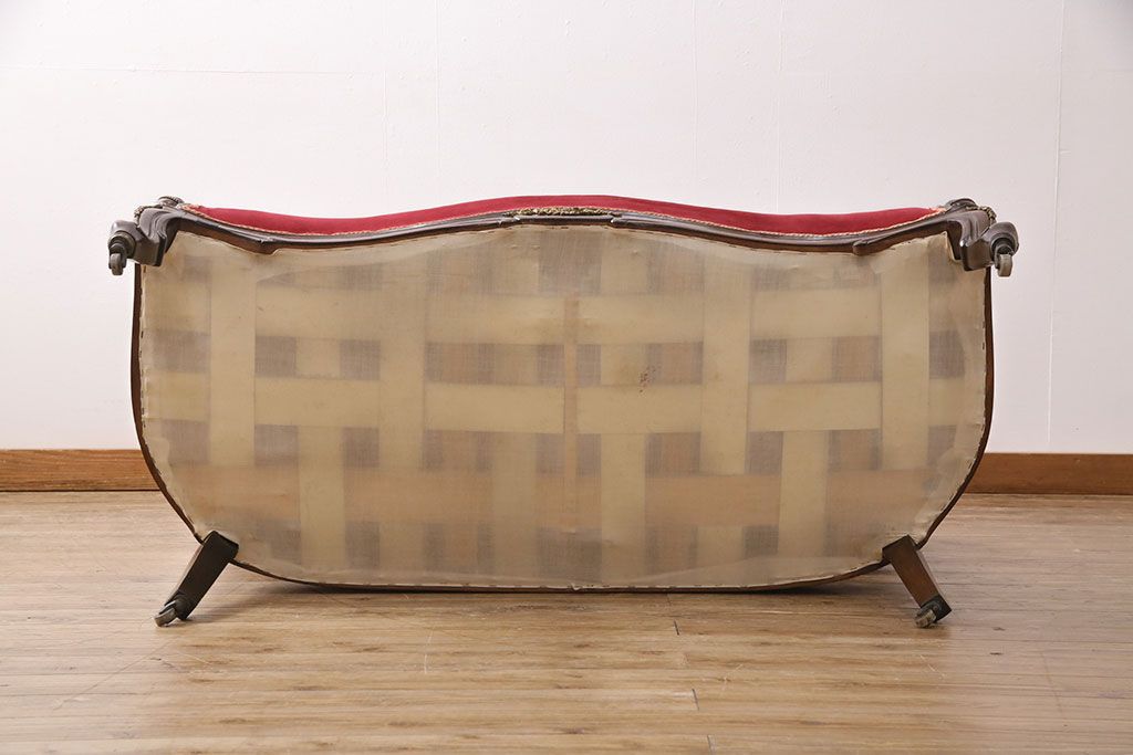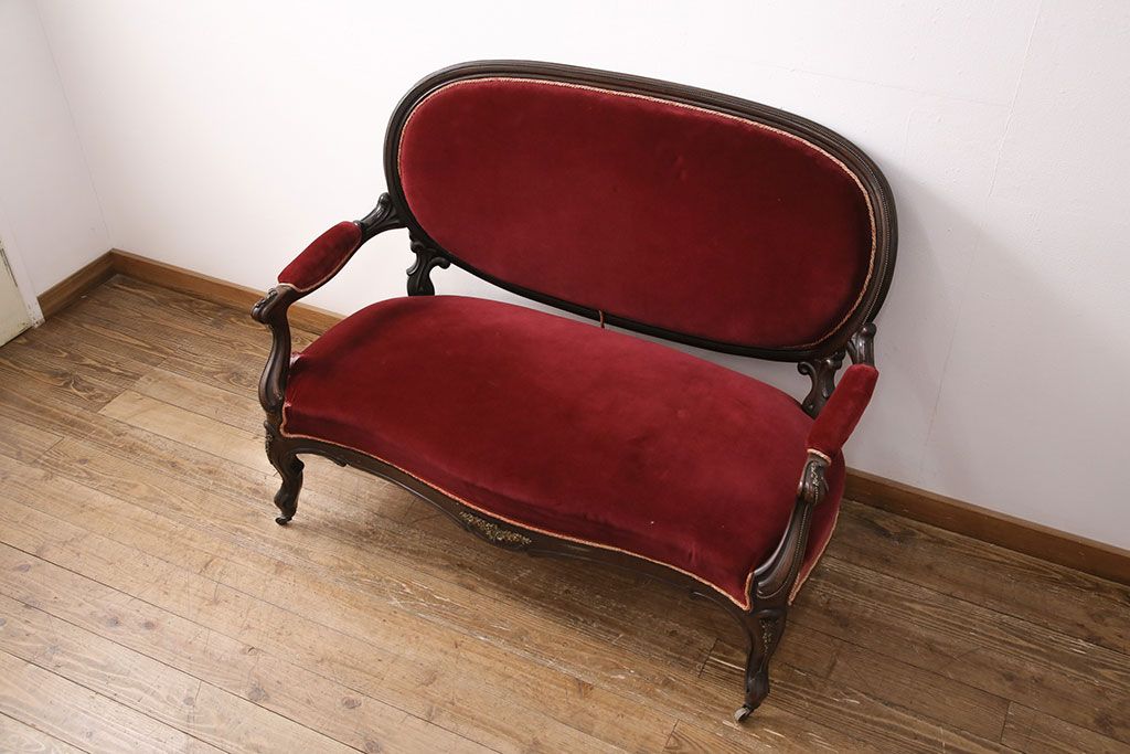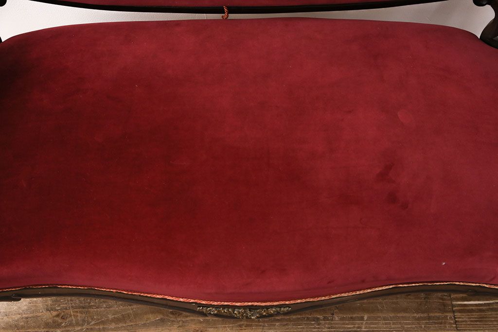 フランスアンティーク マホガニー材 キャスター付き 真鍮飾りが美しい!優雅なひとときを演出する高級品の2人掛けソファ(2P、アームソファ)(R-050680)です。