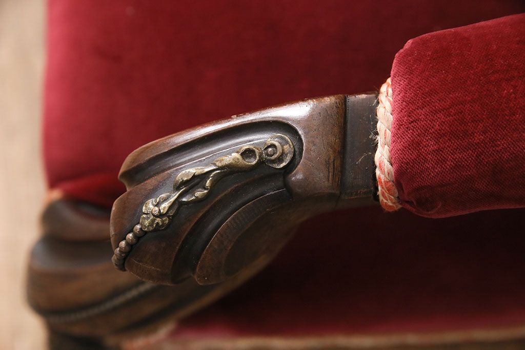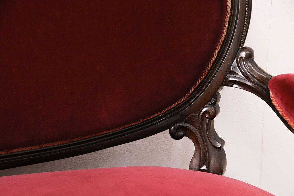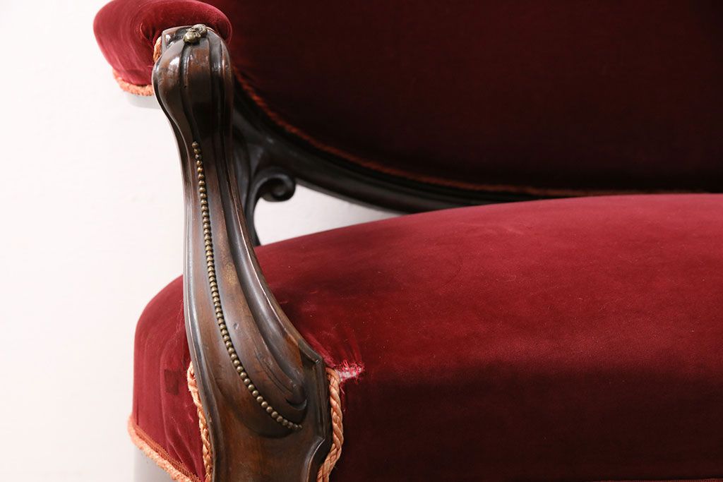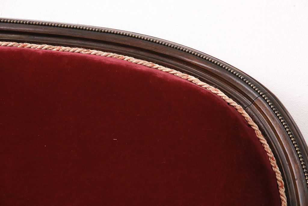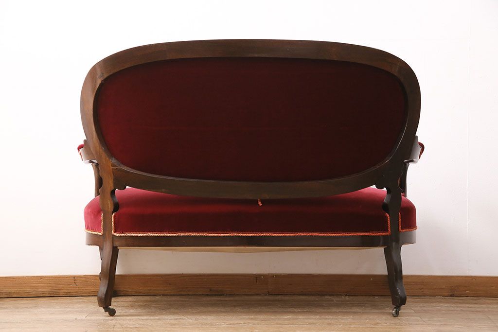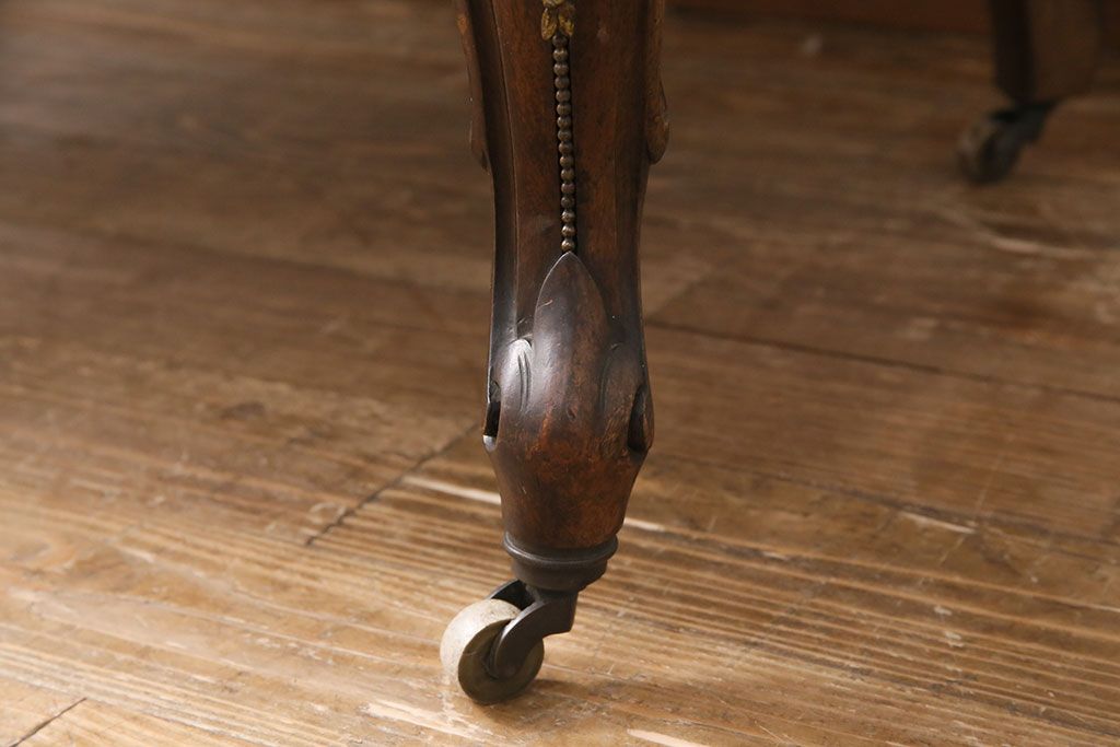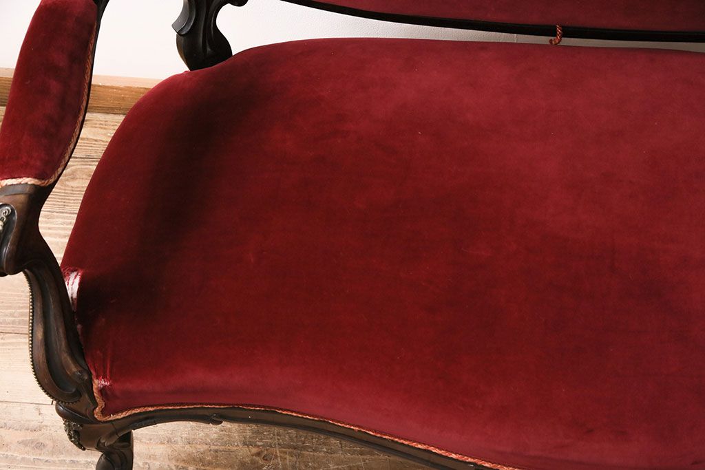 フランスアンティーク マホガニー材 キャスター付き 真鍮飾りが美しい!優雅なひとときを演出する高級品の2人掛けソファ(2P、アームソファ)(R-050680)です。