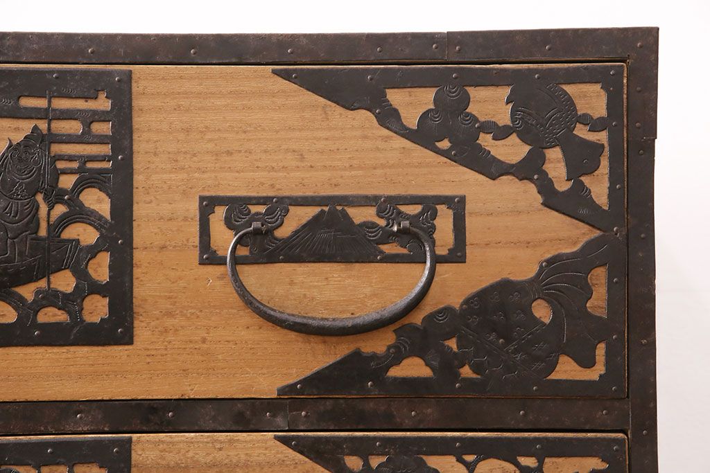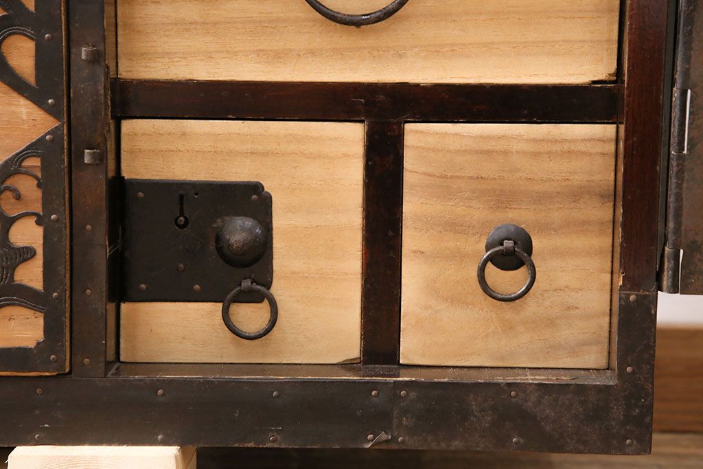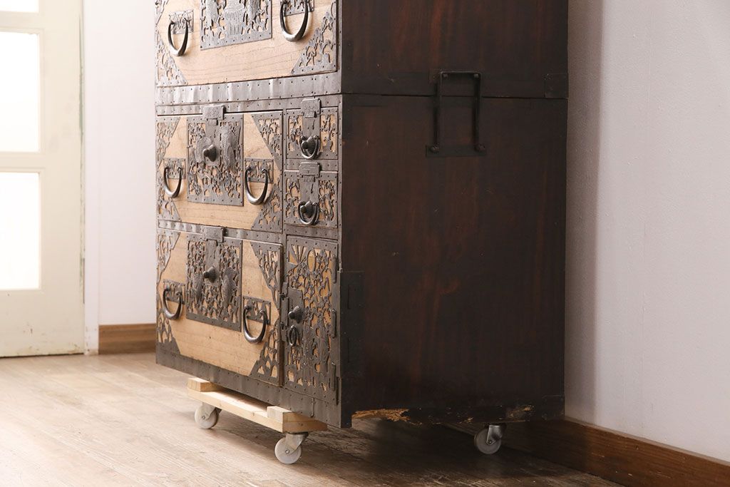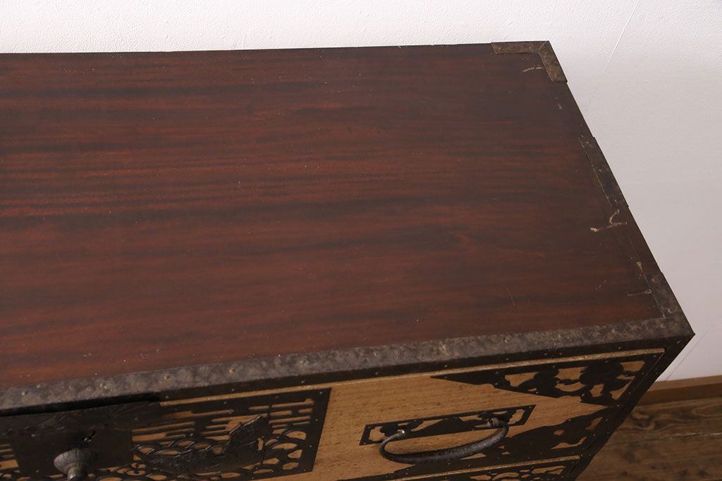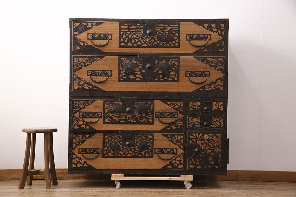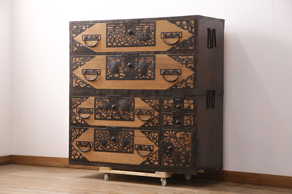 ラフジュ工房> 和箪笥 > 和製アンティーク 総桐材製 繊細で美しい透かし金具が目を引く佐渡箪笥(八幡箪笥、衣装タンス、引き出し、桐箪笥、桐たんす)(R-050727)