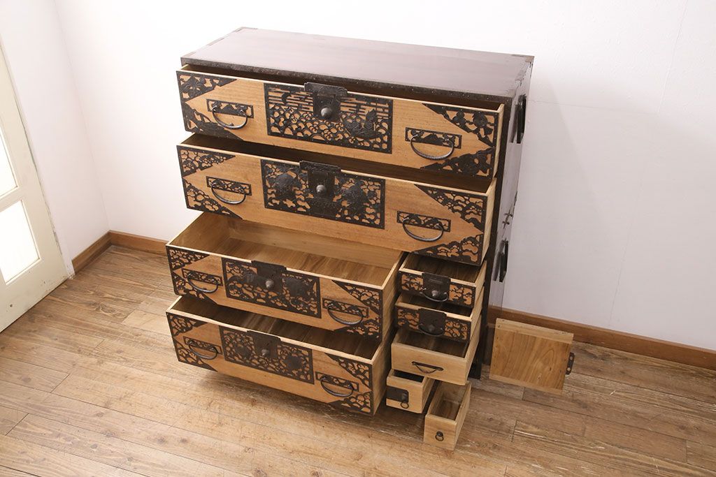 和製アンティーク 総桐材製 繊細で美しい透かし金具が目を引く佐渡箪笥(八幡箪笥、衣装タンス、引き出し、桐箪笥、桐たんす)(R-050727)