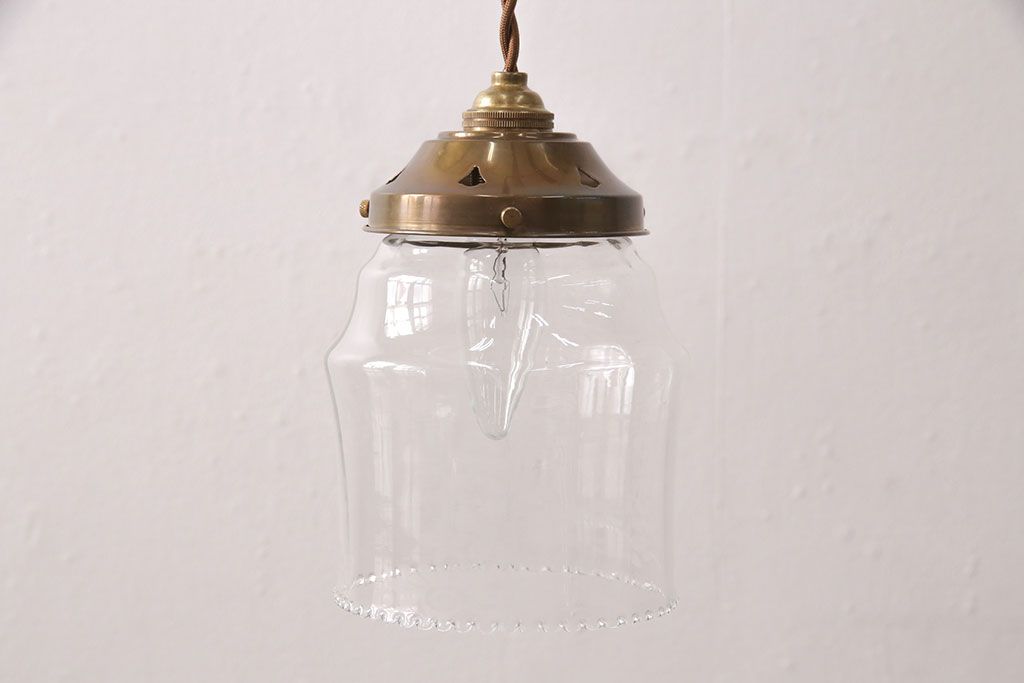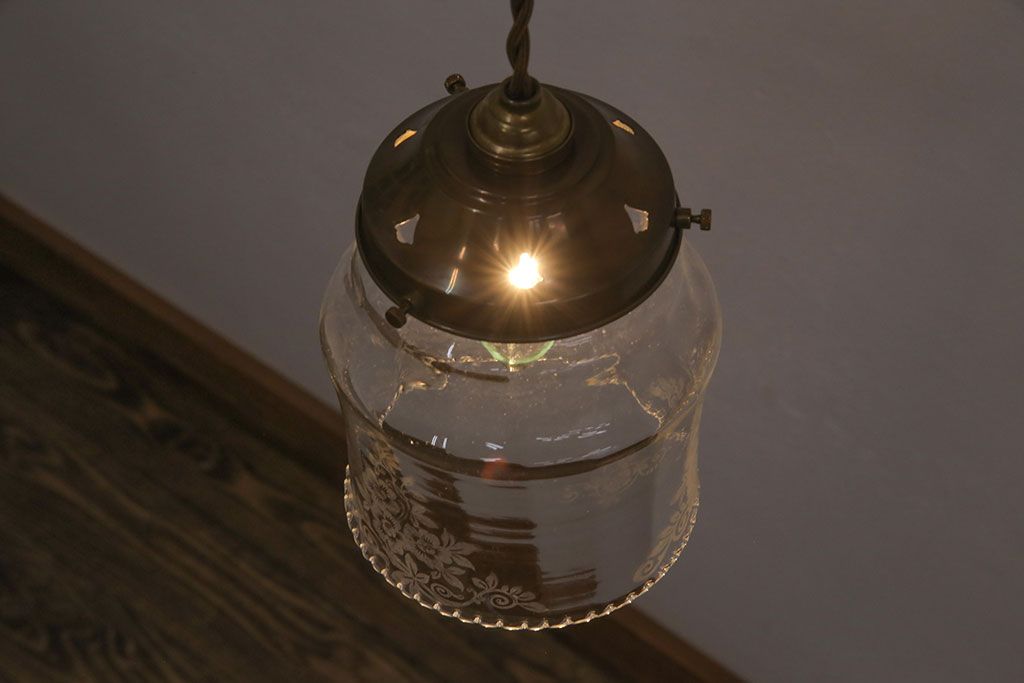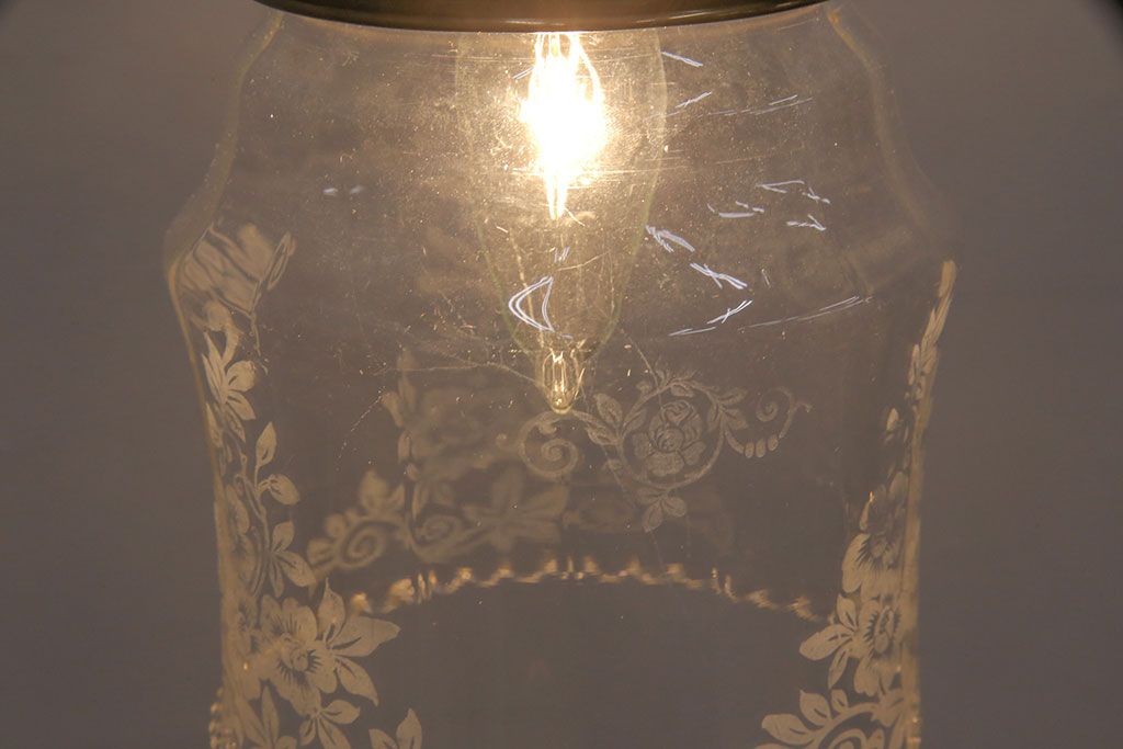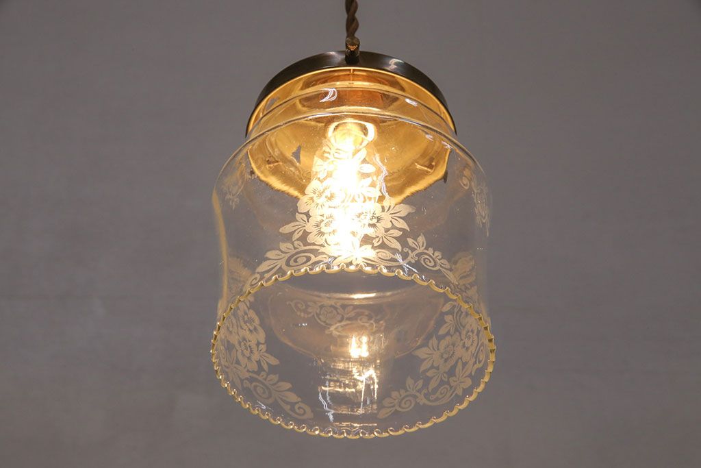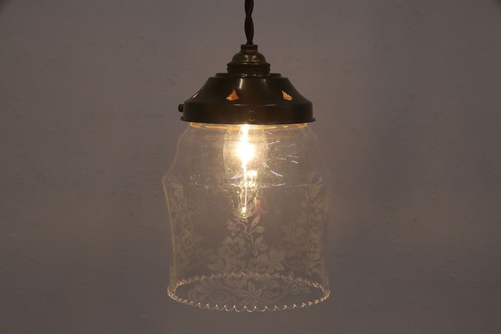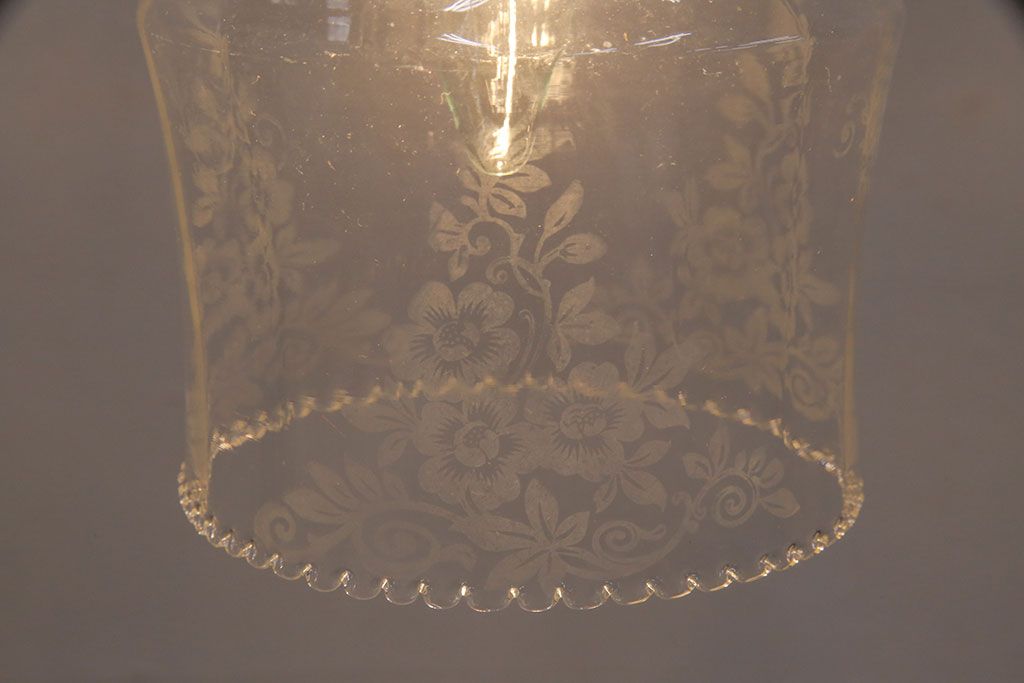照明・ランプ> ペンダントライト > アンティーク照明 イギリスアンティーク 小さなフリルと花模様のすり加工が上品な雰囲気を高めるペンダントライト(吊り下げ照明、天井照明、シェード)(R-050799)