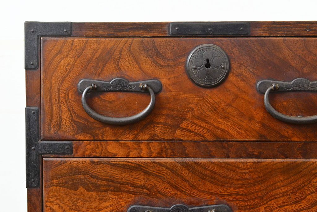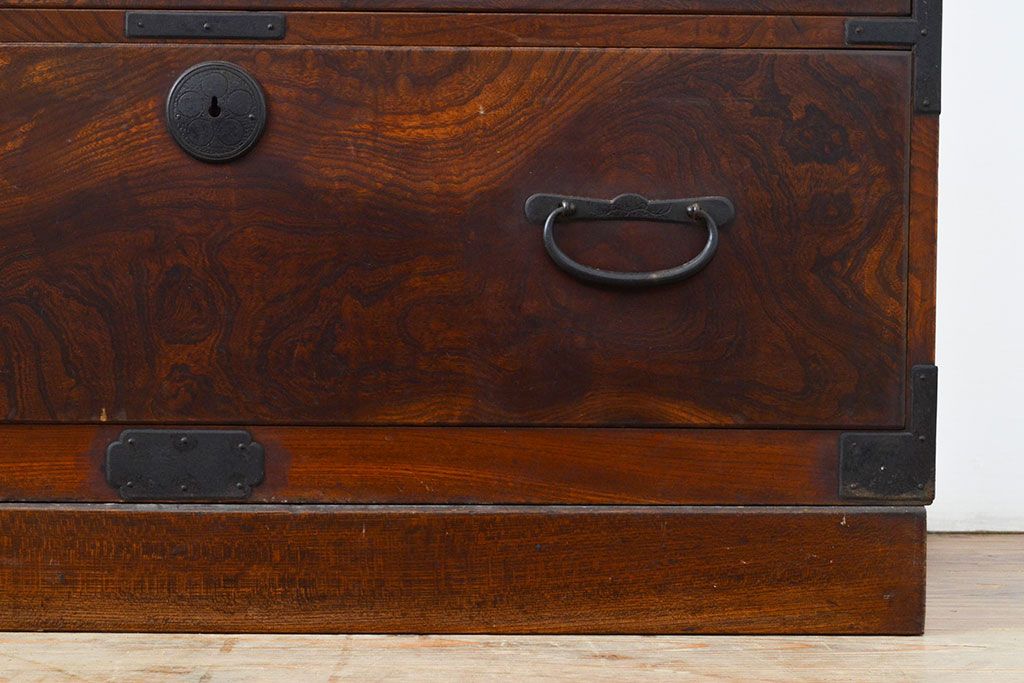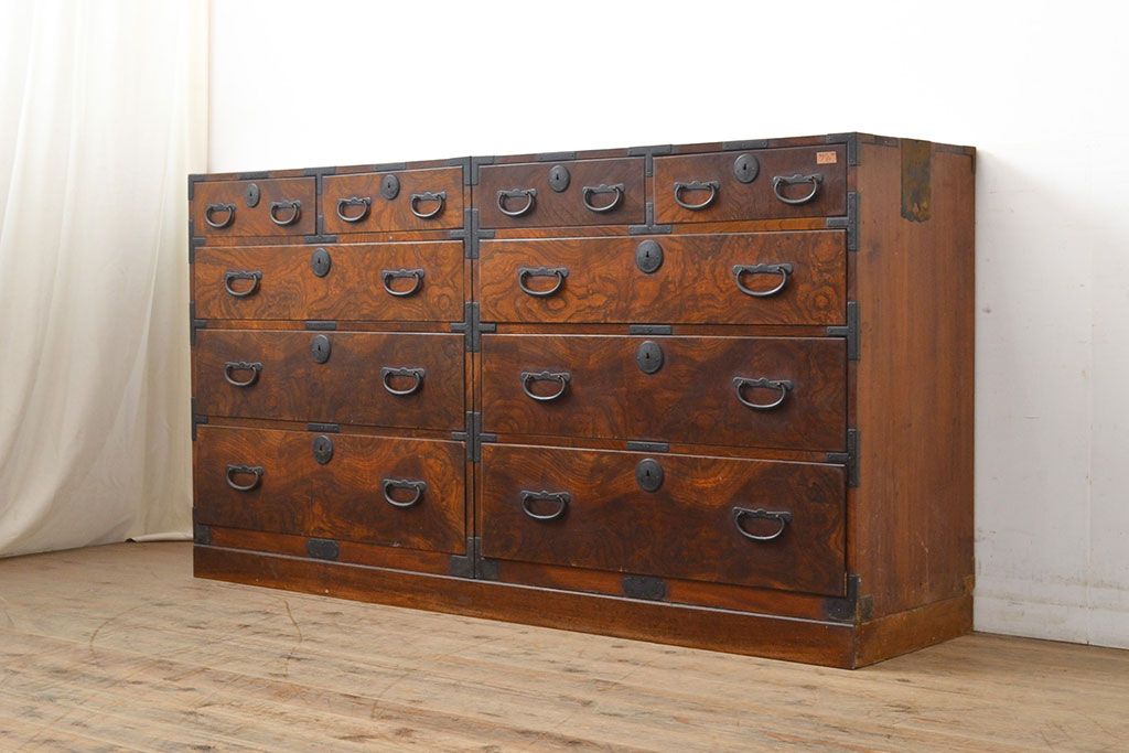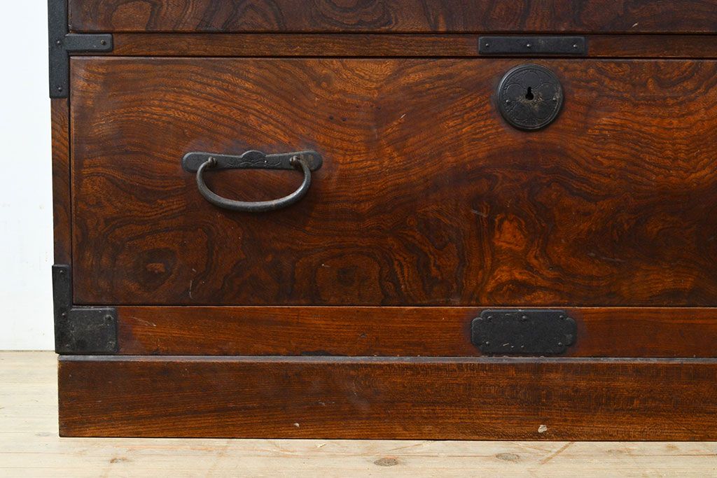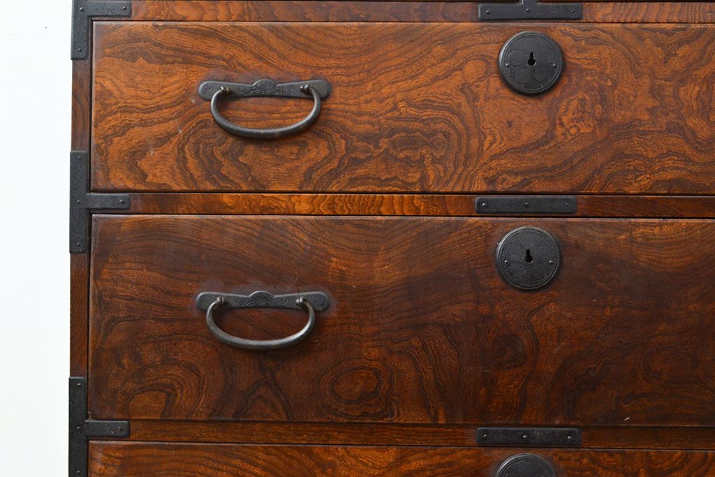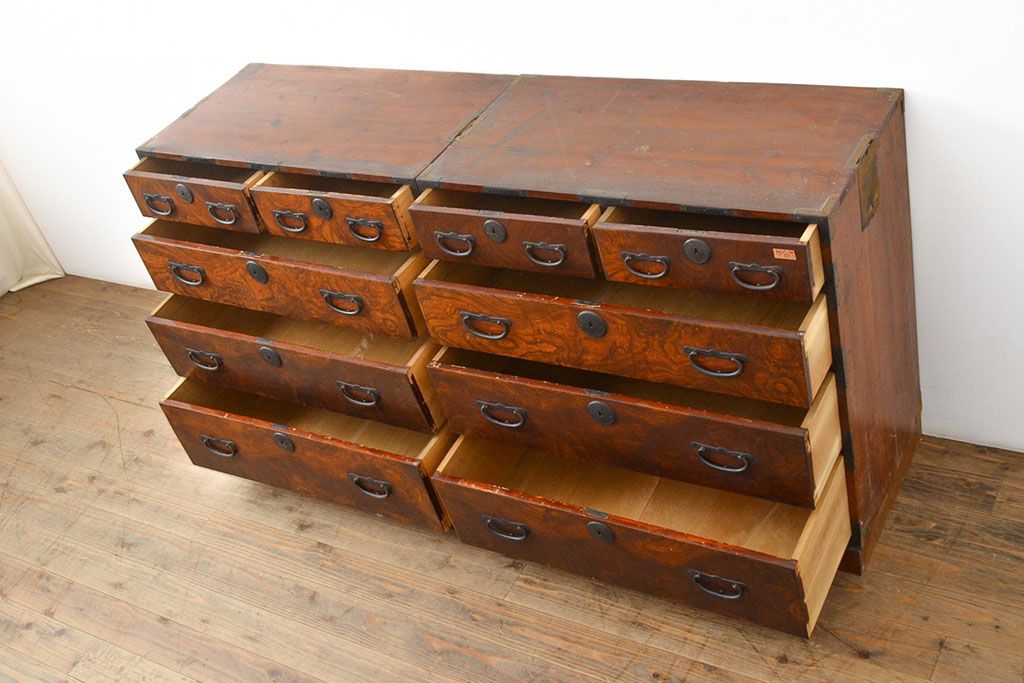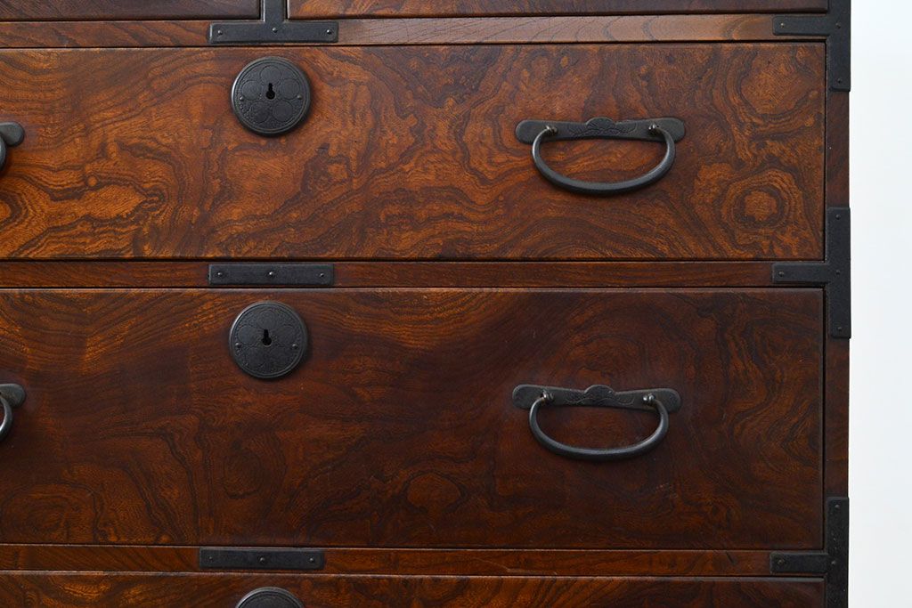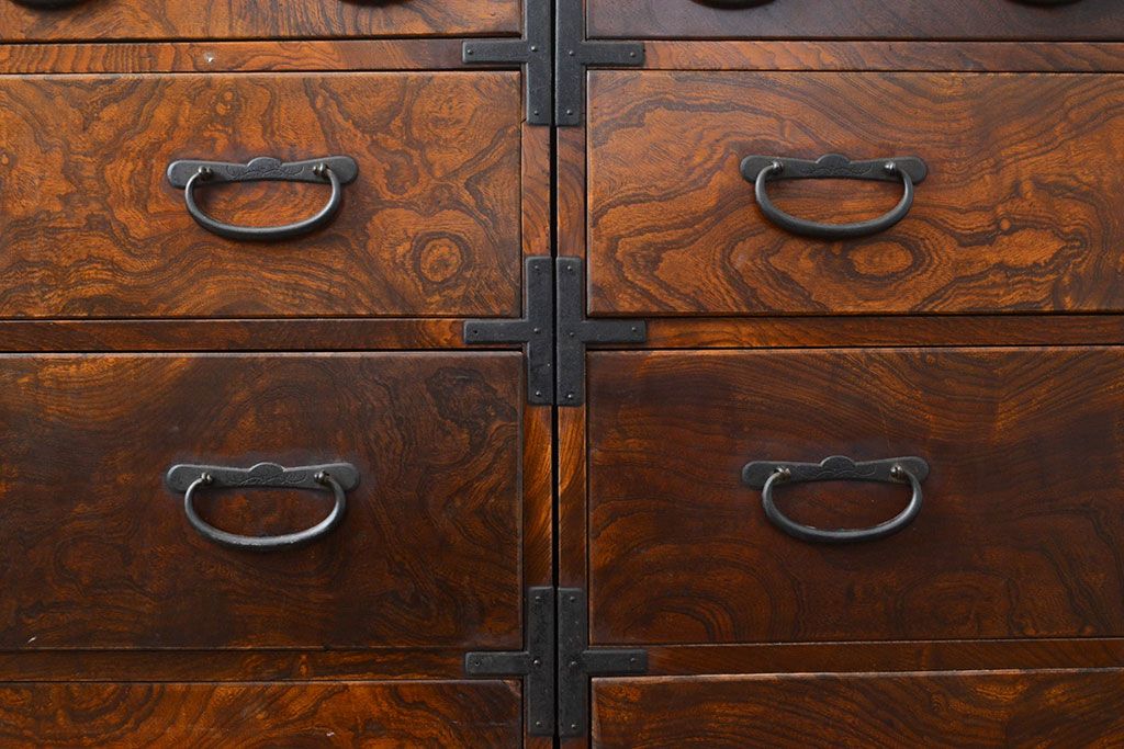 民芸家具 > 前面ケヤキ材 上品な金具が玉杢を引き立てる合わせ一間仙台箪笥(夫婦箪笥、衣装タンス、引き出し、チェスト)(R-050818)