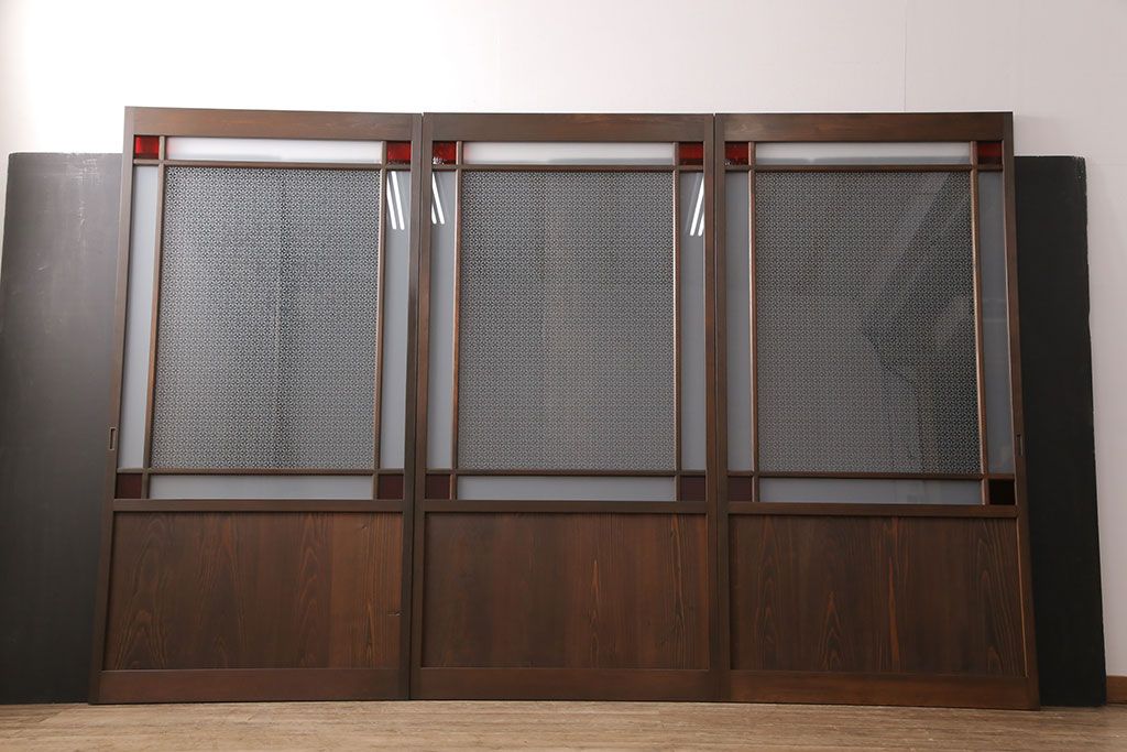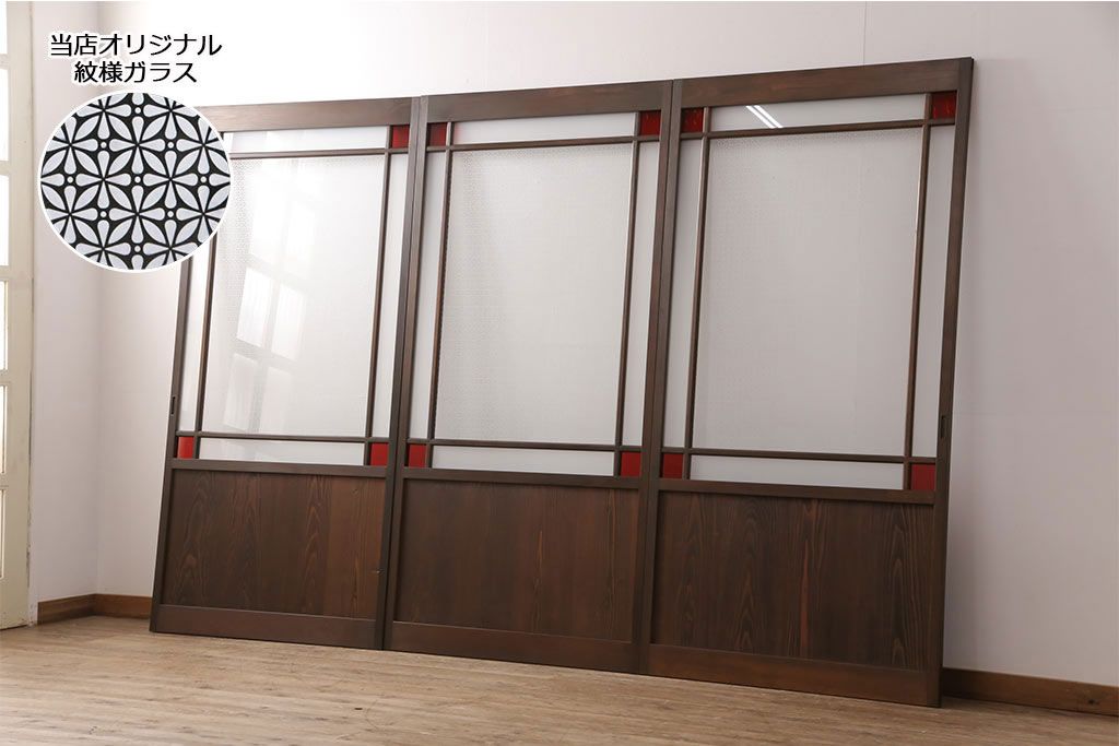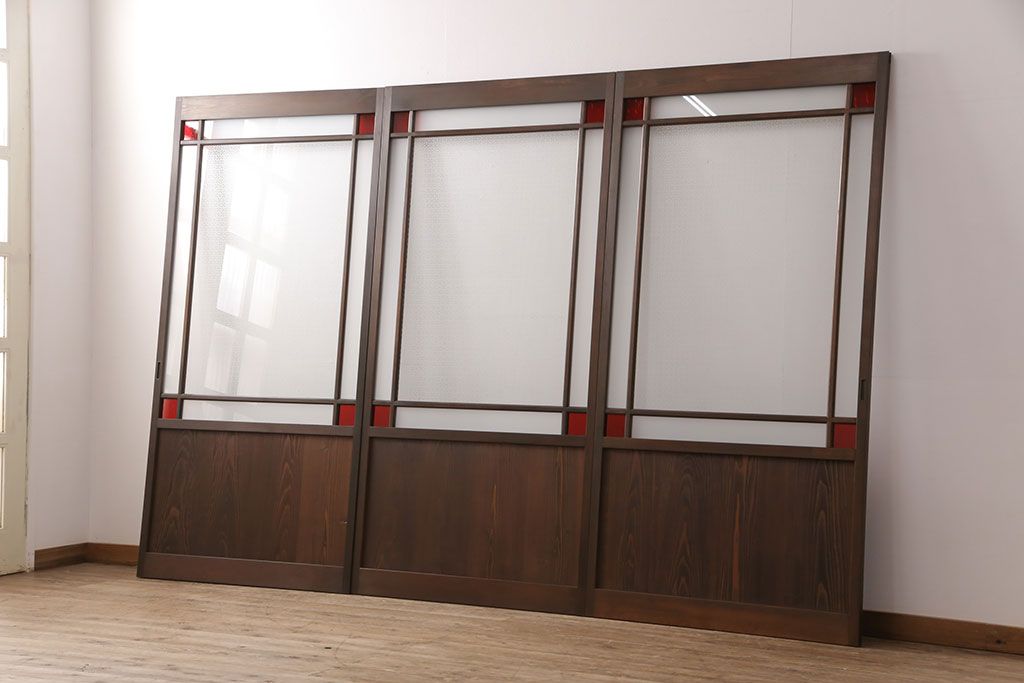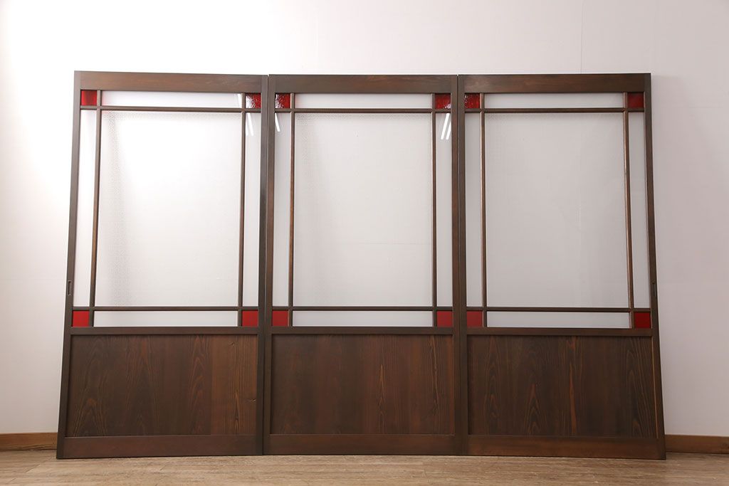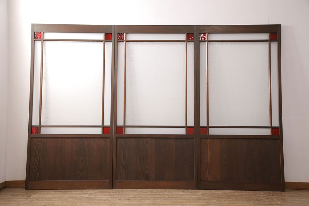 大正ロマンなガラス戸3枚を新規製作!色ガラス・花菱ガラス、すりガラスを組み入れ、吊り金具用の加工。引き手の取り付け。濃い茶色で着色し仕上げ。(引き戸、建具)