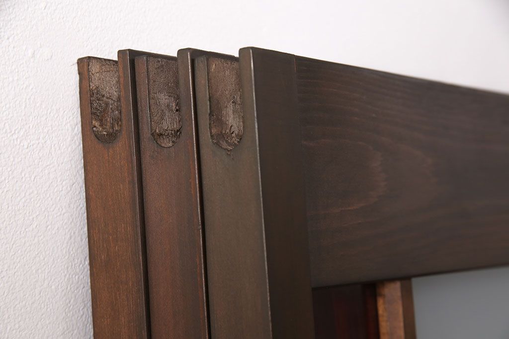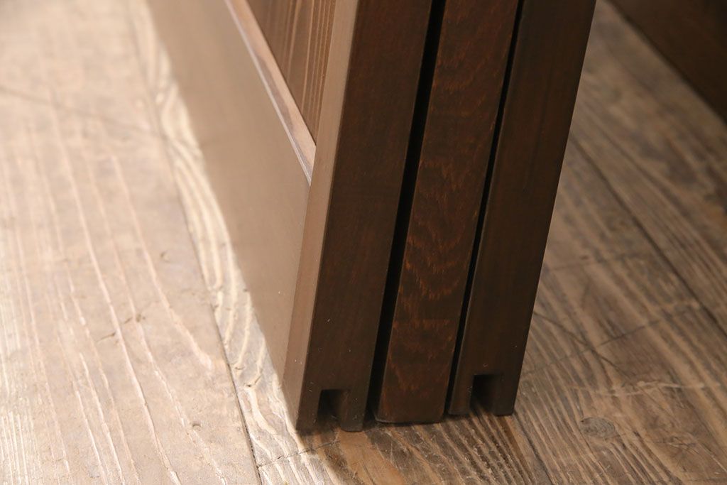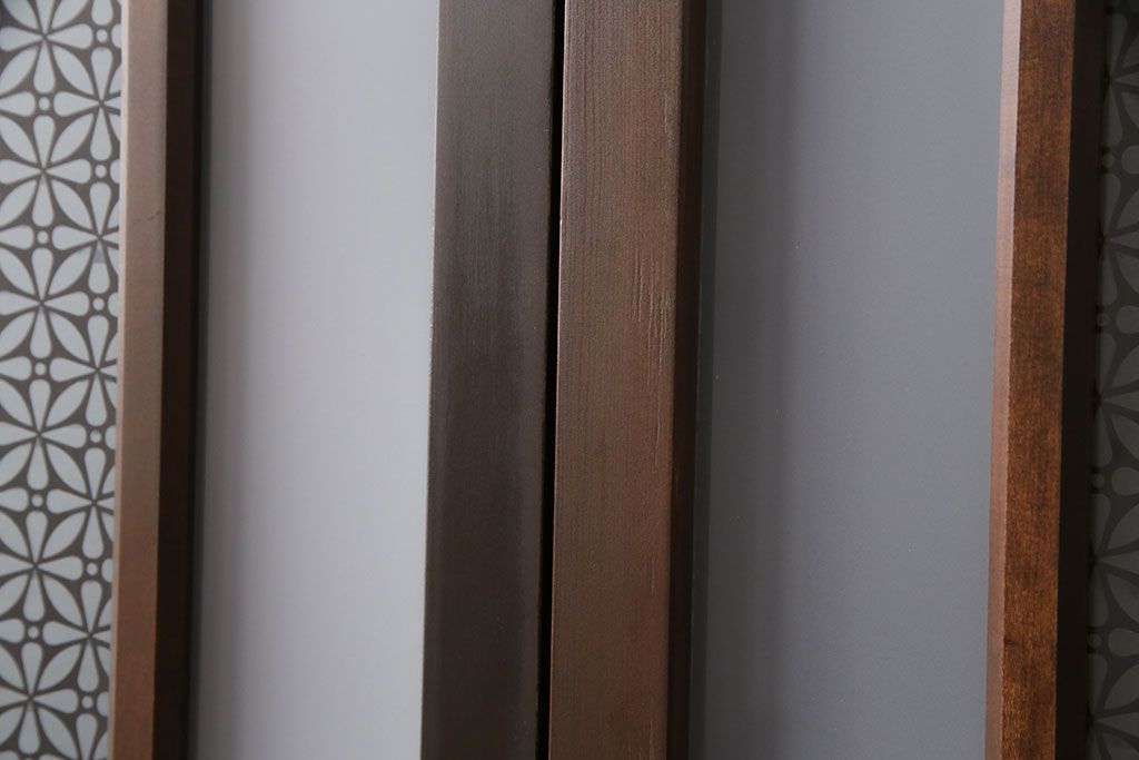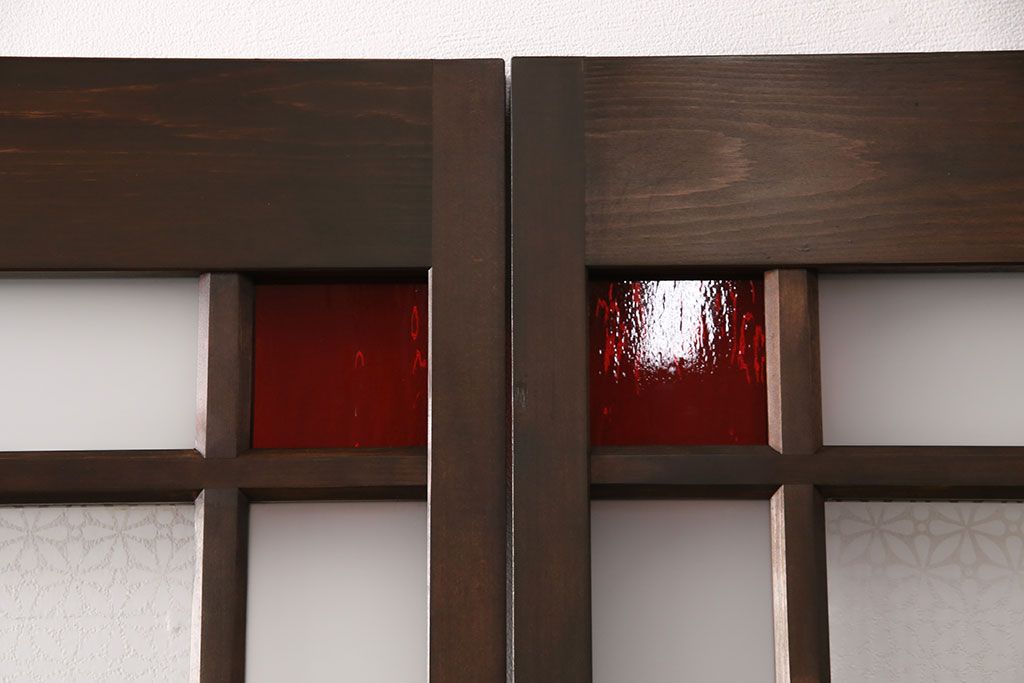 フルオーダー家具実績 > 大正ロマンなガラス戸3枚を新規製作!色ガラス・花菱ガラス、すりガラスを組み入れ、吊り金具用の加工。引き手の取り付け。濃い茶色で着色し仕上げ。(引き戸、建具)