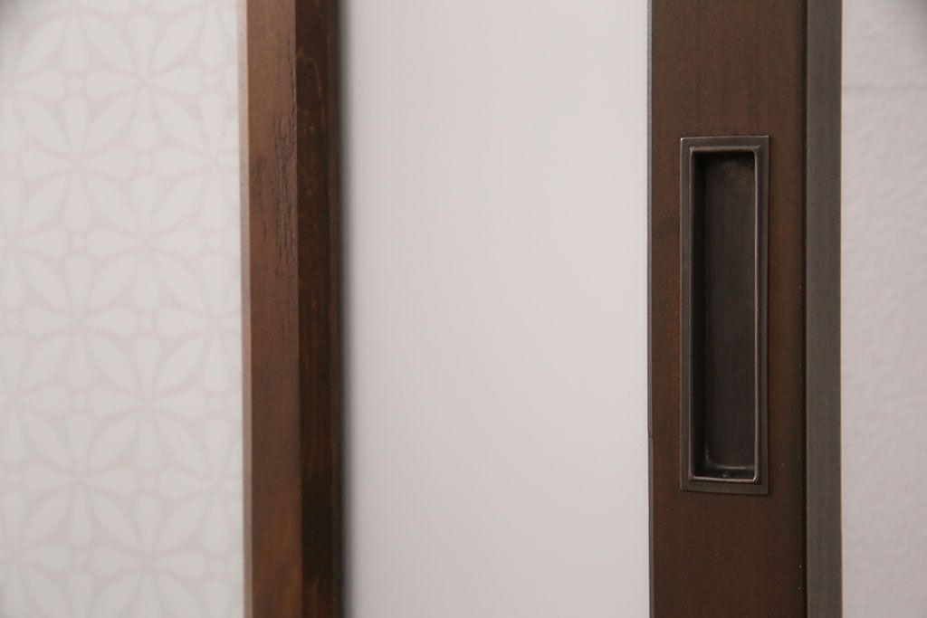 ドア・建具> 引き戸 > 大正ロマンなガラス戸3枚を新規製作!色ガラス・花菱ガラス、すりガラスを組み入れ、吊り金具用の加工。引き手の取り付け。濃い茶色で着色し仕上げ。(引き戸、建具)
