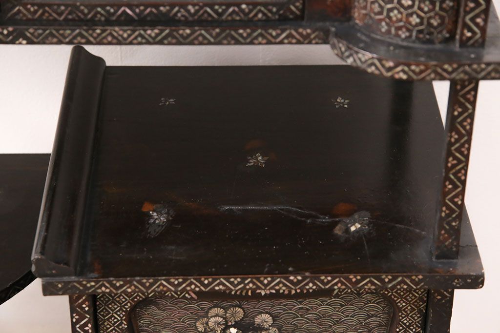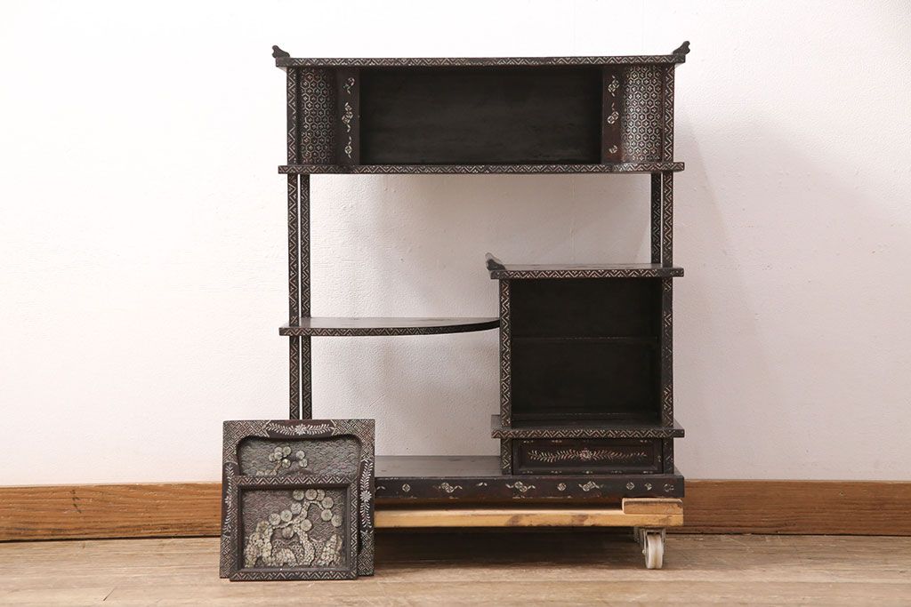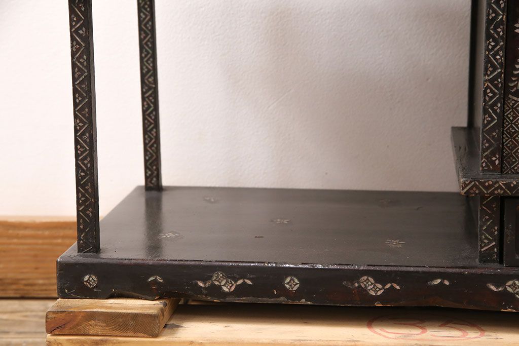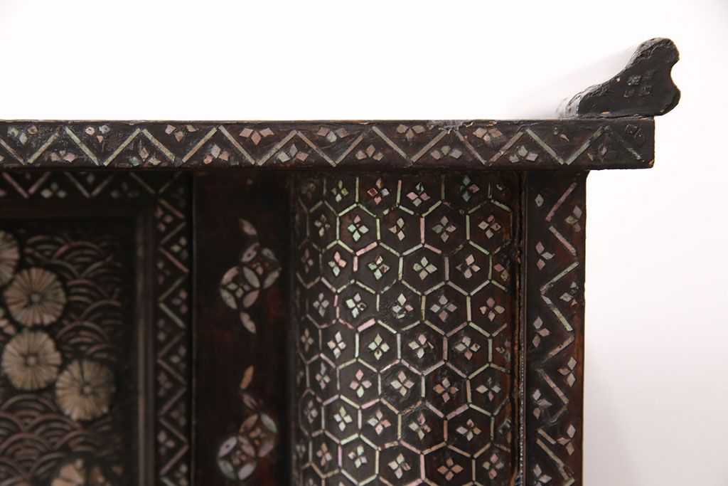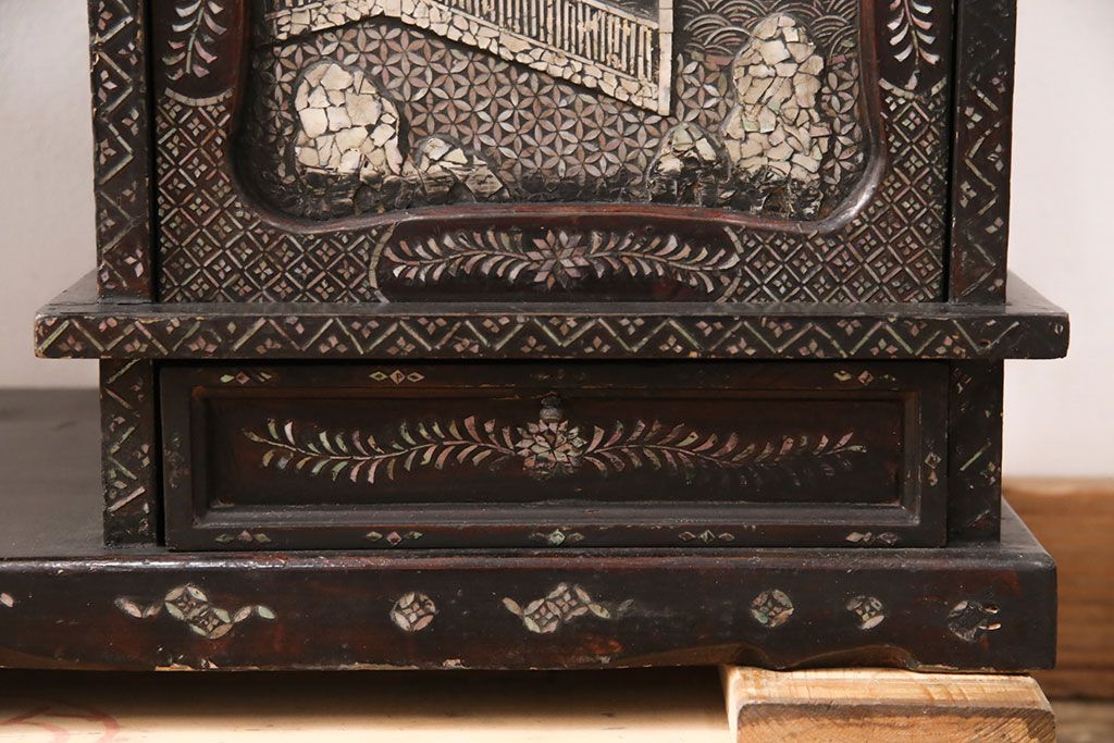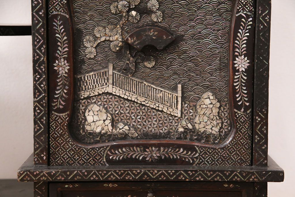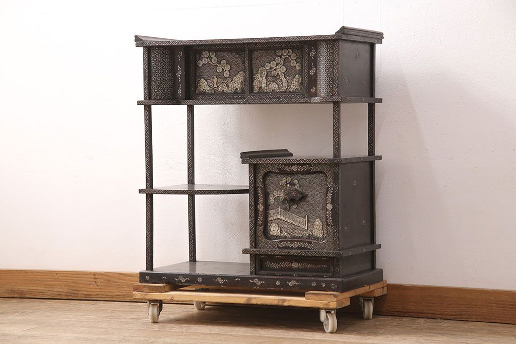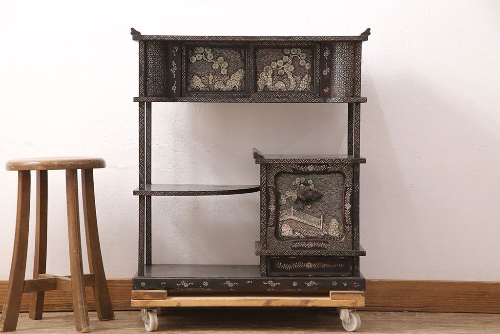 和箪笥> 茶箪笥・茶棚 > 【簡易リペア限定品】和製アンティーク 時代物 螺鈿細工で描かれた細かな絵柄が美しい飾り棚(茶棚、収納棚、戸棚)(R-050893)