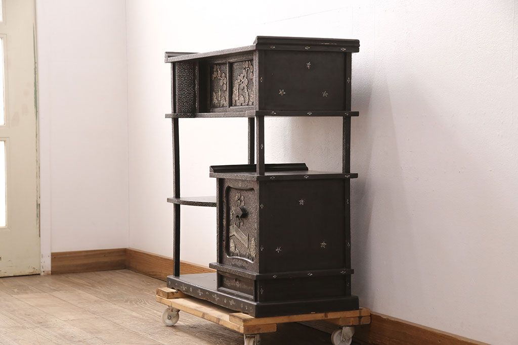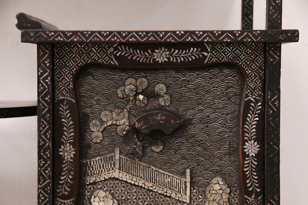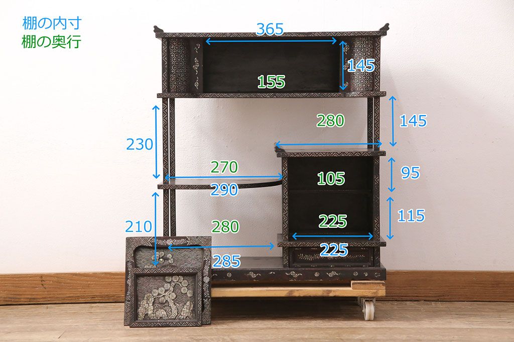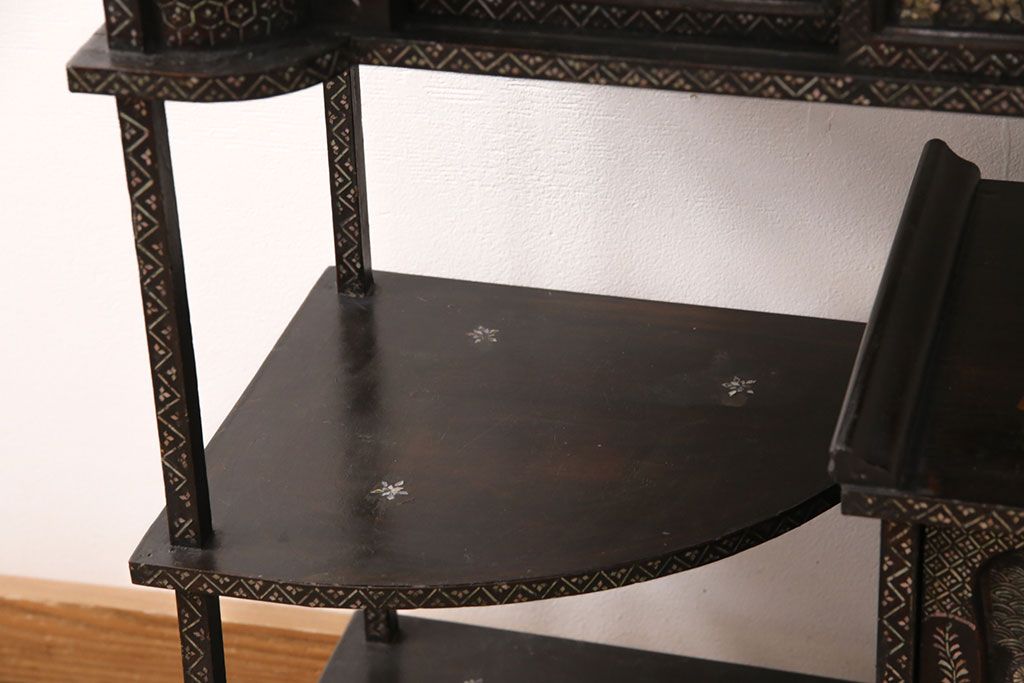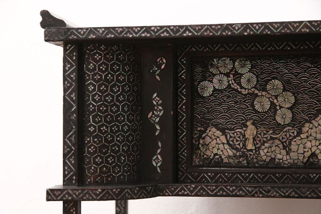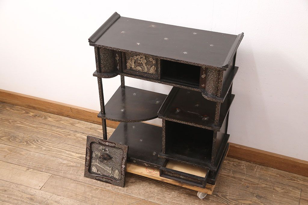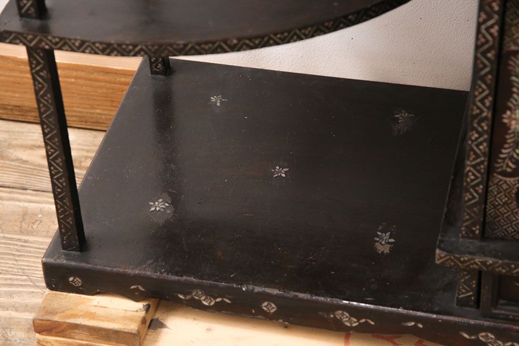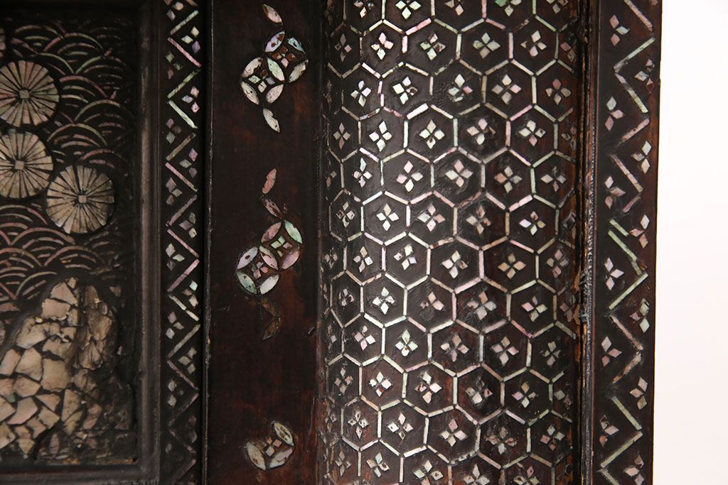 和箪笥> 茶箪笥・茶棚 > 【簡易リペア限定品】和製アンティーク 時代物 螺鈿細工で描かれた細かな絵柄が美しい飾り棚(茶棚、収納棚、戸棚)(R-050893)