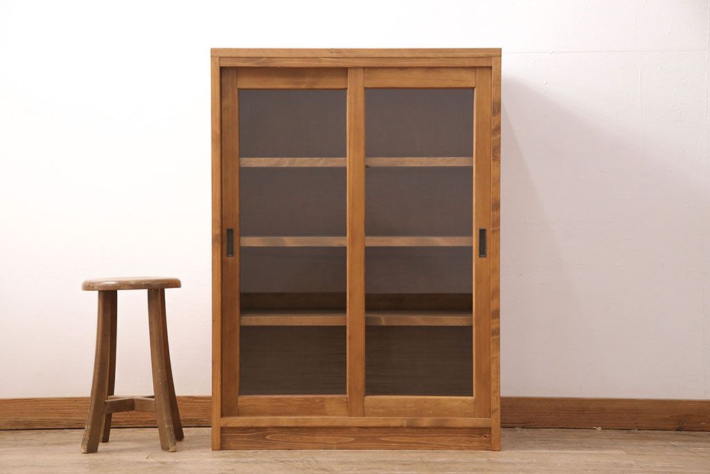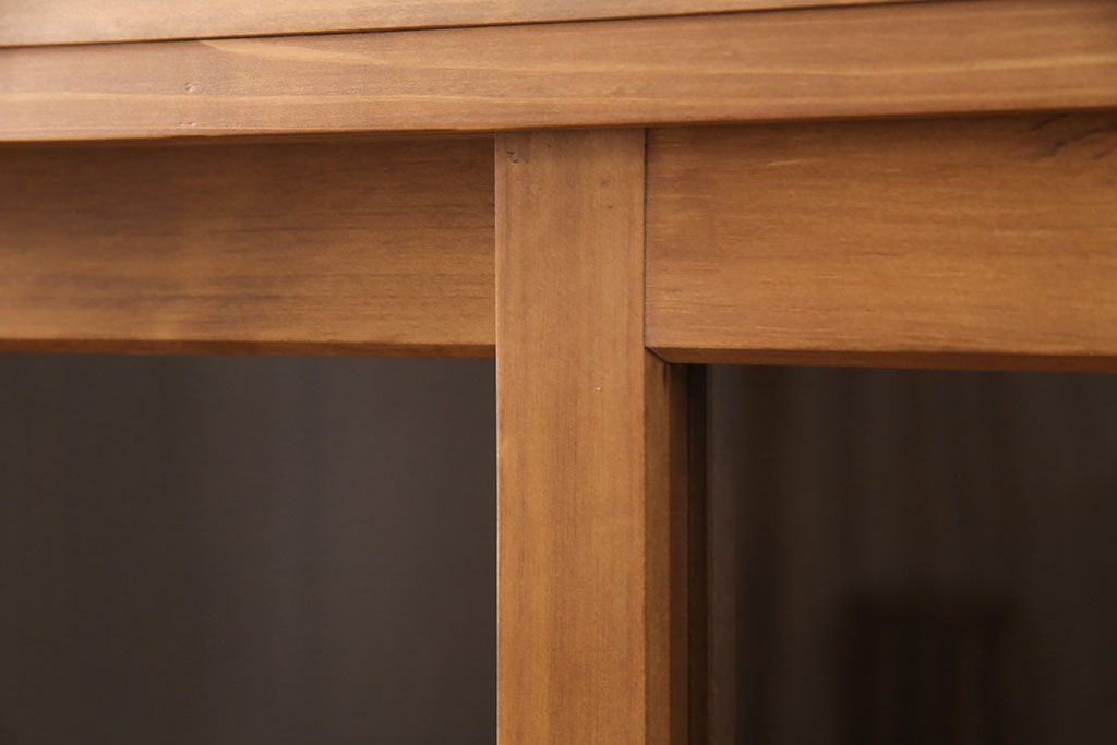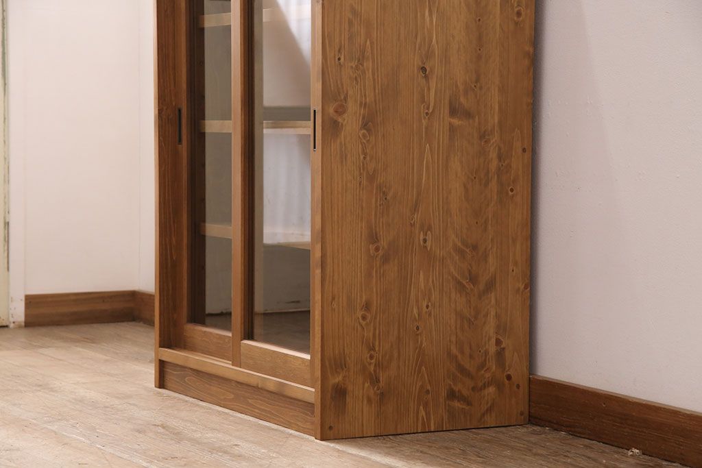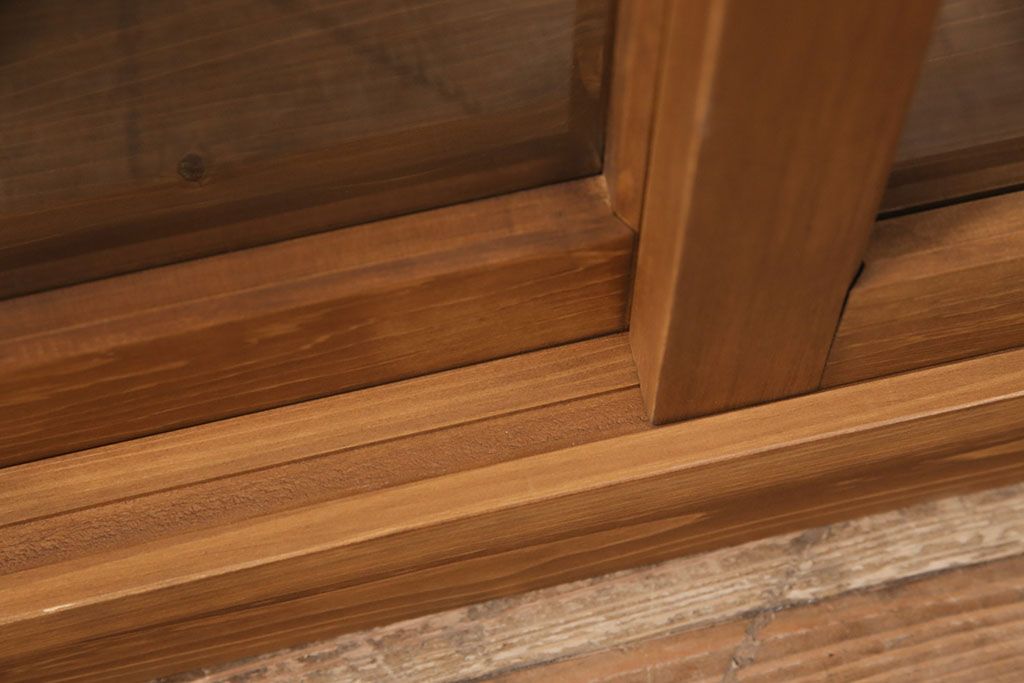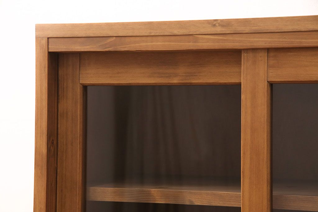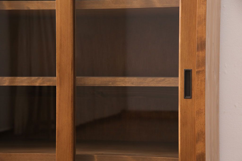 キャビネット・戸棚> 食器棚・カップボード > キッチン収納棚を新規製作!建具はクリアガラス入り引き違い戸。可動式の棚板を設置。真鍮製の金具を取り付け。明るい茶色で着色し仕上げ。(戸棚、食器棚、キャビネット)