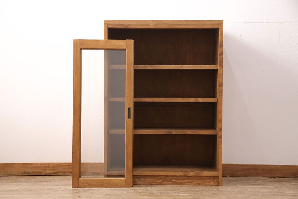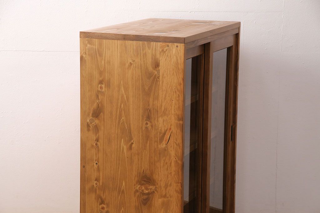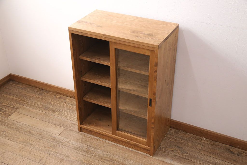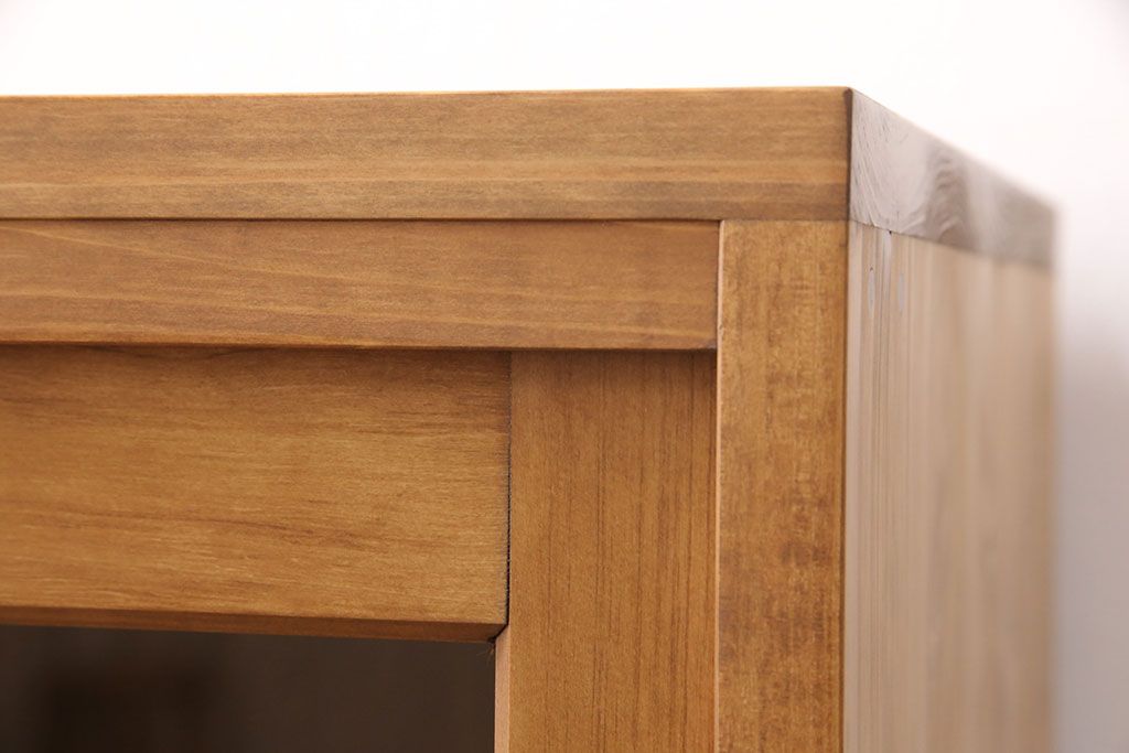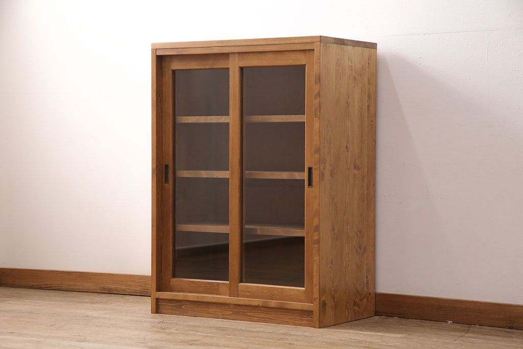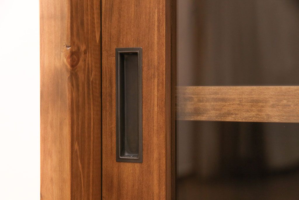 キャビネット・戸棚> 食器棚・カップボード > キッチン収納棚を新規製作!建具はクリアガラス入り引き違い戸。可動式の棚板を設置。真鍮製の金具を取り付け。明るい茶色で着色し仕上げ。(戸棚、食器棚、キャビネット)