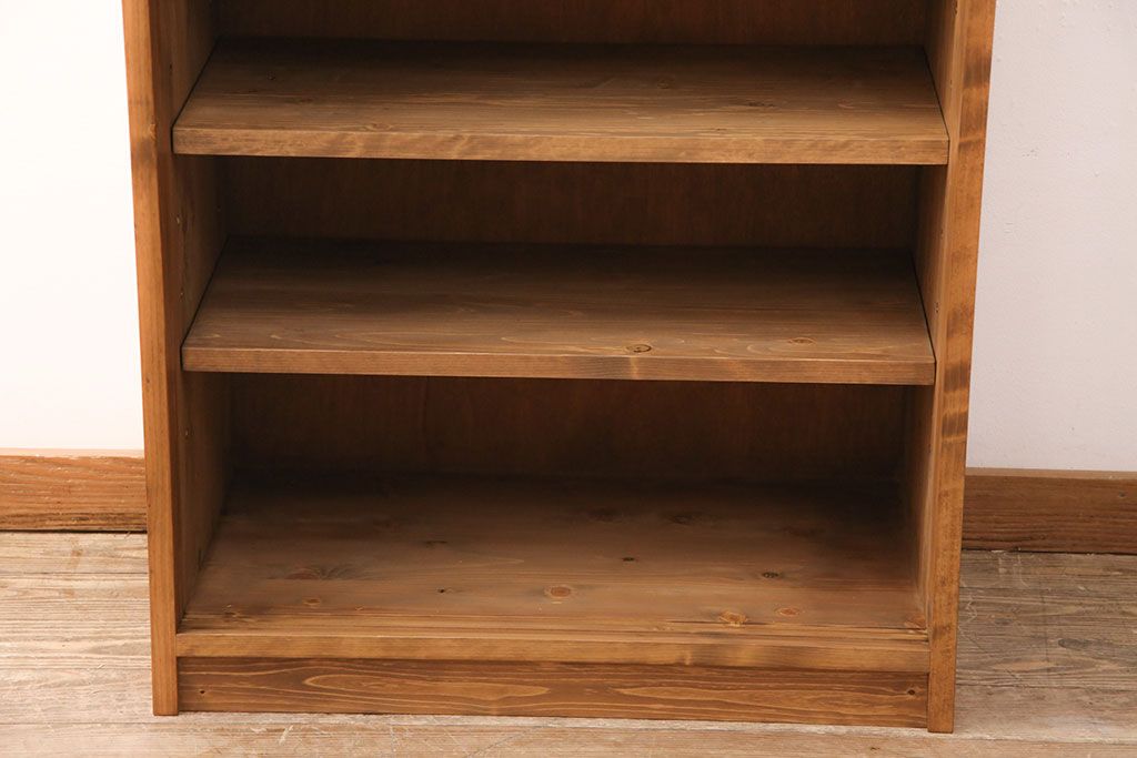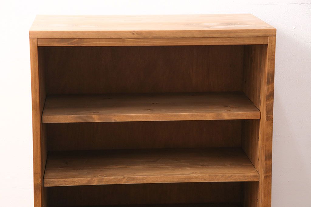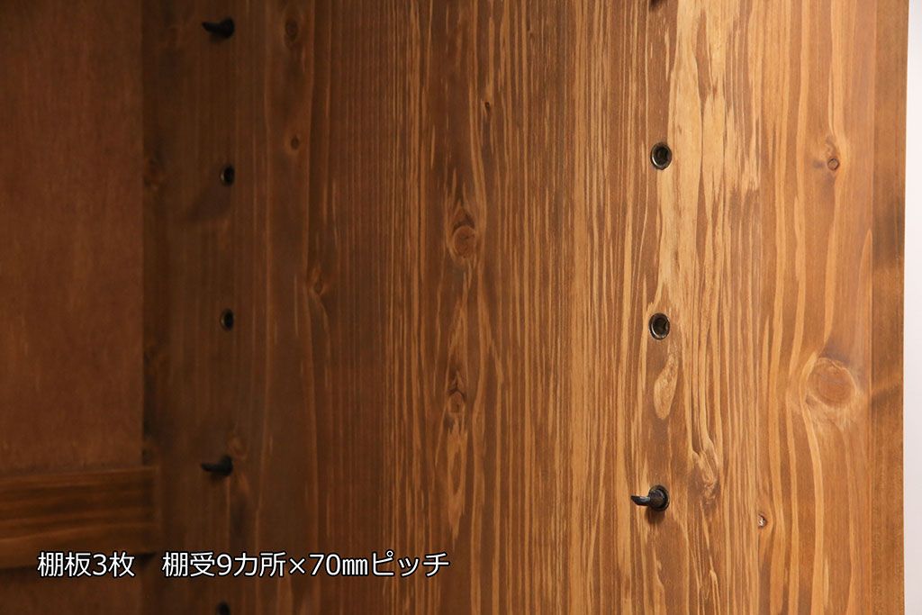 棚板は取り外しできます。棚板は3枚あります。棚受けは9ヶ所、70mmピッチで調整できます。棚幅サイズのものが1枚の作りです。