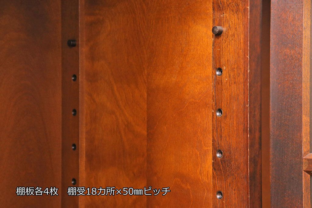 棚板は取り外しできます。棚板は各4枚あります。棚受けは18ヶ所、50mmピッチで調整できます。棚幅サイズのものが1枚の作りです。