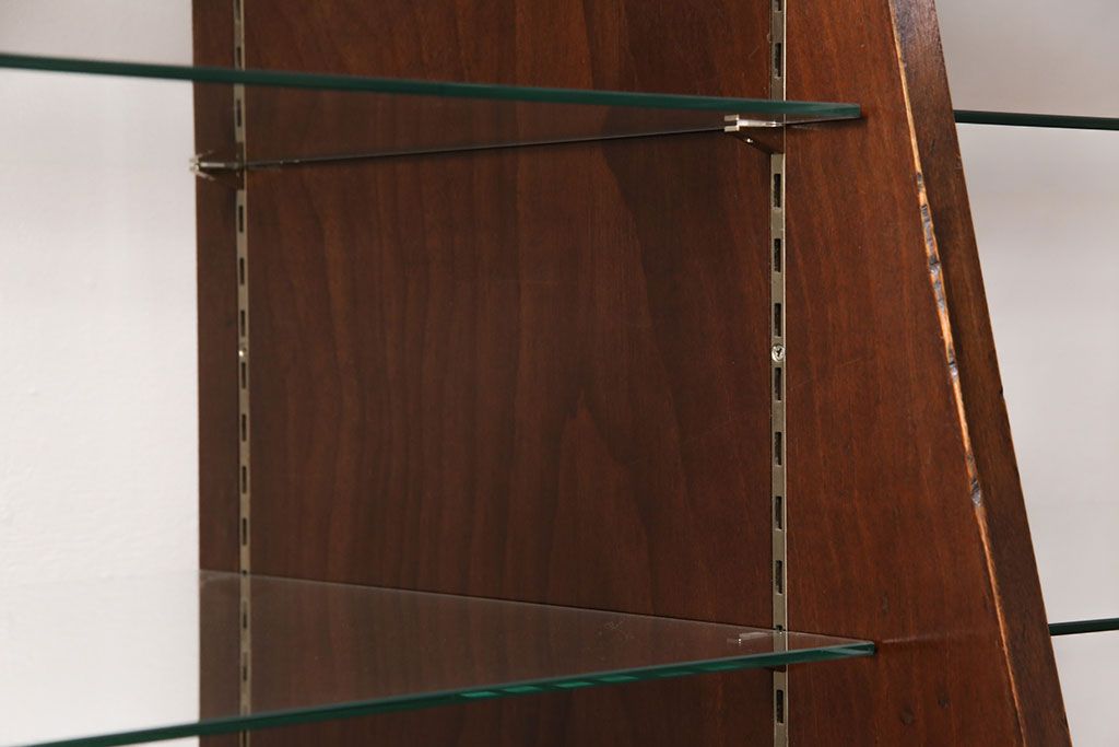 棚板は取り外しできます。棚板は4枚あります。棚受けは24ヶ所、25mmピッチで調整できます。棚幅サイズのものが1枚の作りです。