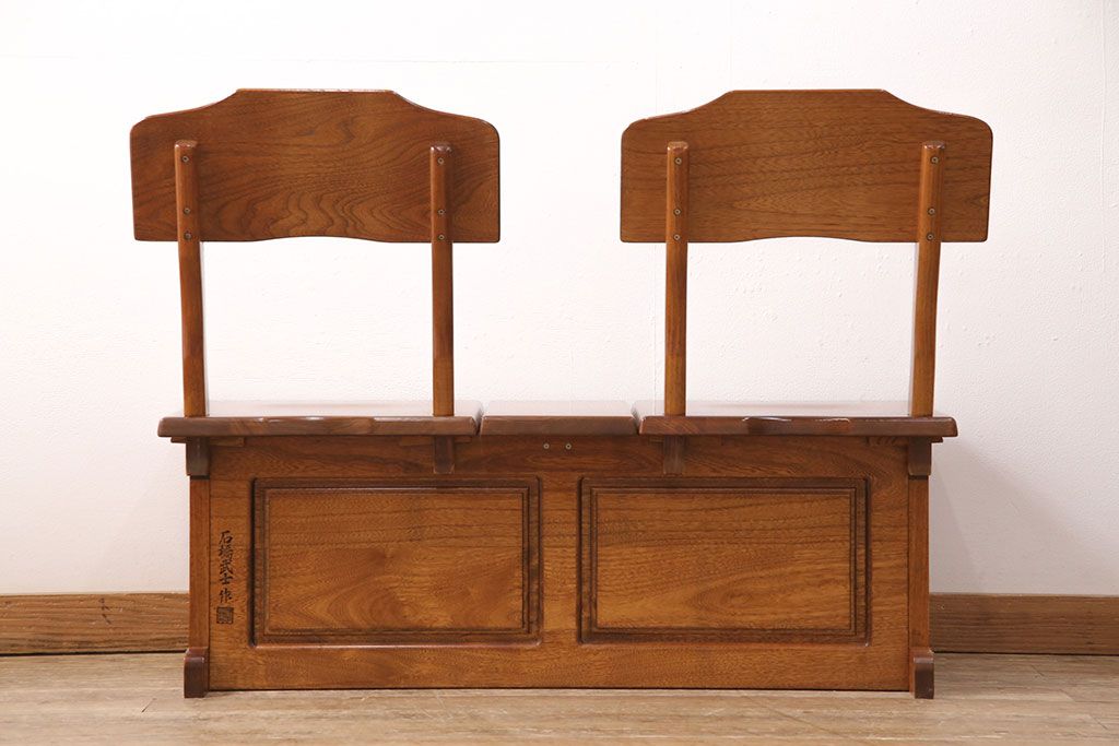 中古 伝統木芸士 石橋武士作 ケヤキ材 上質な和の空間づくりに活躍する2人掛けベンチ(チェア・椅子)(定価16万5千円)(R-050972)