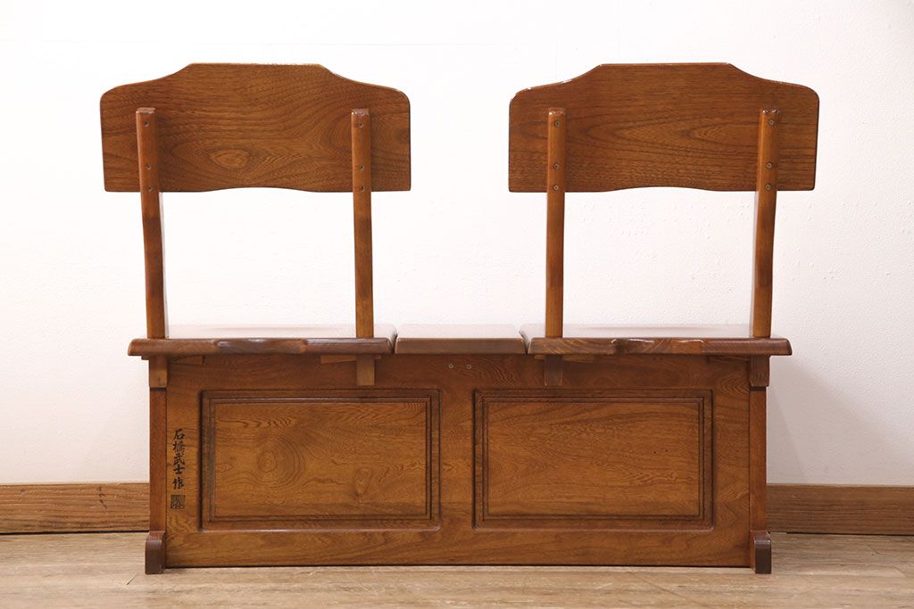 中古 伝統木芸士 石橋武士作 ケヤキ材 上質な和の空間づくりに活躍する2人掛けベンチ(チェア・椅子)(定価16万5千円)(R-050973)