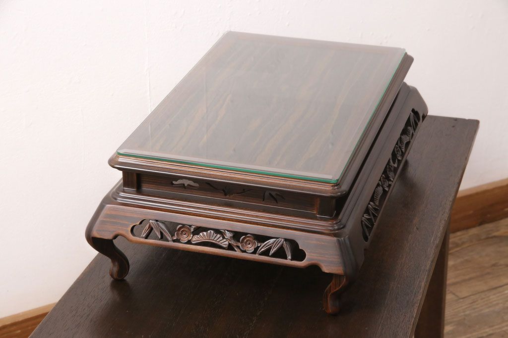 中古 美品 唐木 黒檀材 松や梅の彫刻と美しい杢目が上品さを漂わせる花台(飾り台、ディスプレイ台)(R-050958)
