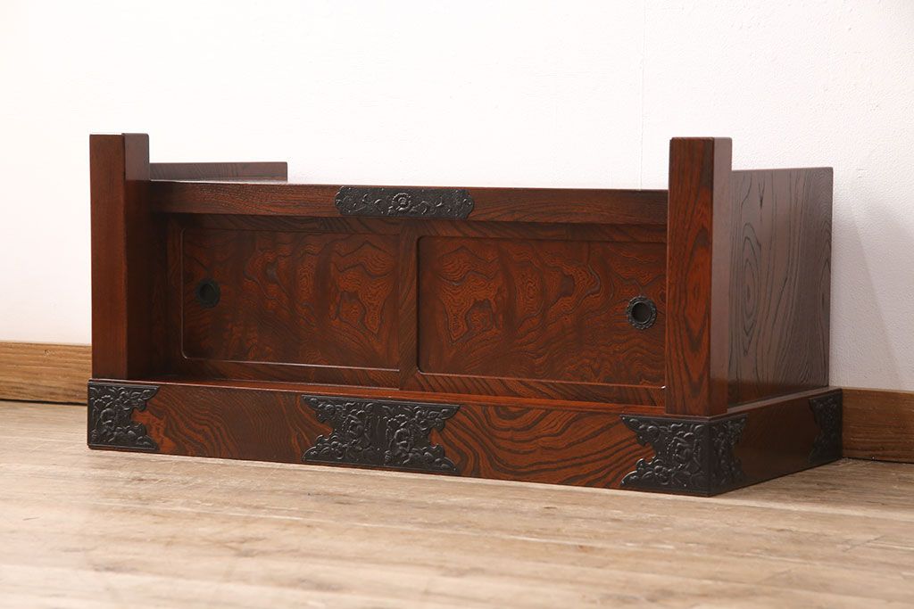 中古 美品 国産民芸家具 黒い金具と力強い杢目が堂々とした存在感を放つ置き床(ローボード、テレビ台)(R-050954)です。