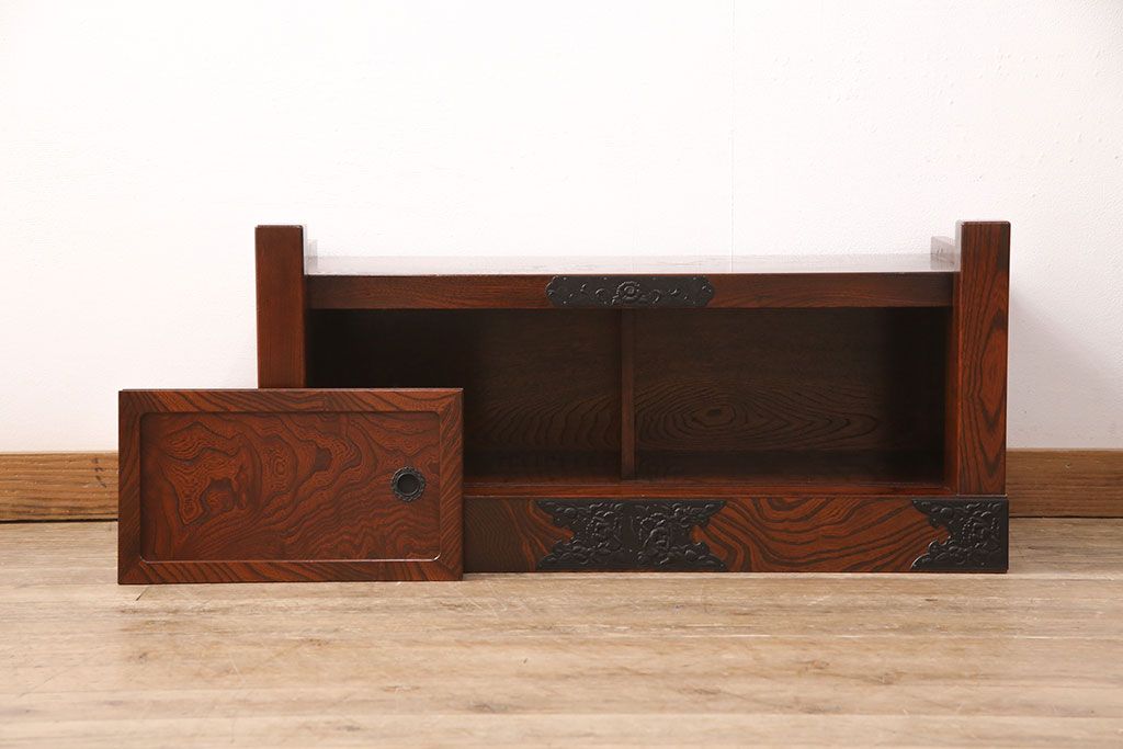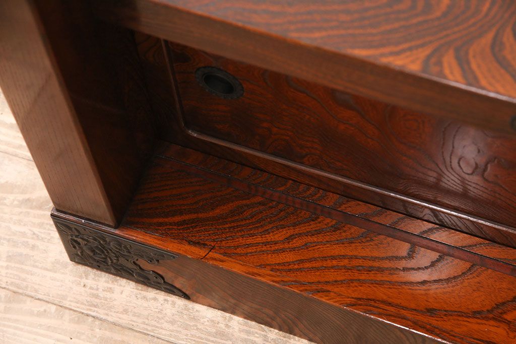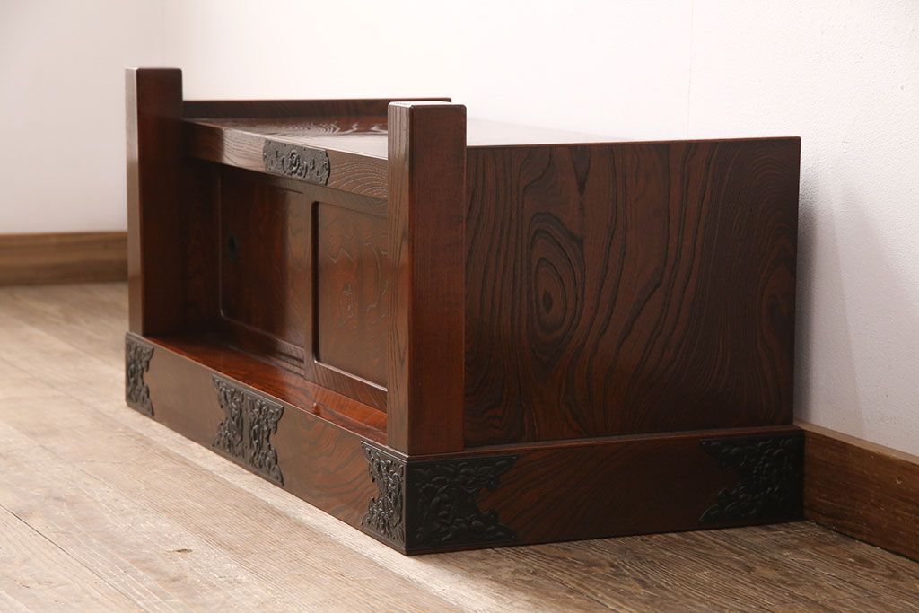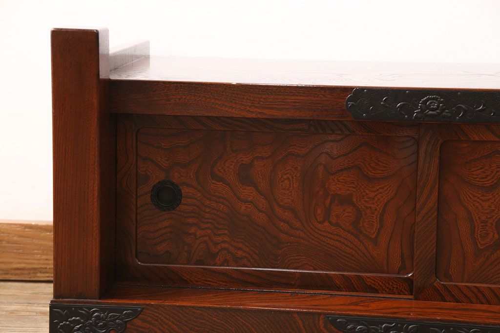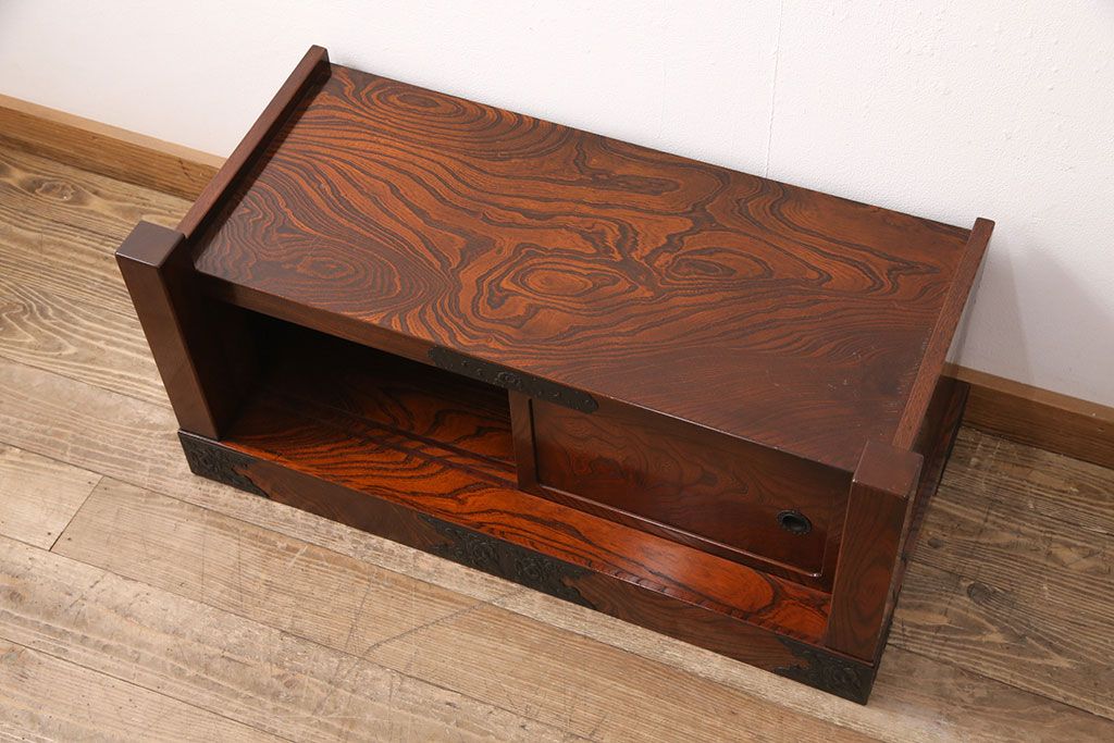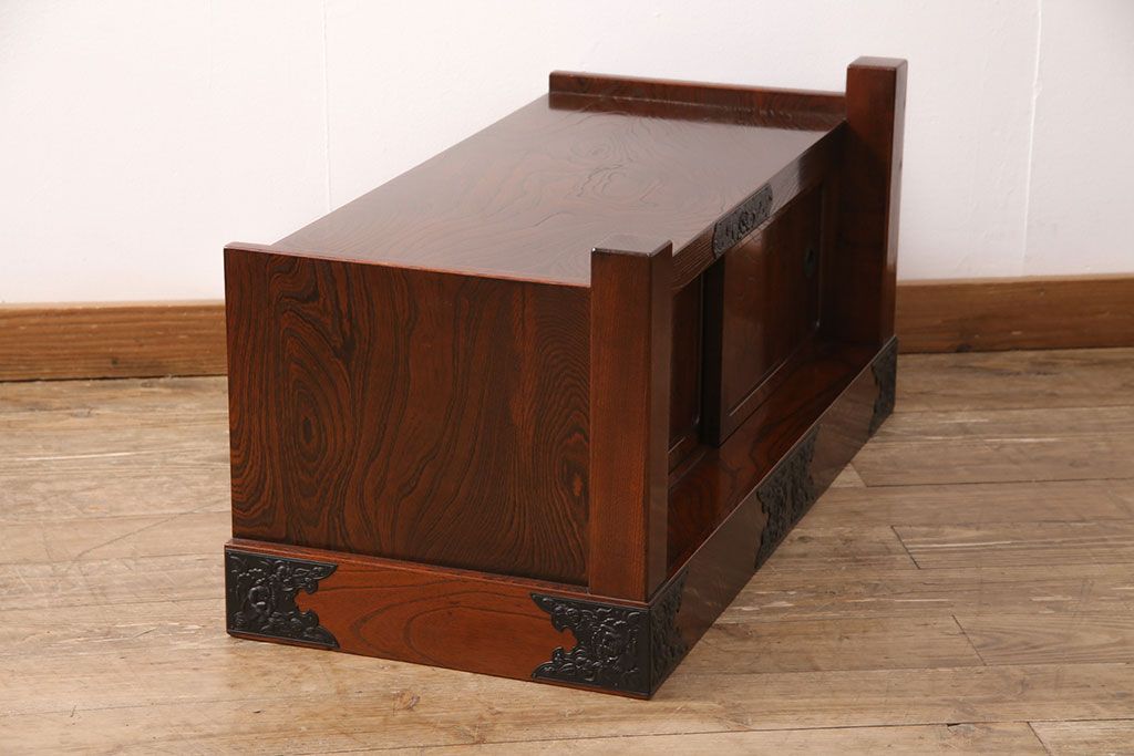 中古 美品 国産民芸家具 黒い金具と力強い杢目が堂々とした存在感を放つ置き床(ローボード、テレビ台)(R-050954)