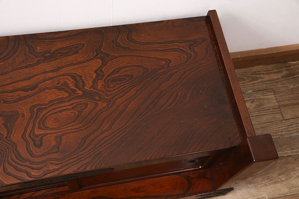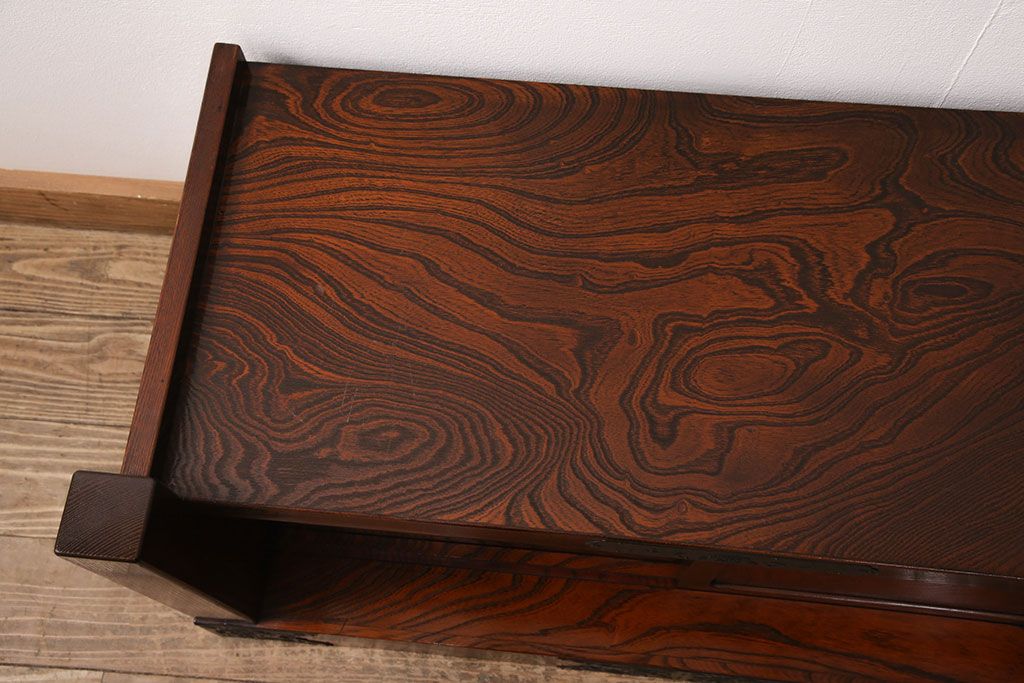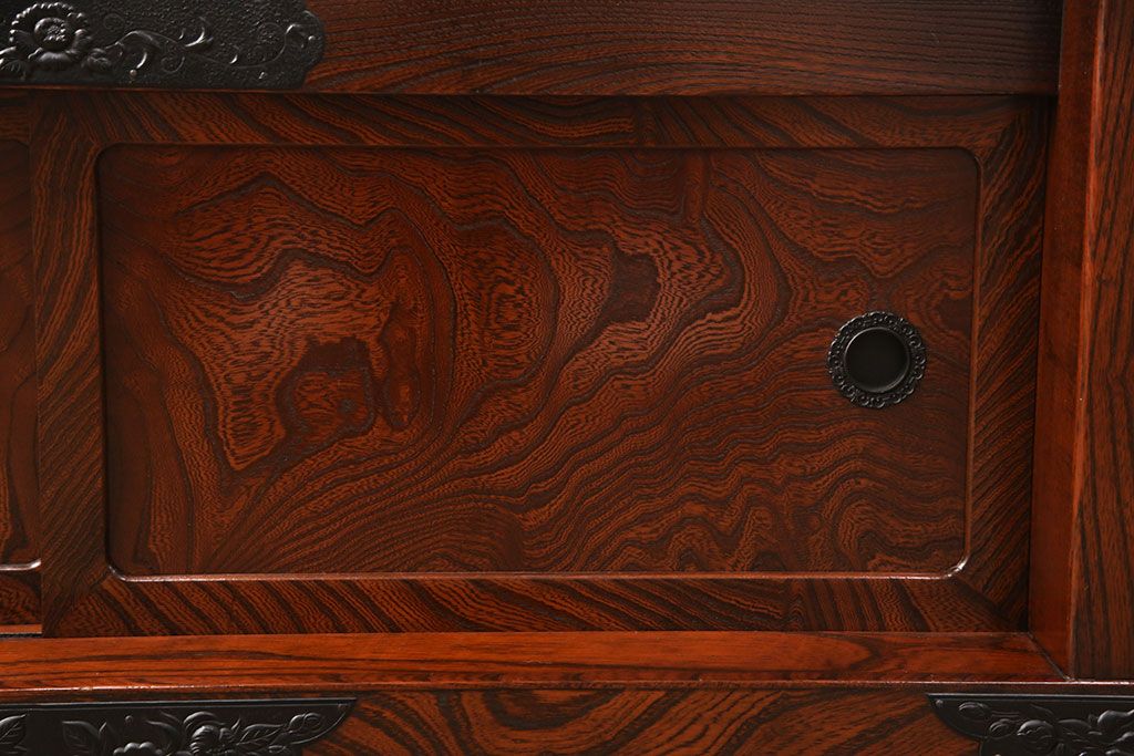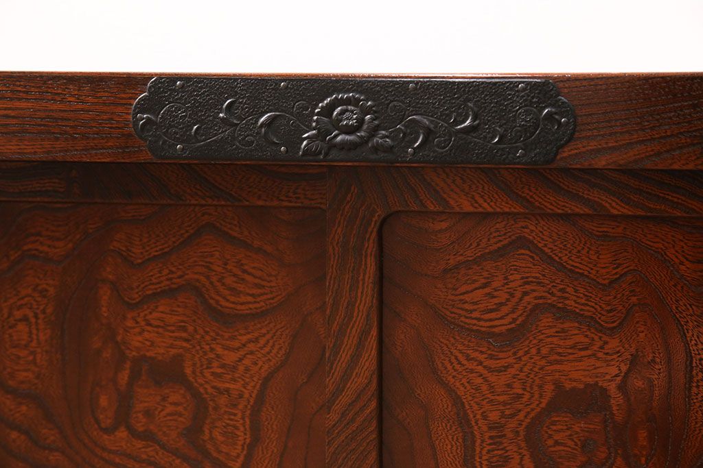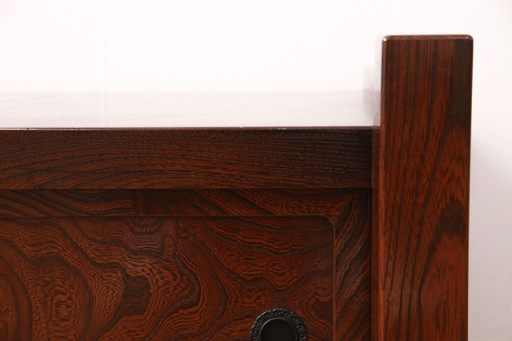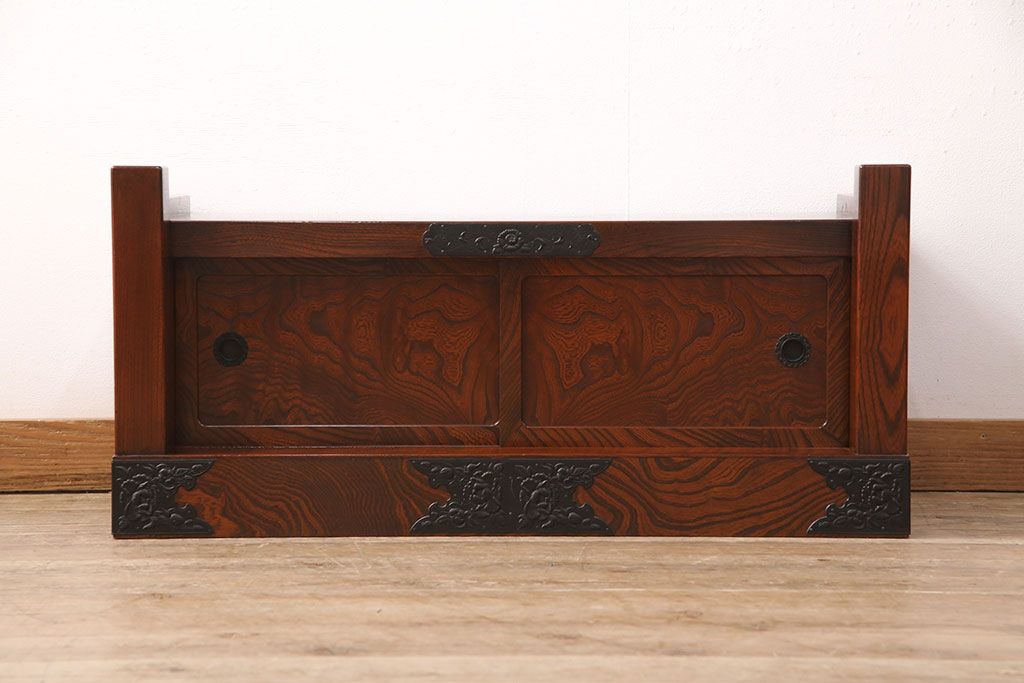 中古 美品 国産民芸家具 黒い金具と力強い杢目が堂々とした存在感を放つ置き床(ローボード、テレビ台)(R-050954)