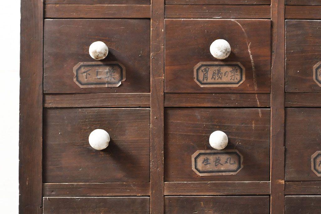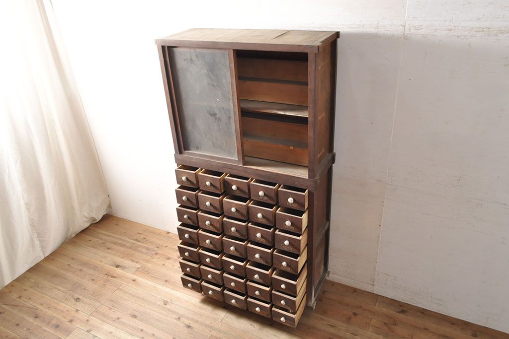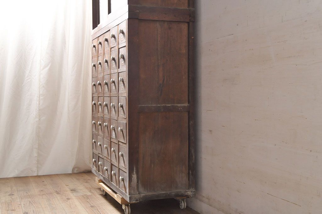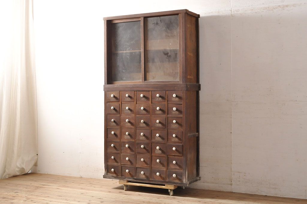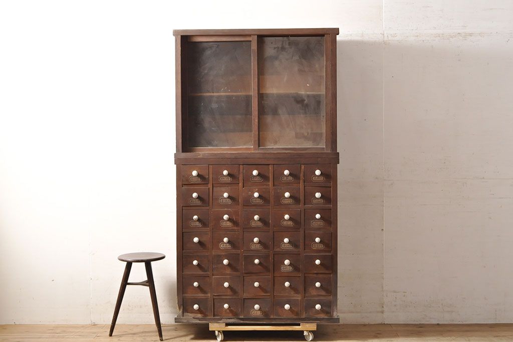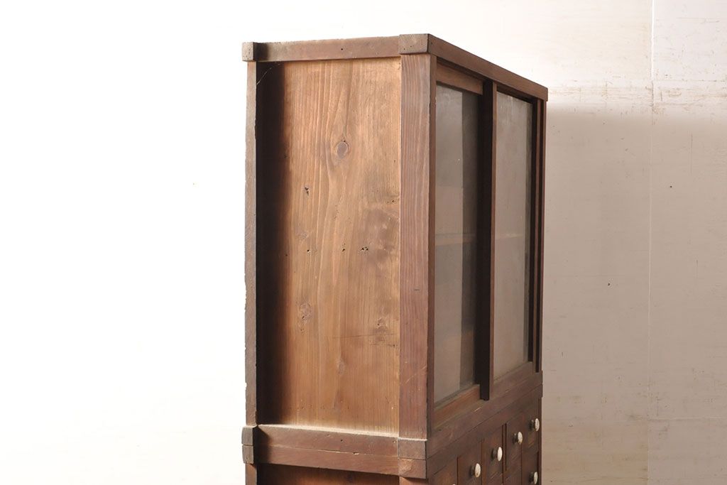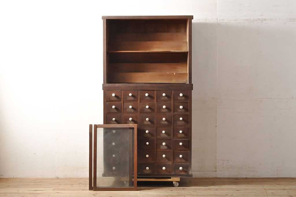 和箪笥> 薬箪笥 > 和製アンティーク 杉材 引き出し35杯 ガラス戸棚付きの薬箪笥(重ね箪笥、引き出し、チェスト、ドロワー、キャビネット)(R-050936)