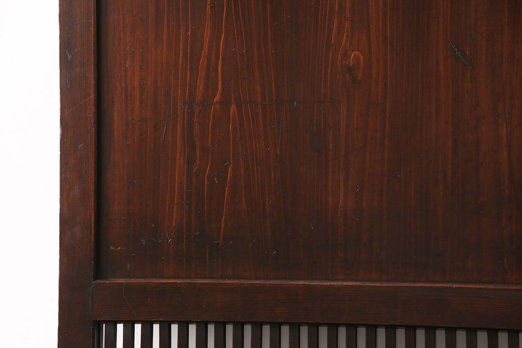ドア・建具> 板戸・帯戸 > 大正期の格子帯戸をリペア&カスタム!設置場所に合わせてリサイズし、吊り戸仕様に加工。格子裏面にガラスを取り付け。濃い茶色で着色し仕上げ。(引き戸、建具)