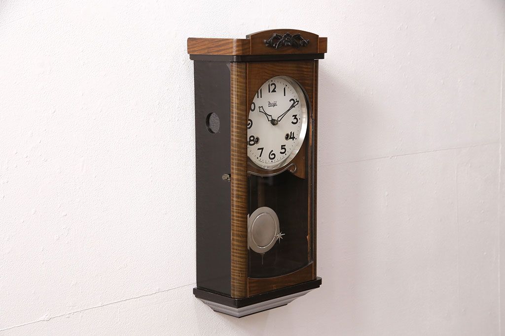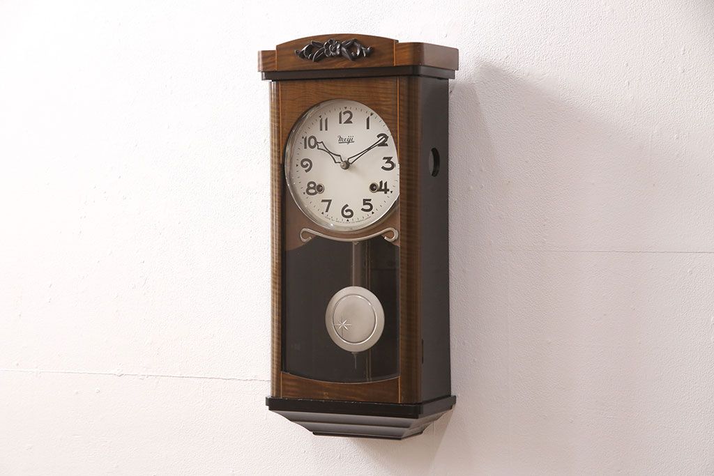 アンティーク時計 昭和中期 Meiji(明治時計社) ゼンマイ式 クラシカルな雰囲気溢れる大振りの掛け時計(振り子時計、柱時計、古時計)(R-051016)です。