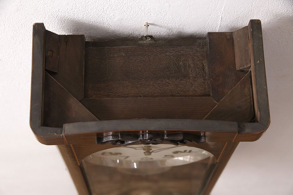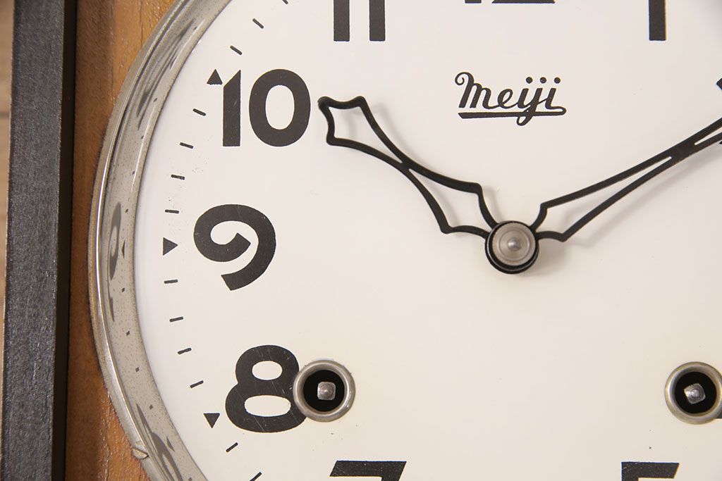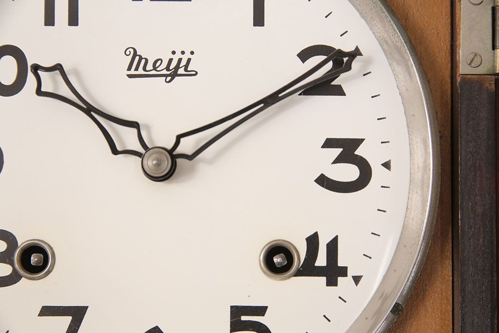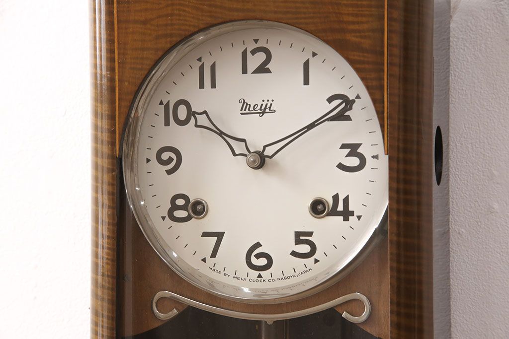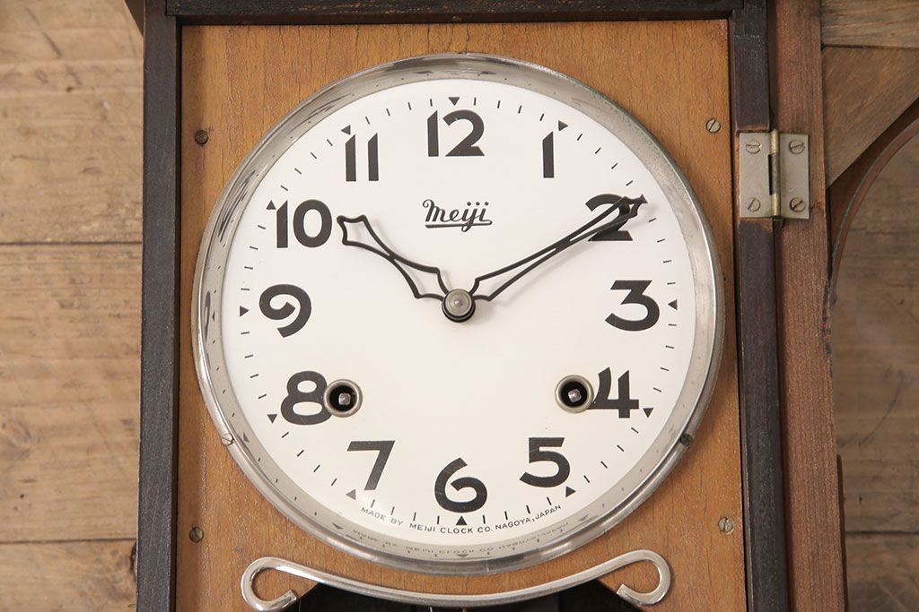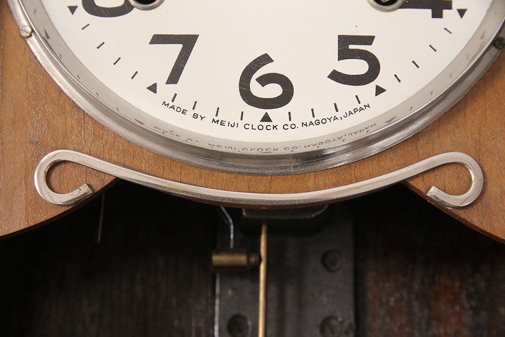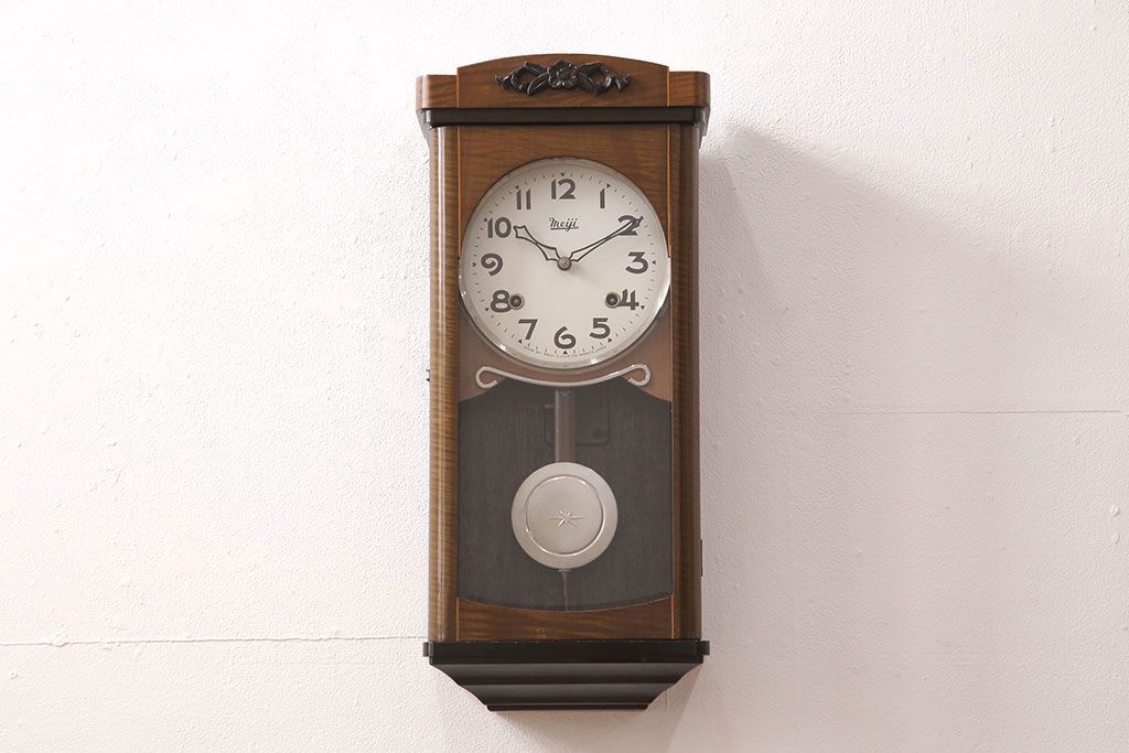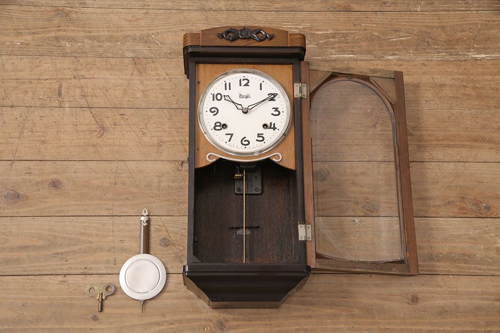 時計> 掛け時計 > アンティーク時計 昭和中期 Meiji(明治時計社) ゼンマイ式 クラシカルな雰囲気溢れる大振りの掛け時計(振り子時計、柱時計、古時計)(R-051016)