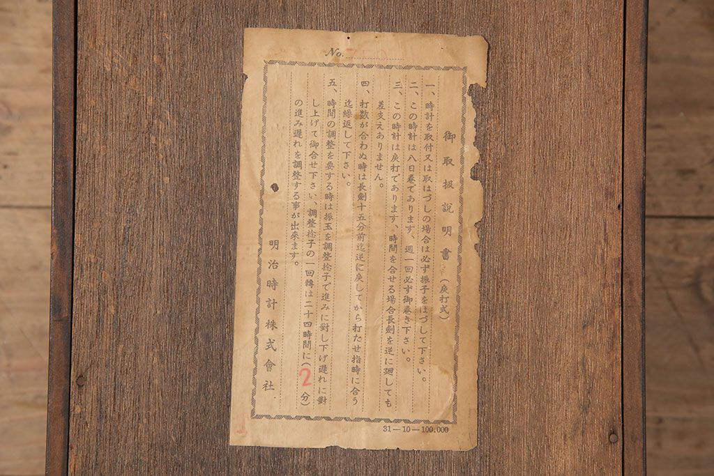 アンティーク時計 昭和中期 Meiji(明治時計社) ゼンマイ式 クラシカルな雰囲気溢れる大振りの掛け時計(振り子時計、柱時計、古時計)(R-051016)