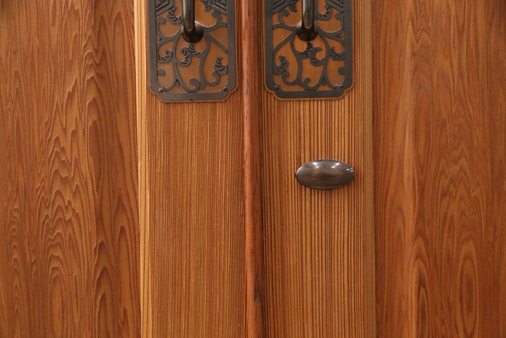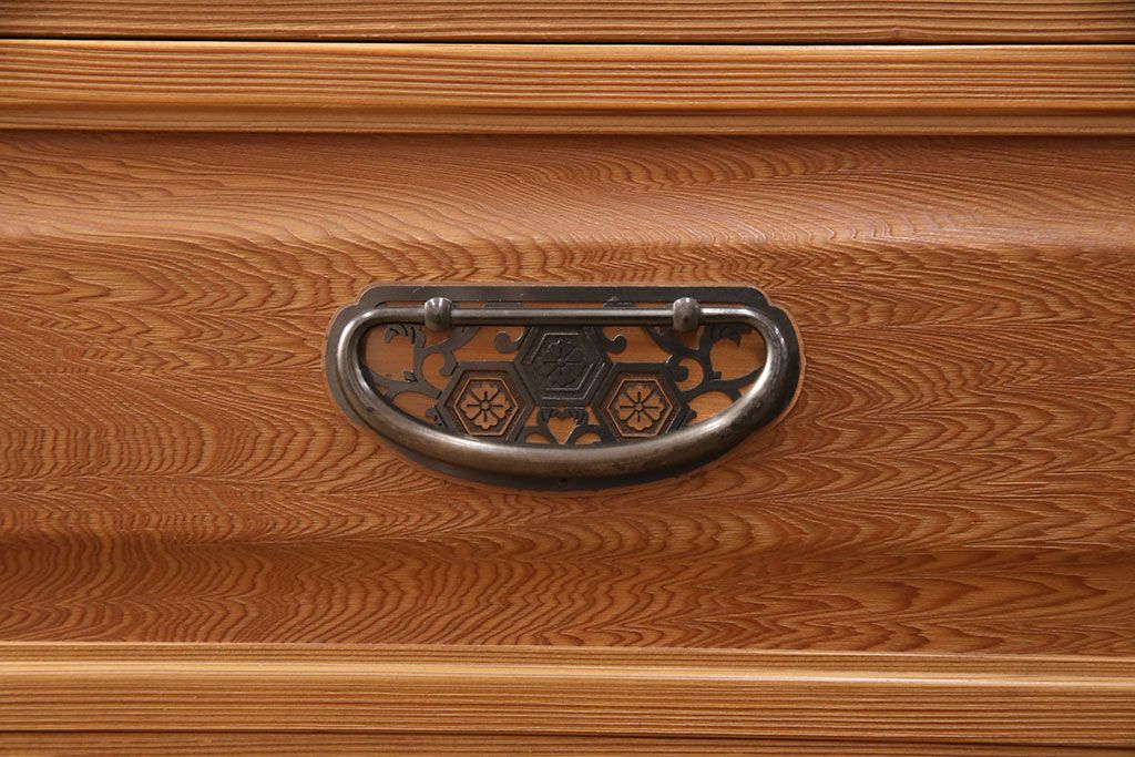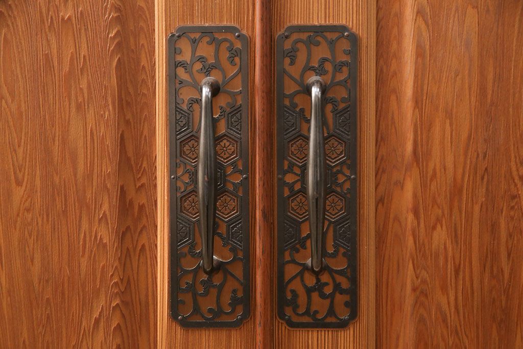 引手金具は唐草に亀甲花紋を組み合わせた意匠で、