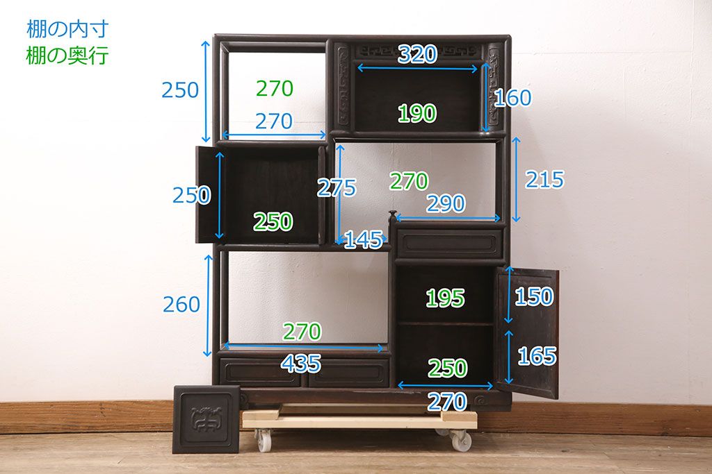 和箪笥> 茶箪笥・茶棚 > 和製アンティーク 指物家具 紫檀(シタン)無垢材 独特な模様がアジアン風な雰囲気を演出する時代飾り棚(茶棚、収納棚、戸棚)(R-051012)
